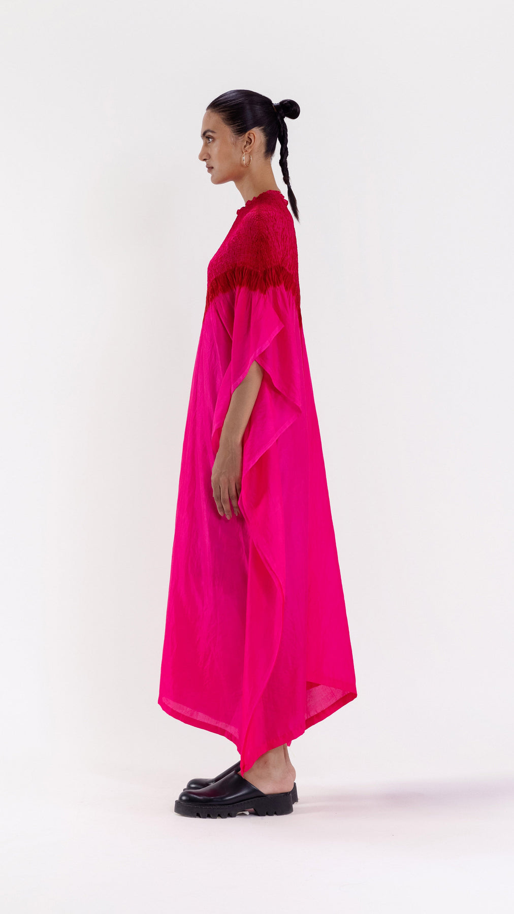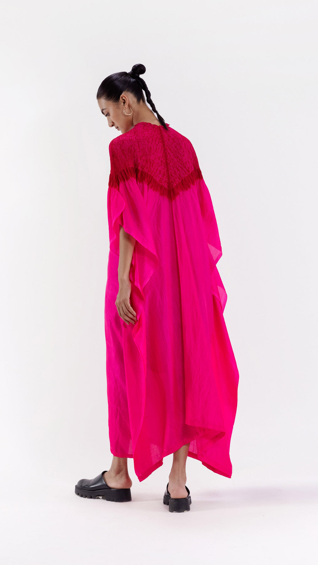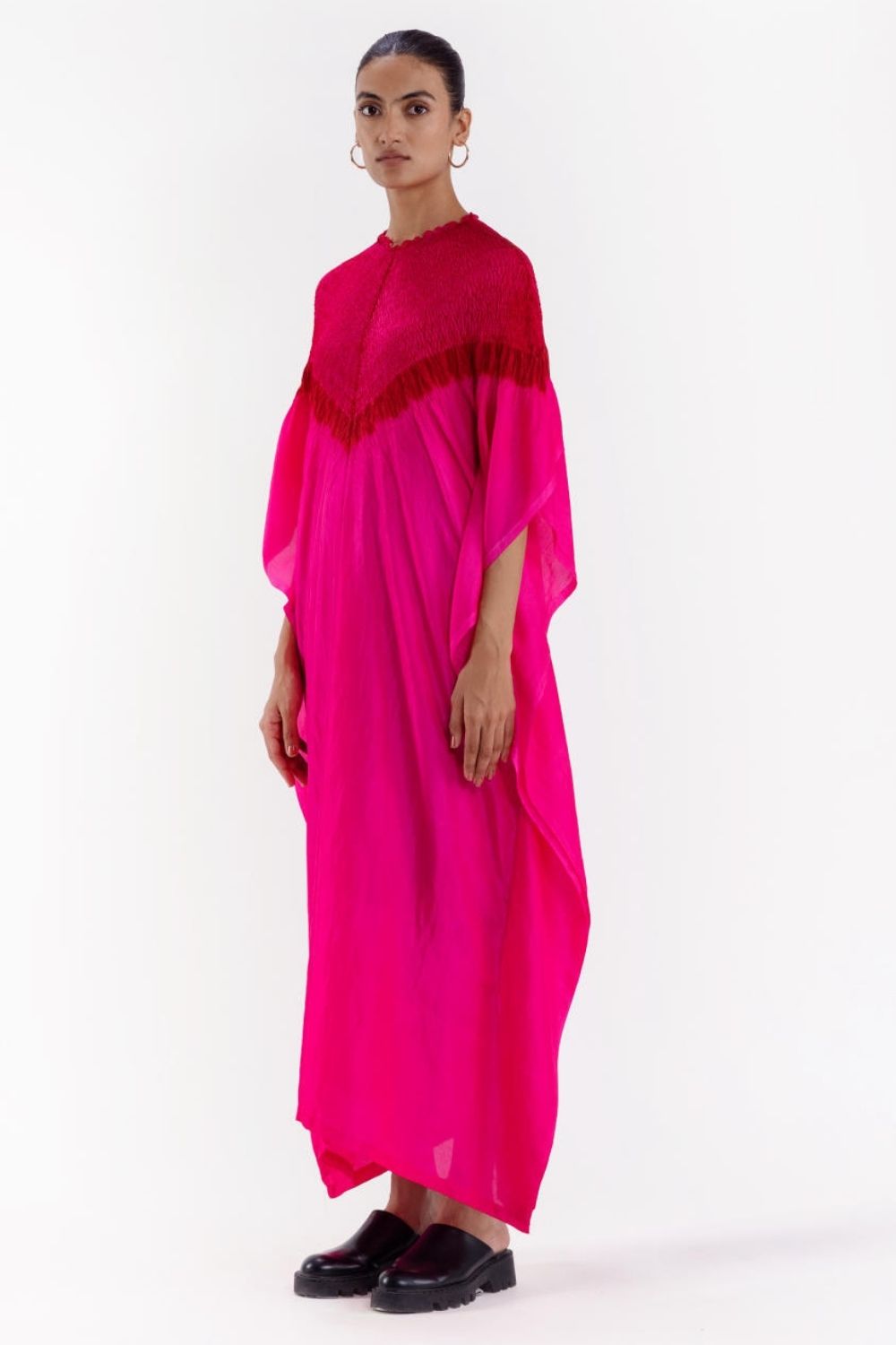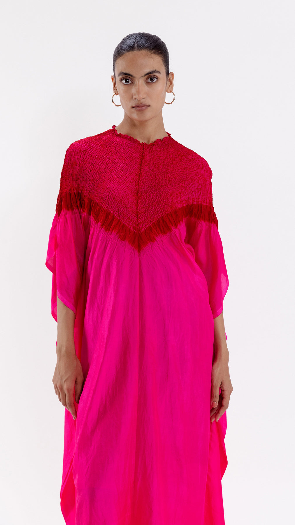 Free-size silk kaftan with our signature shibori neckline, dyed in shades of red and pink.