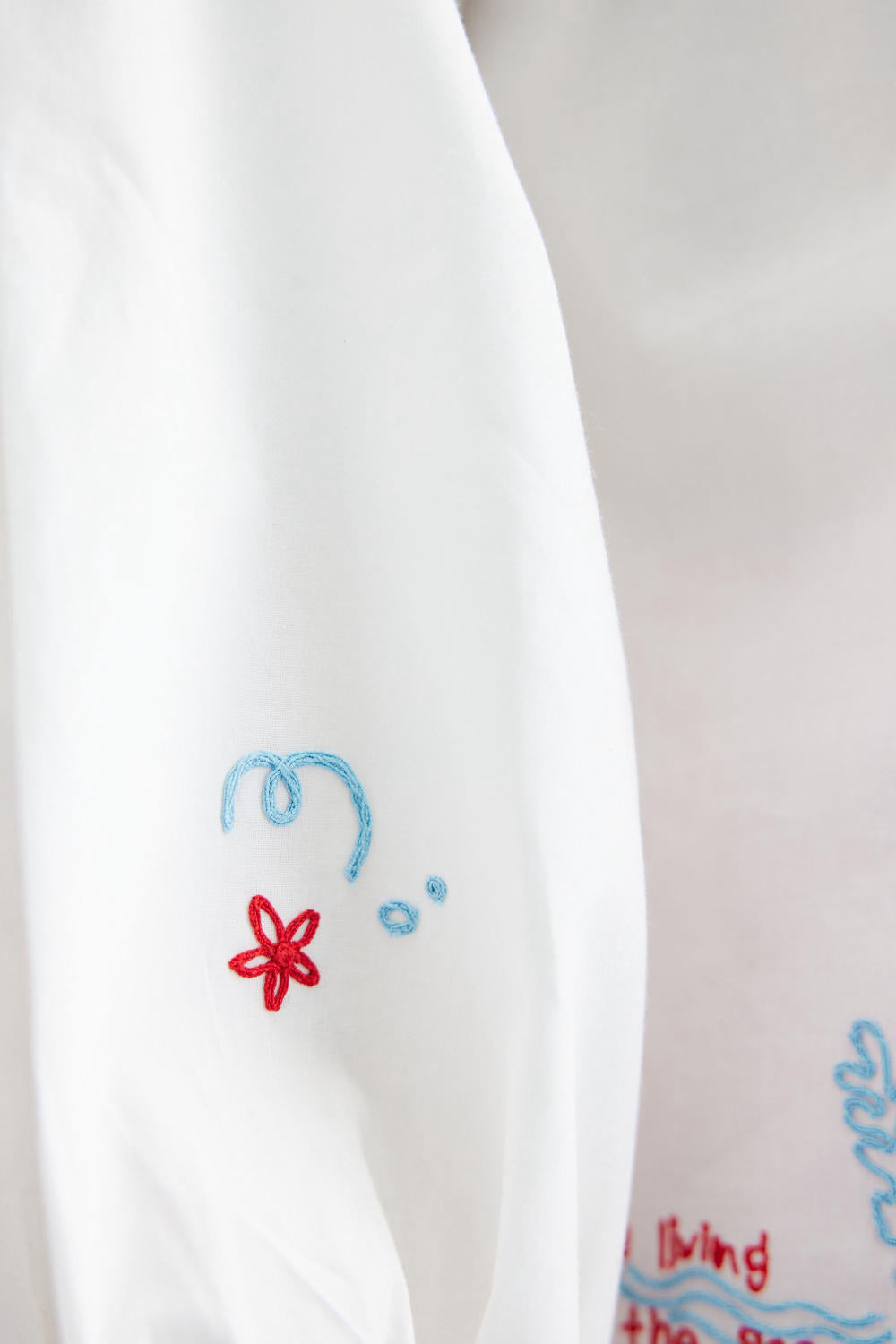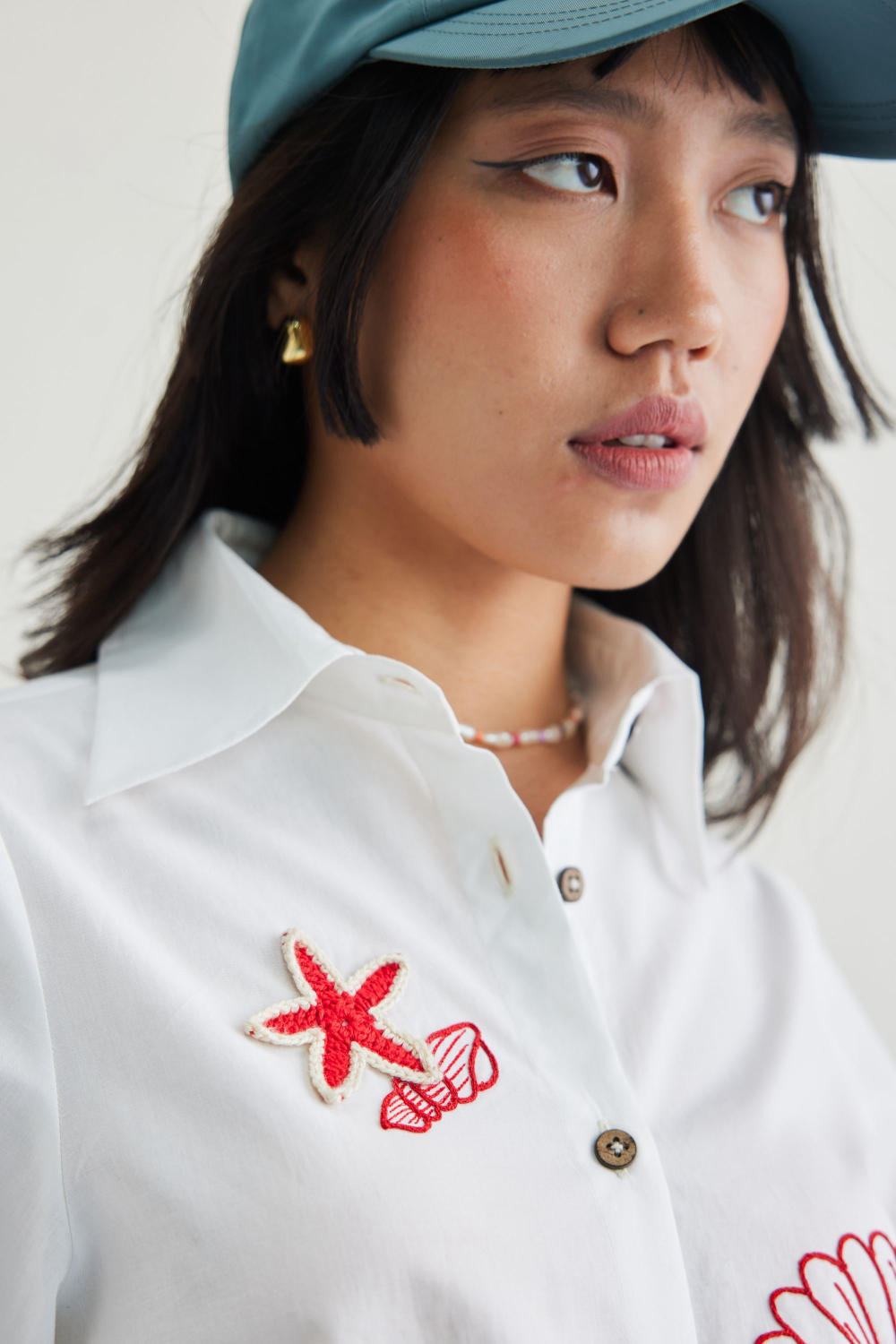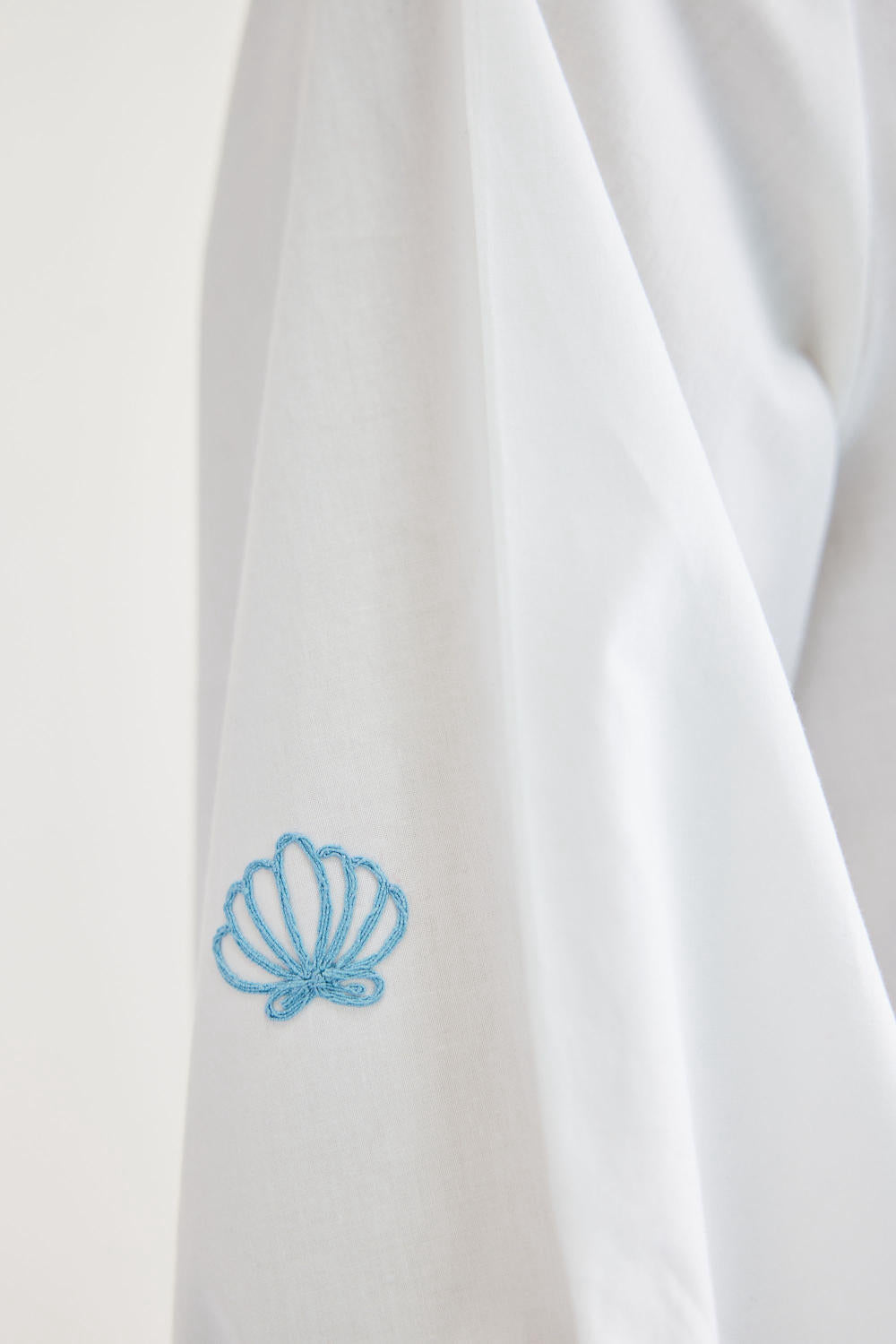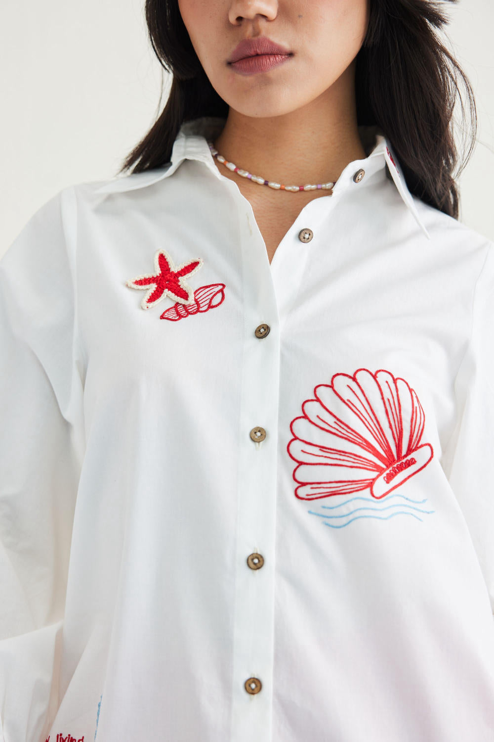 Relaxed fit, long sleeve, collared, classic shirt that buttons at the front, crafted in organic cotton poplin fabric, crocheted and machine embroidered with ocean-inspired motifs.