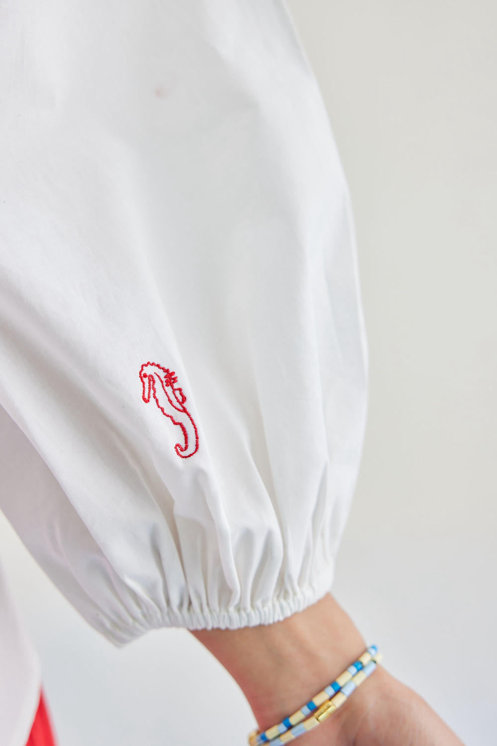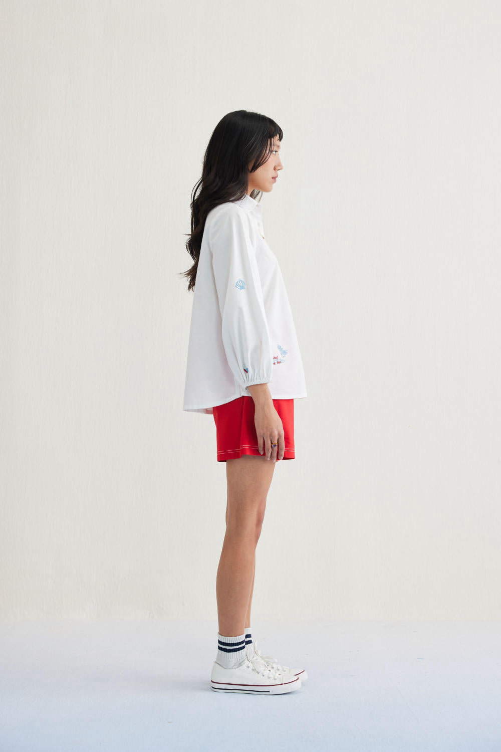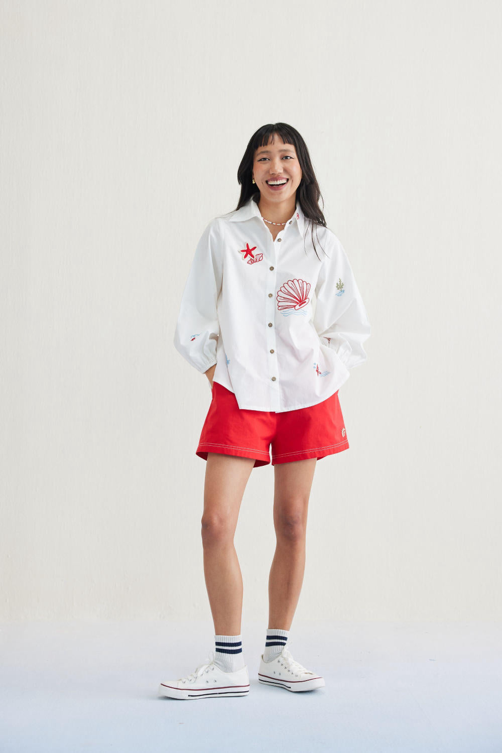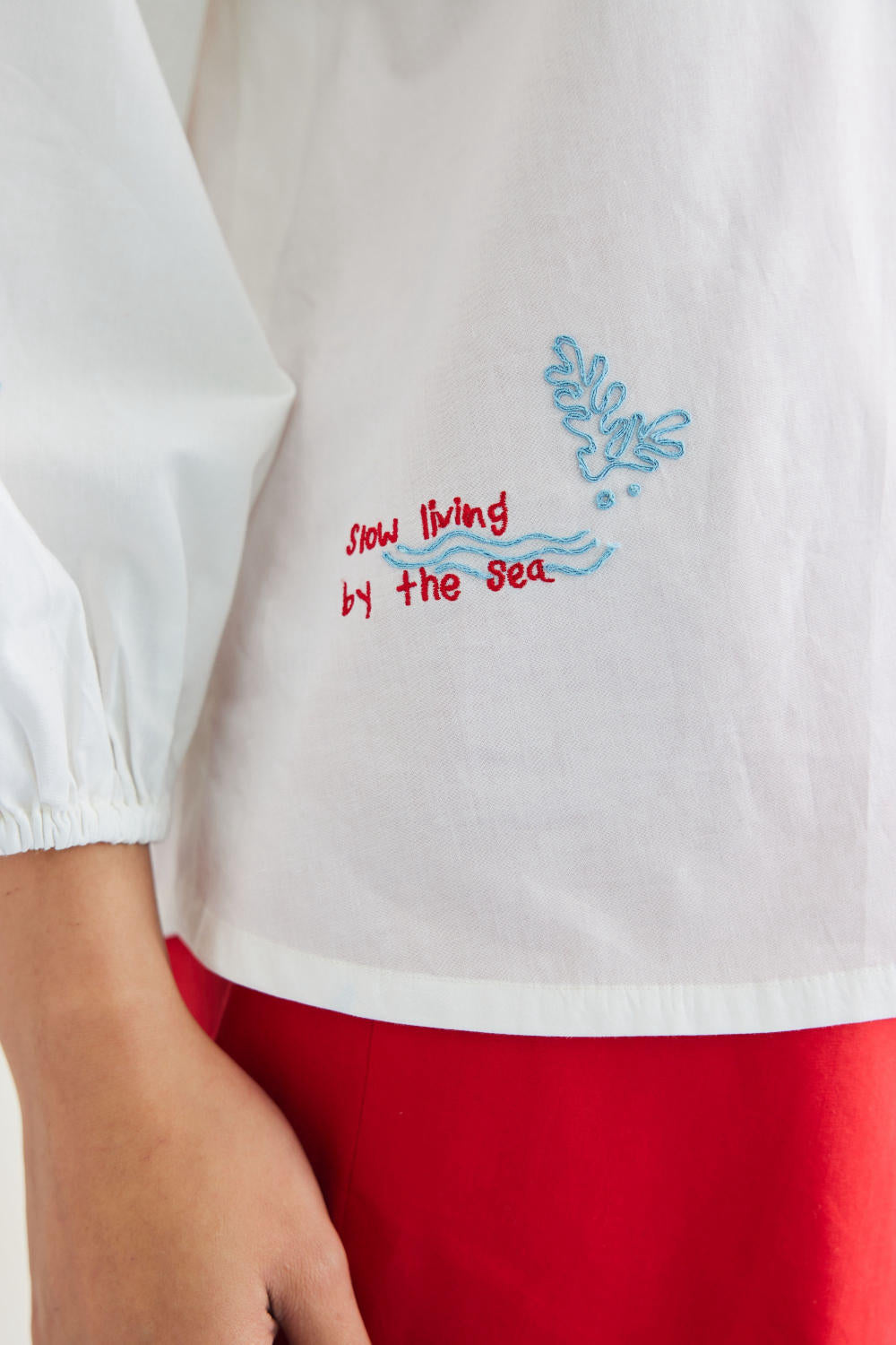 Relaxed fit, long sleeve, collared, classic shirt that buttons at the front, crafted in organic cotton poplin fabric, crocheted and machine embroidered with ocean-inspired motifs.