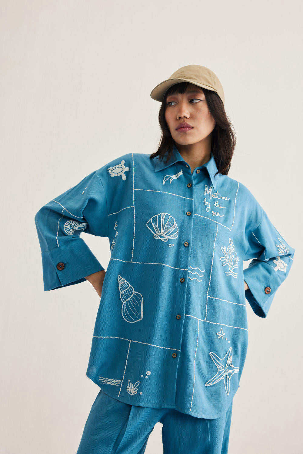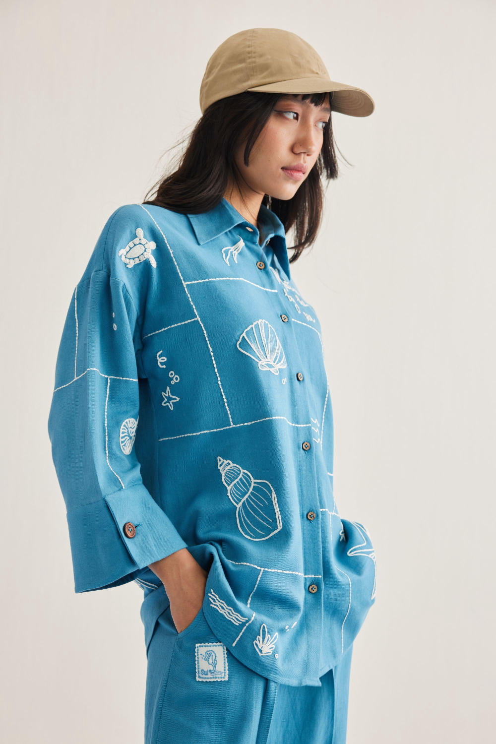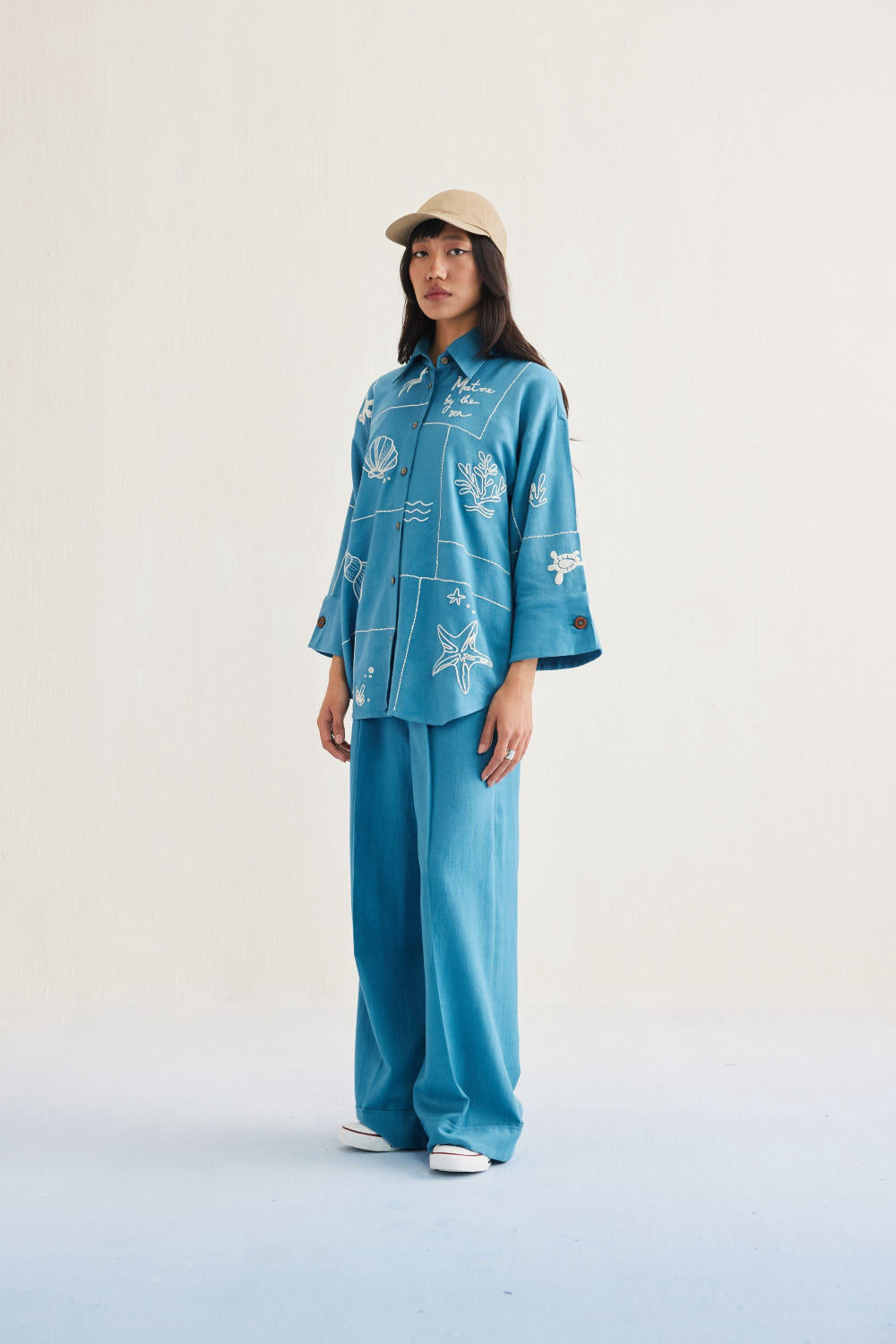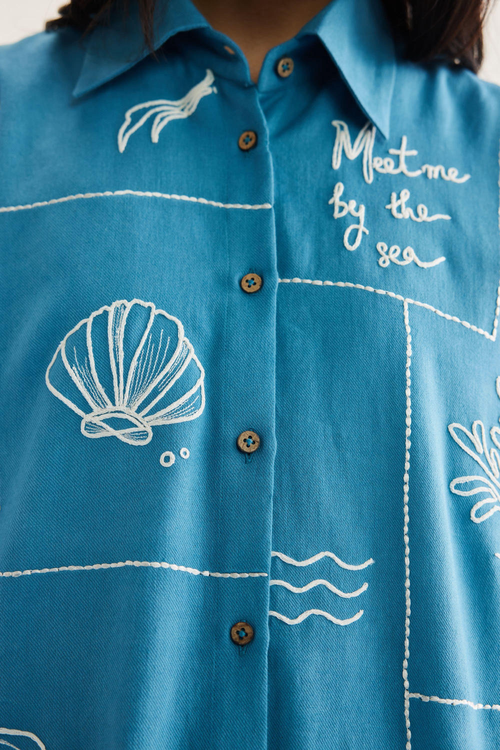 Relaxed fit, long sleeve, collared, classic shirt that buttons at the front, crafted in azo-free dyed, handwoven organic cotton twill fabric, machine embroidered with ocean-inspired and message motifs.