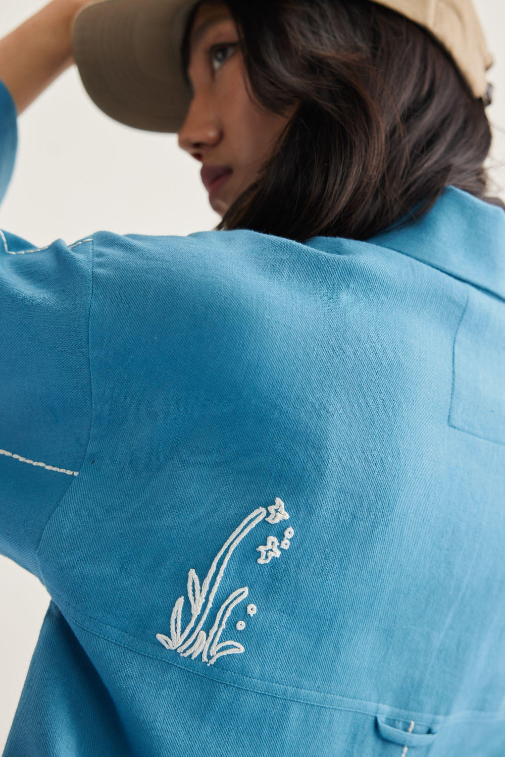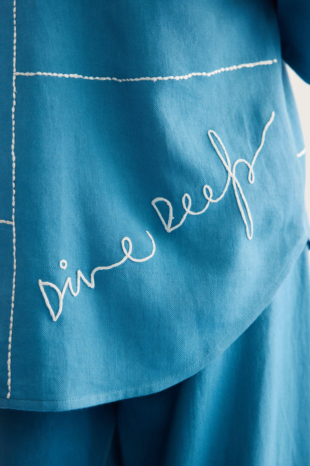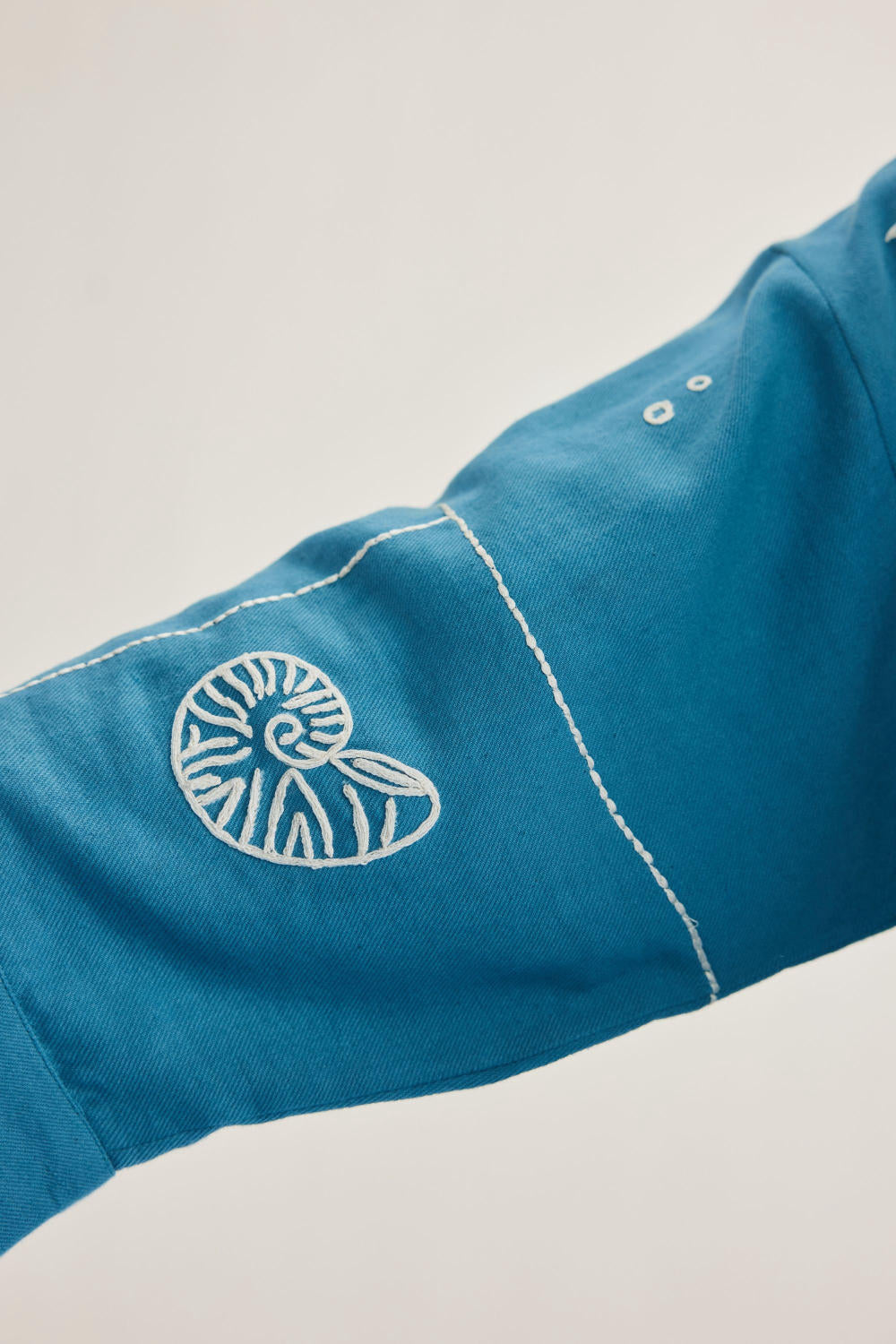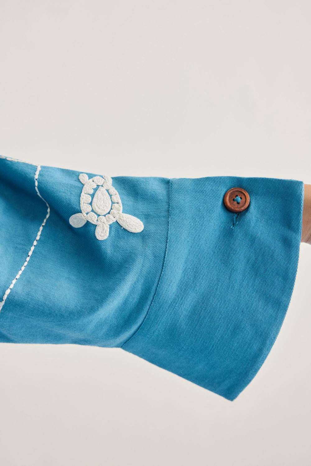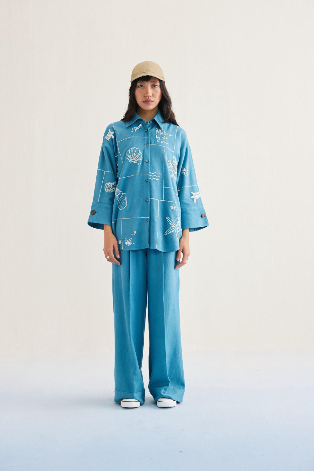 Relaxed fit, long sleeve, collared, classic shirt that buttons at the front, crafted in azo-free dyed, handwoven organic cotton twill fabric, machine embroidered with ocean-inspired and message motifs.