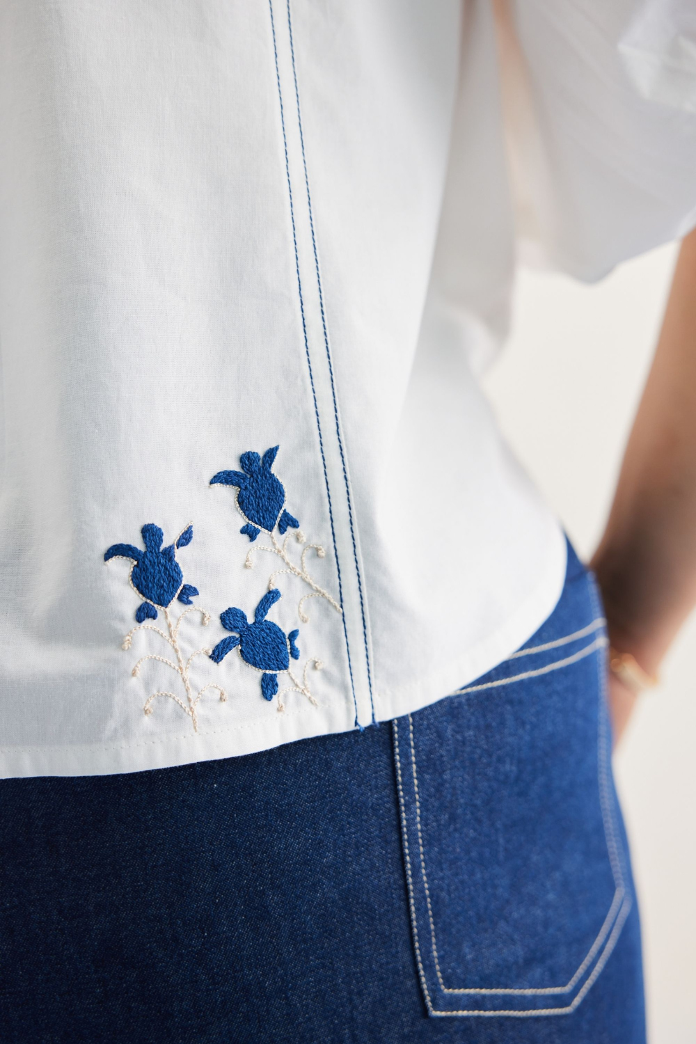 Relaxed fit, half puff sleeve, round-neck top crafted in organic cotton poplin fabric, hand embroidered with starfish and turtle motifs. This easy breezy top is made in organic cotton poplin, no pesticides or synthetic fertilisers needed - good for farmers and good for you.