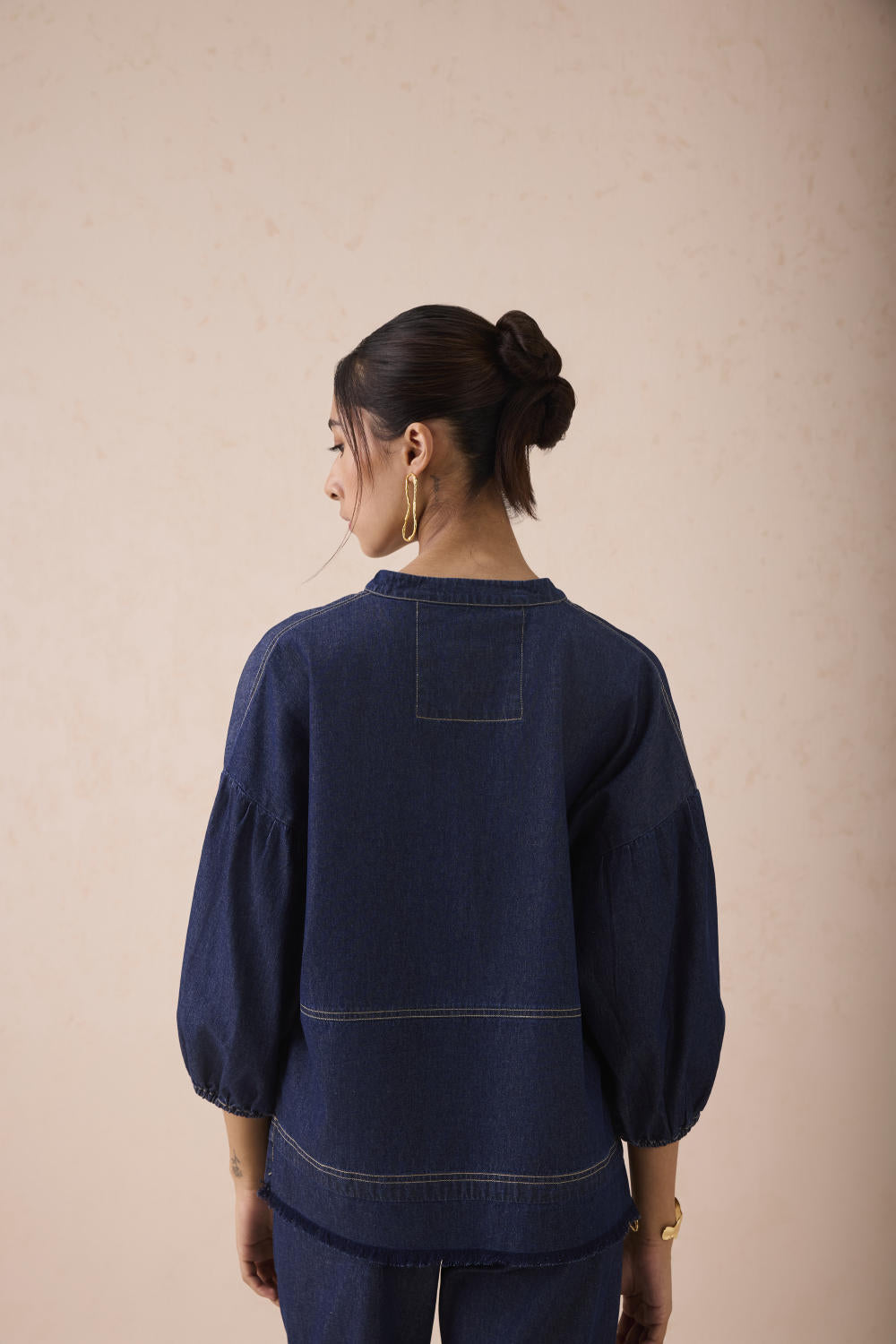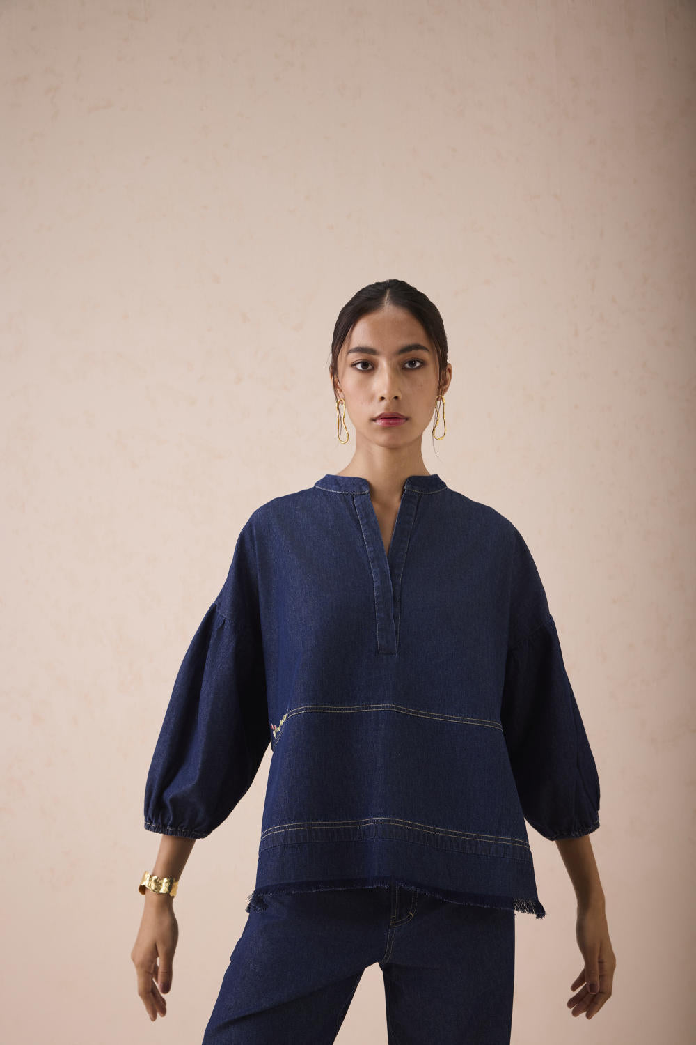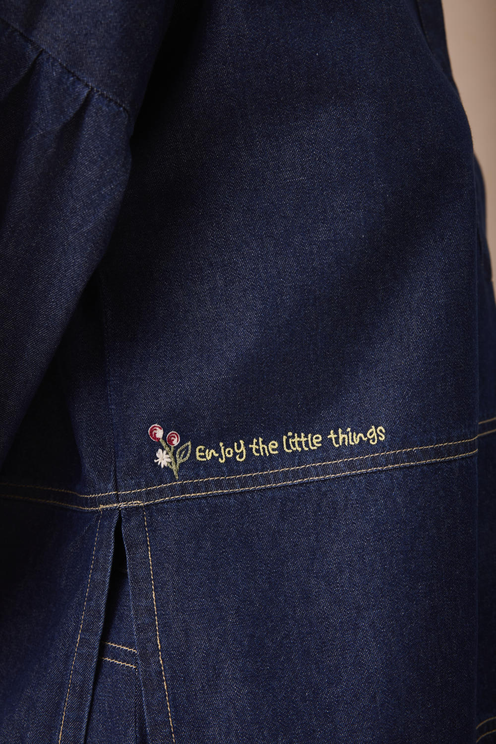 Relaxed fit, three quarter sleeve, split crew neck shirt crafted in cotton denim fabric created with a blend of cotton and recycled cotton fibres, hand embroidered with message and flower motifs.