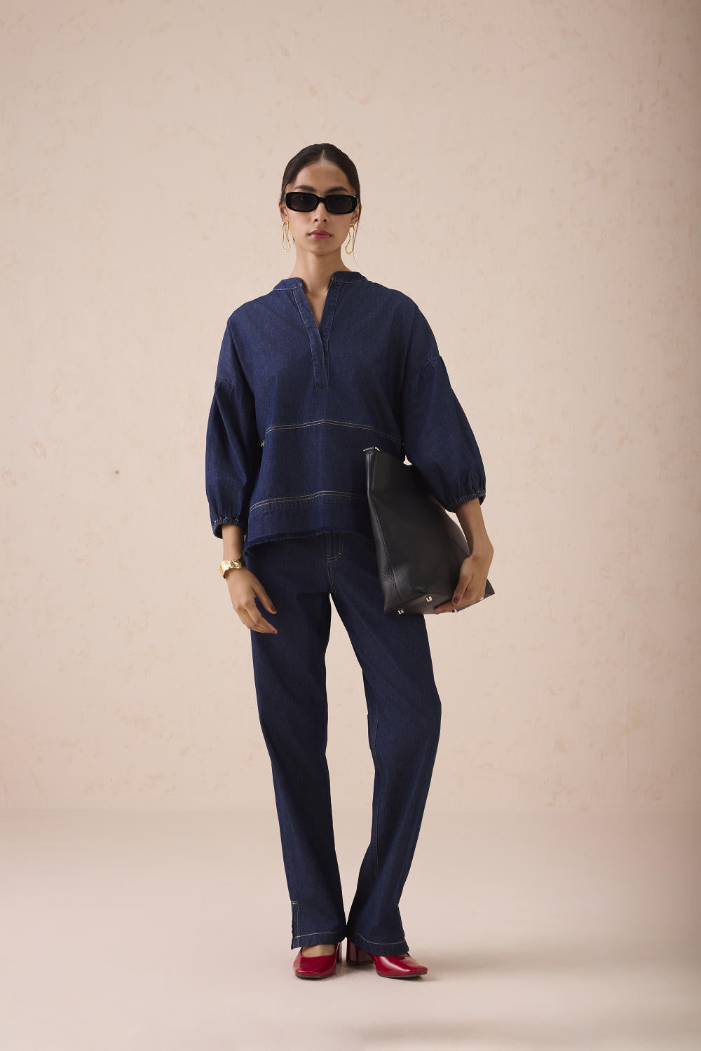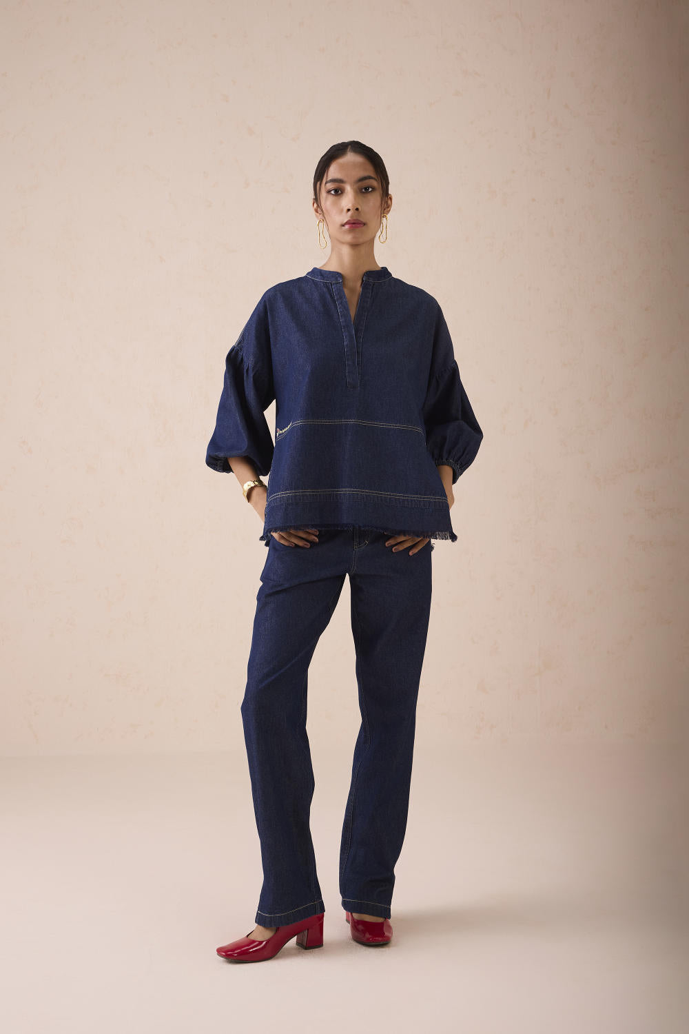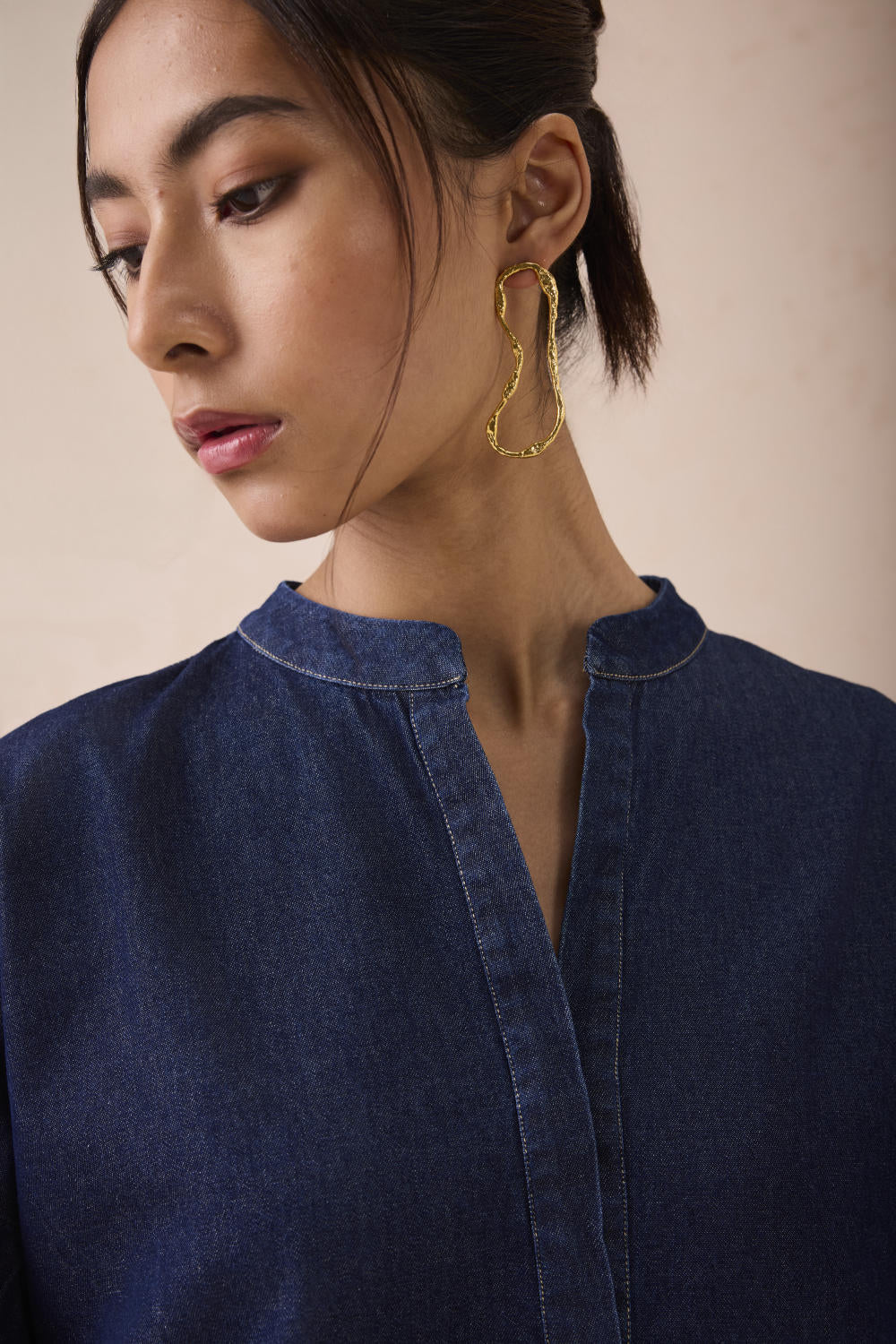 Relaxed fit, three quarter sleeve, split crew neck shirt crafted in cotton denim fabric created with a blend of cotton and recycled cotton fibres, hand embroidered with message and flower motifs.