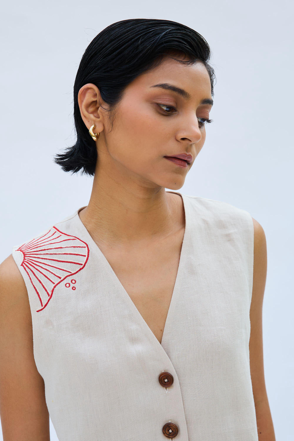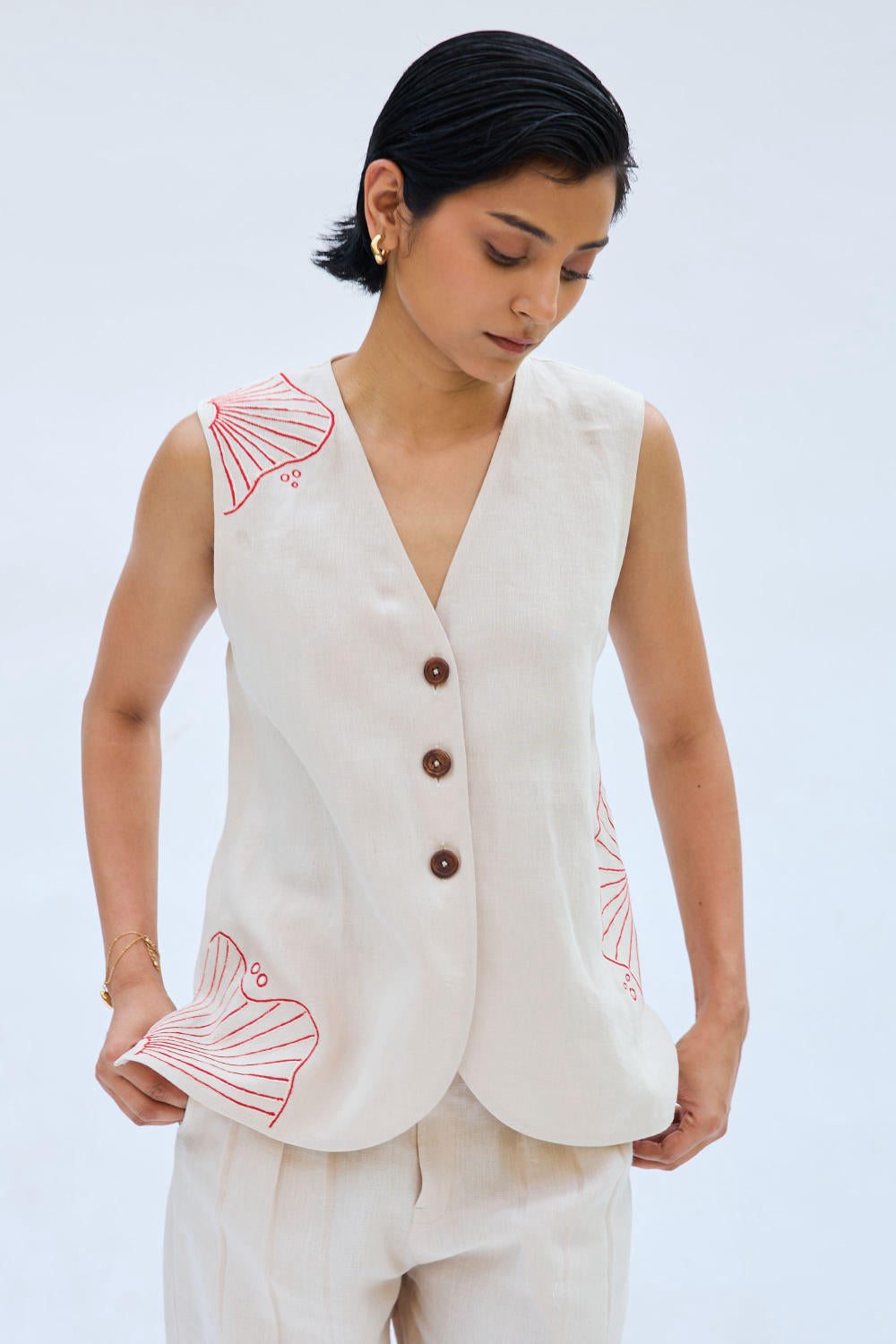 Regular fit, v-neck sleeveless, waistcoat top that buttons at the front, crafted in azo-free dyed linen fabric, machine embroidered with ocean-inspired motifs. This piece is a community favourite! Perfect for those semi-formal to formal moments but can easily be dressed down for casual days - a truly versatile look you can pair with anything.