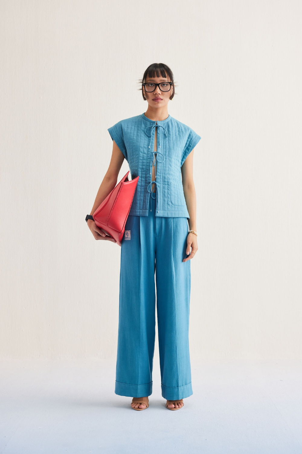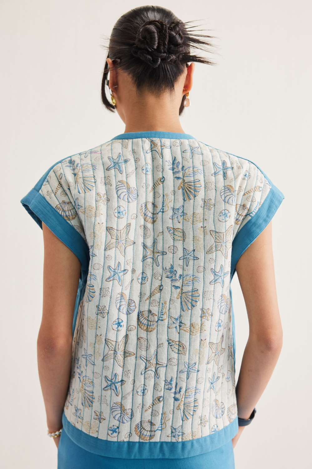 Regular fit, short sleeve, reversible vest top with pockets that fastens at the front with drawstrings, crafted in two fabrics - one is a blue azo-free dyed double gauze organic cotton, the other is a handspun and handwoven Kala cotton fabric that's hand block printed with our signature ocean life inspired motif using azo-free dyes. This piece is a super versatile! Crafted in two of our comfy sustainable fabrics, this staple silhouette can transform from being one solid shade to print when you turn it inside out - perfect to layer with or where simply on its own.