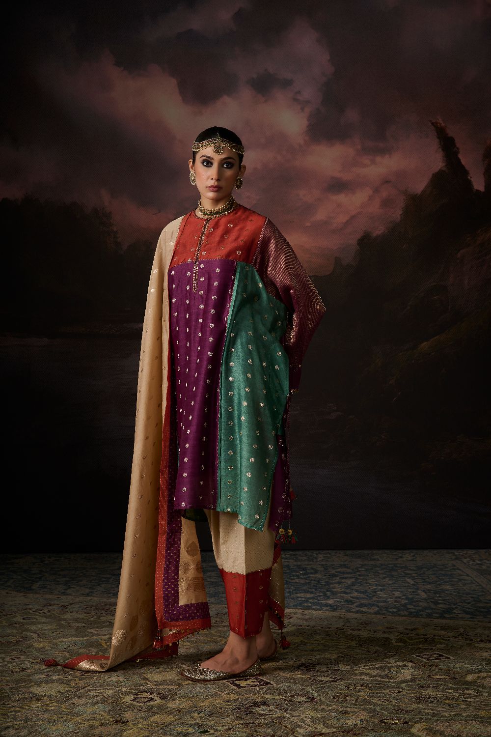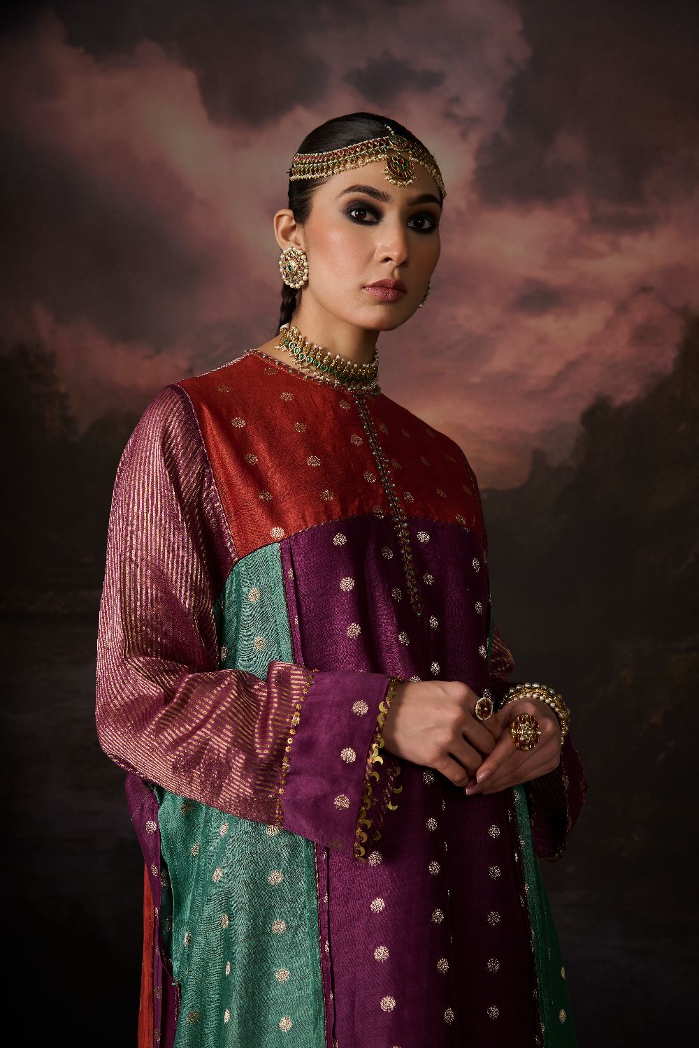 Banarasi Chanderi Brocade & Handwoven Chanderi Zari Stripe Paneled, Color-Blocked Kaftan, Hand Embellished With Fine Embroidery and Tassels Made From Upcycled Katran Fabric