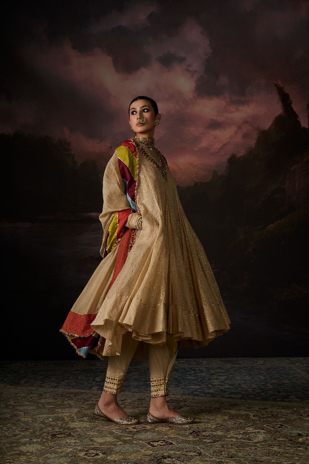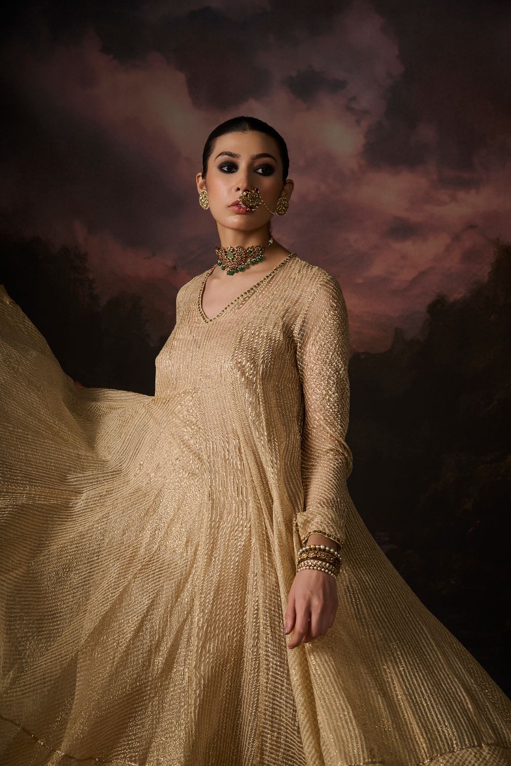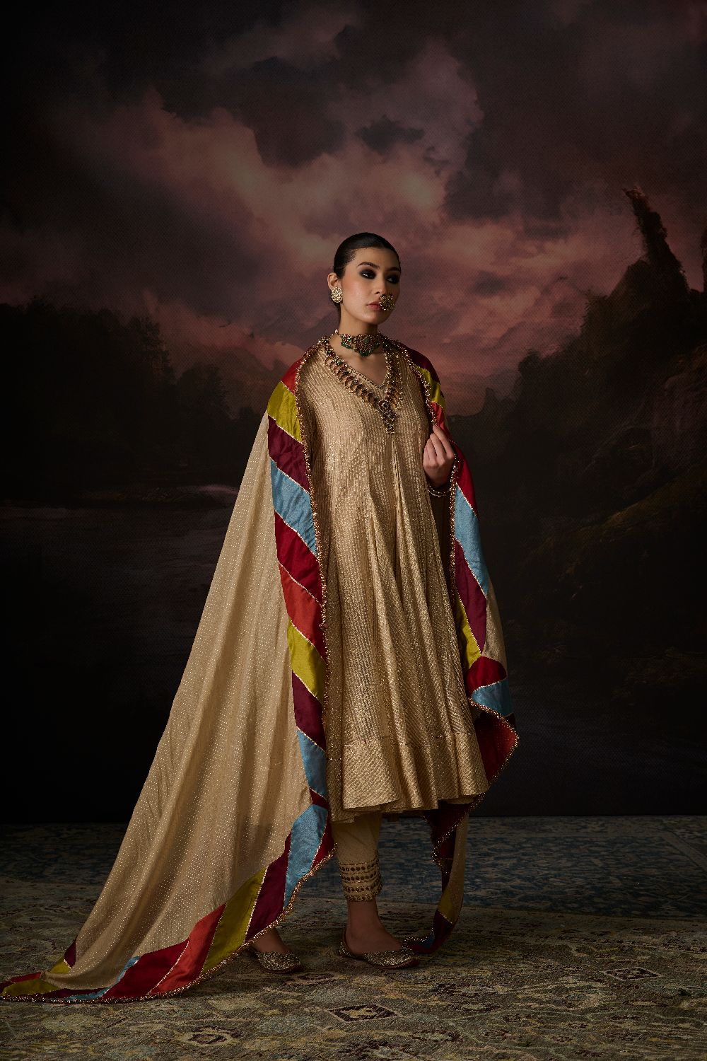 Woven Striped Silk Organza Kurta with Hand Block Foil Print, Choori Sleeves, Delicate Embroidery, and Gota Detailing, paired with a 100% Cotton Slip.
