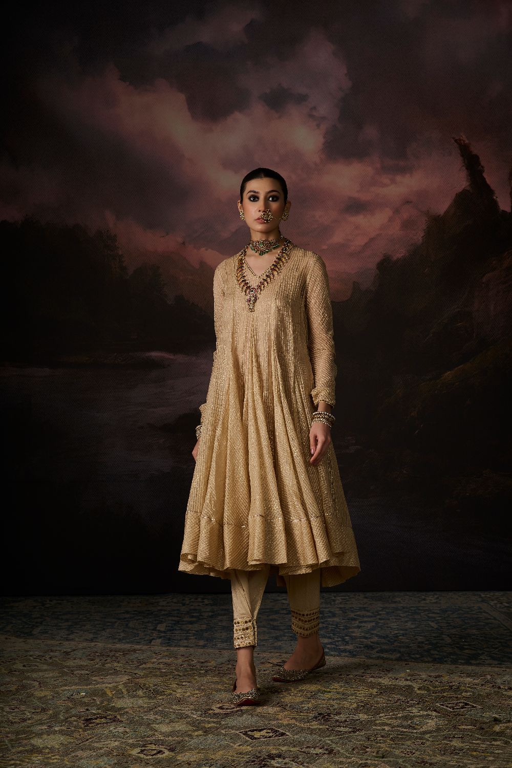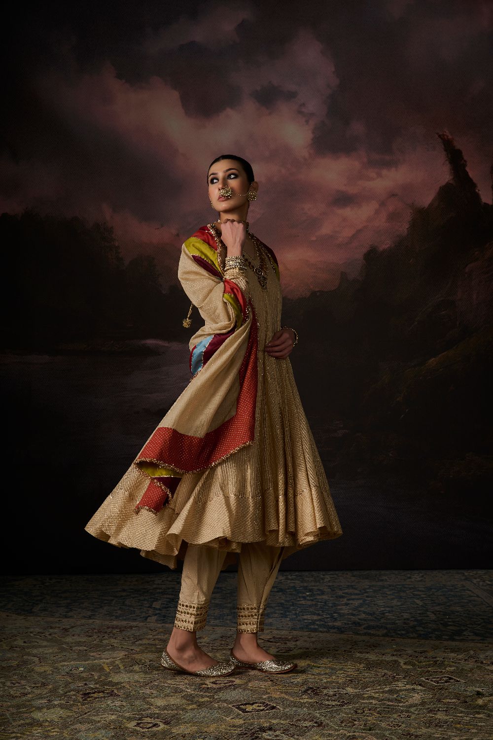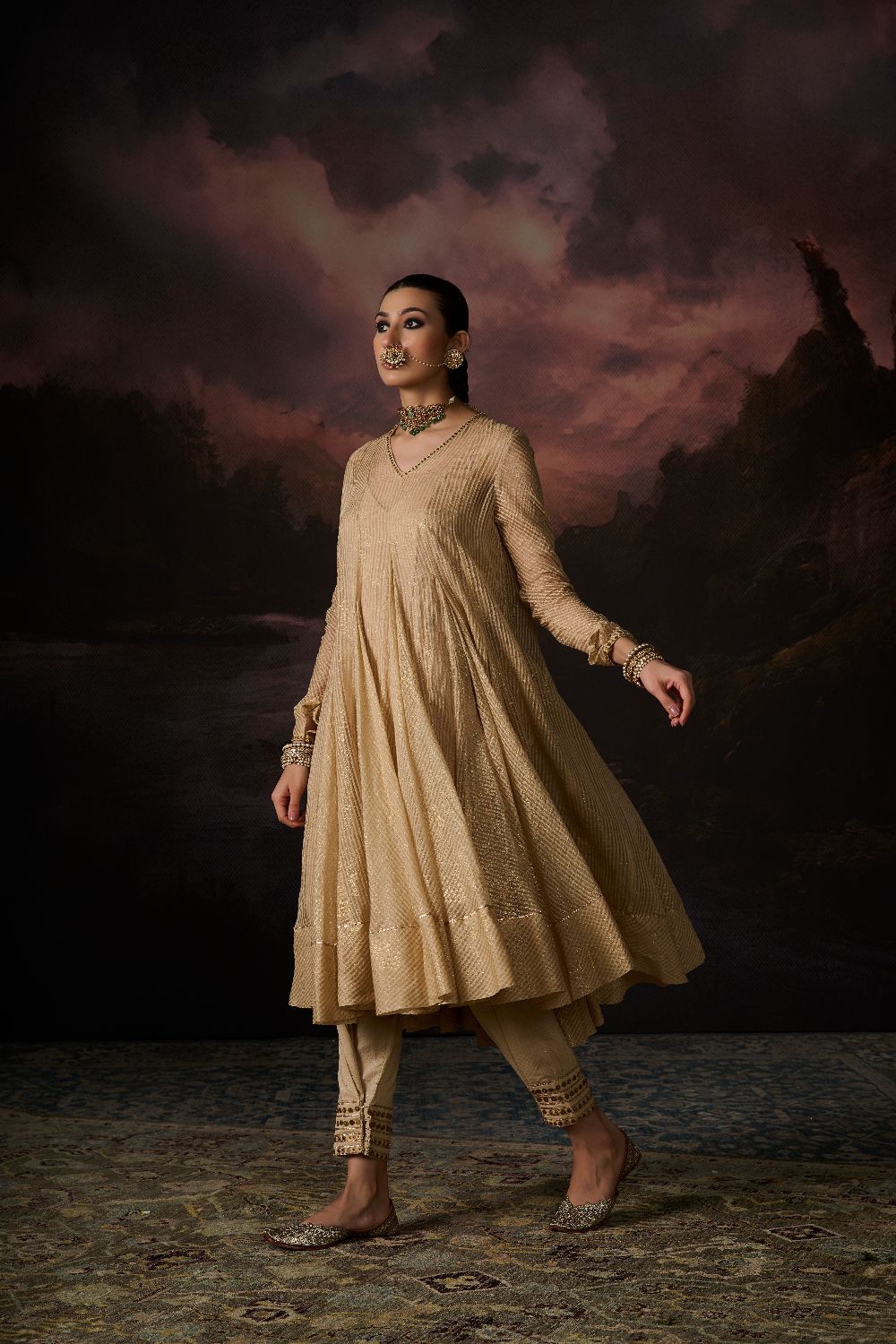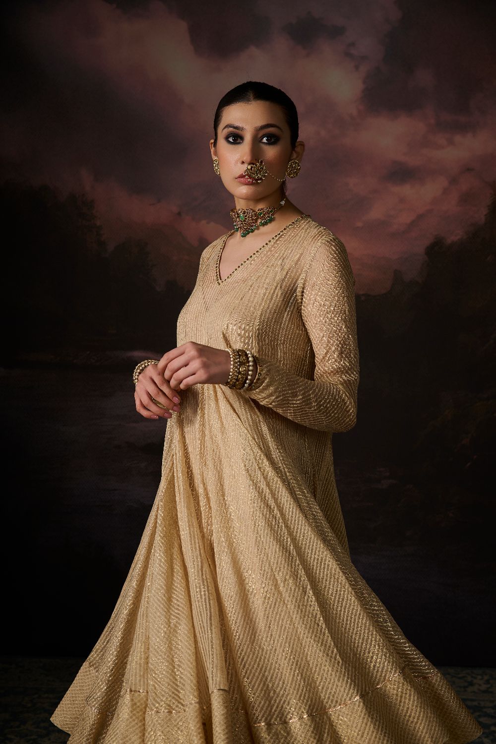 Woven Striped Silk Organza Kurta with Hand Block Foil Print, Choori Sleeves, Delicate Embroidery, and Gota Detailing, paired with a 100% Cotton Slip.