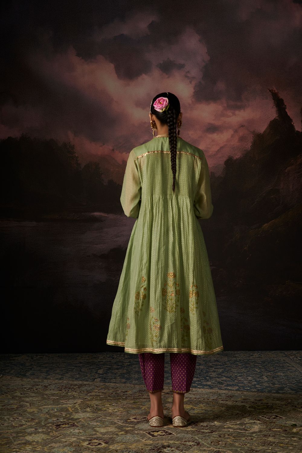 Handwoven 40gm Chanderi Kurta featuring Fine Pintucks, Textured Detailing, and Hand Block Printing, Enhanced with Hand Embroidery and Gota Lines. Comes with a 100% Cotton Slip.