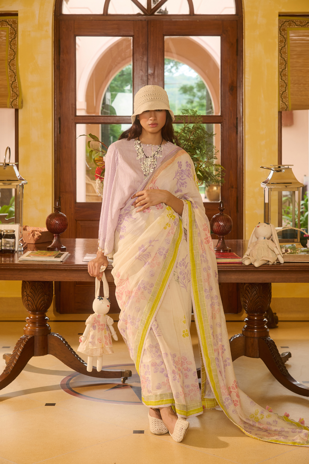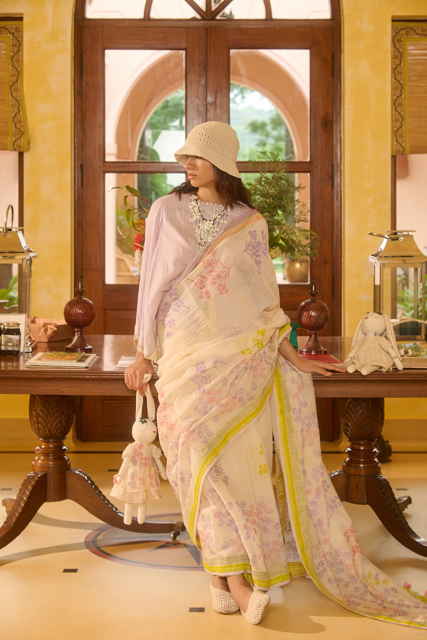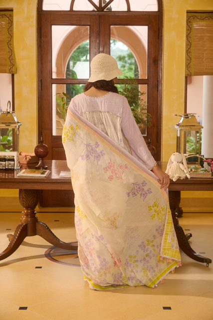 Her Chanderi carries its signature translucence and soft sheen, but with a subtlety that feels almost ethereal — printed slowly, consciously, through hand block printing that heightens the fabric's inherent delicacy.