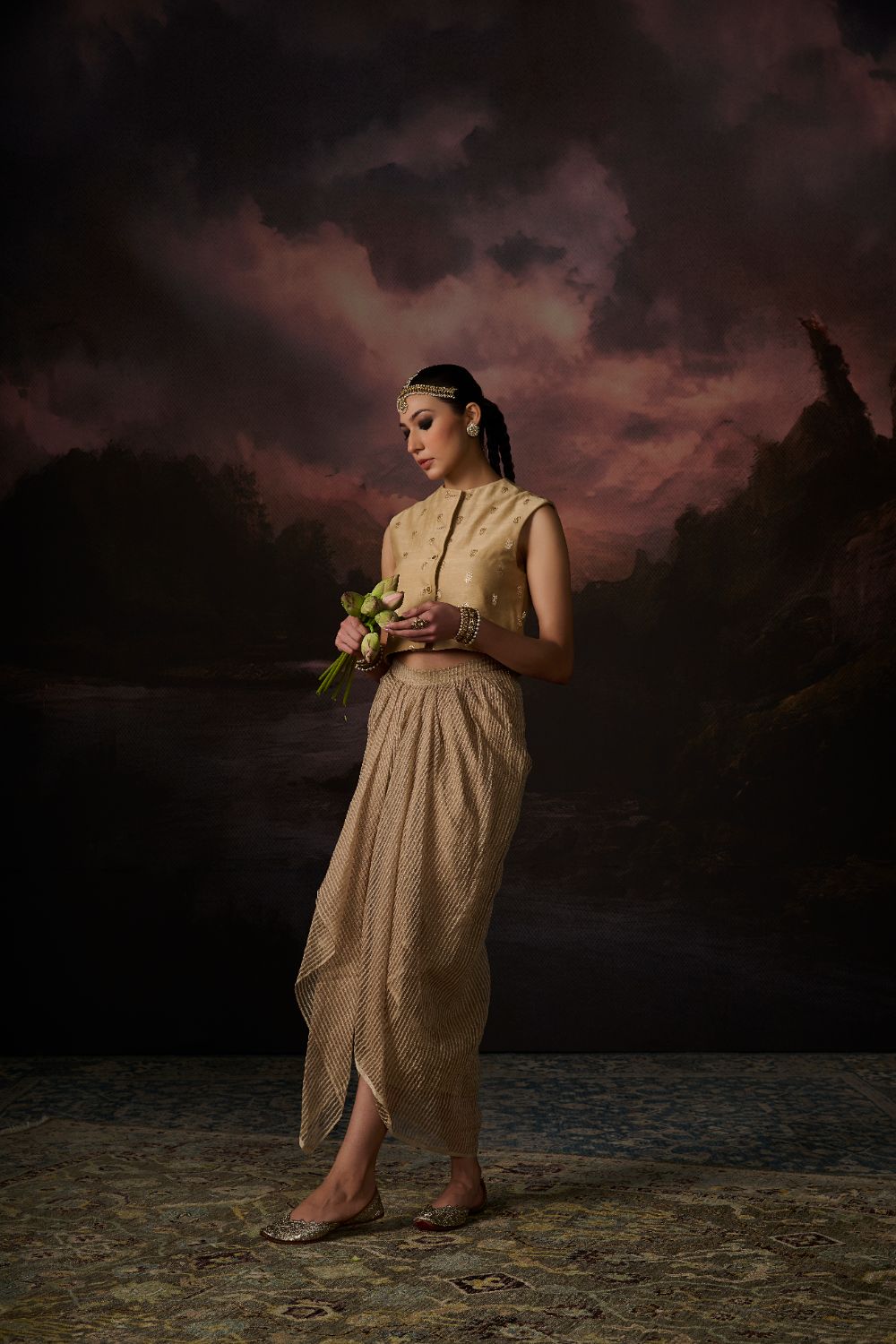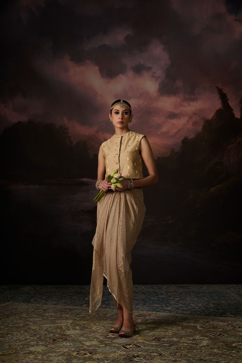 Woven Striped Silk Organza Hand Block Printed in Gold Foil, Draped Skirt Lined with 100% Cotton.
