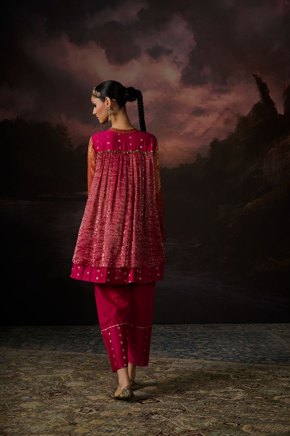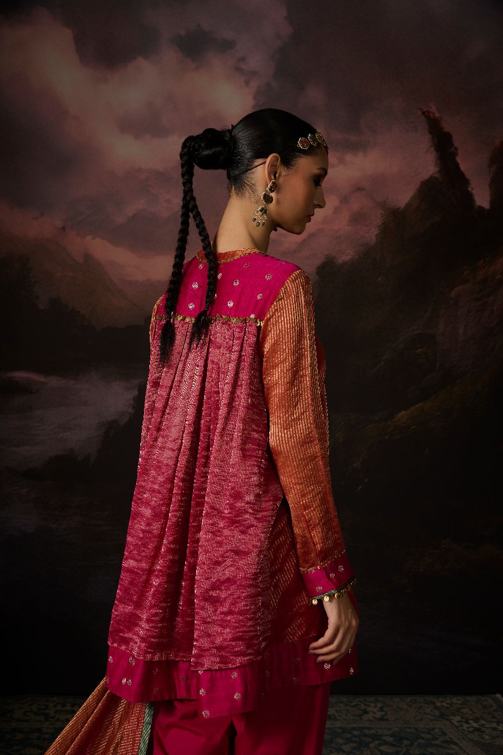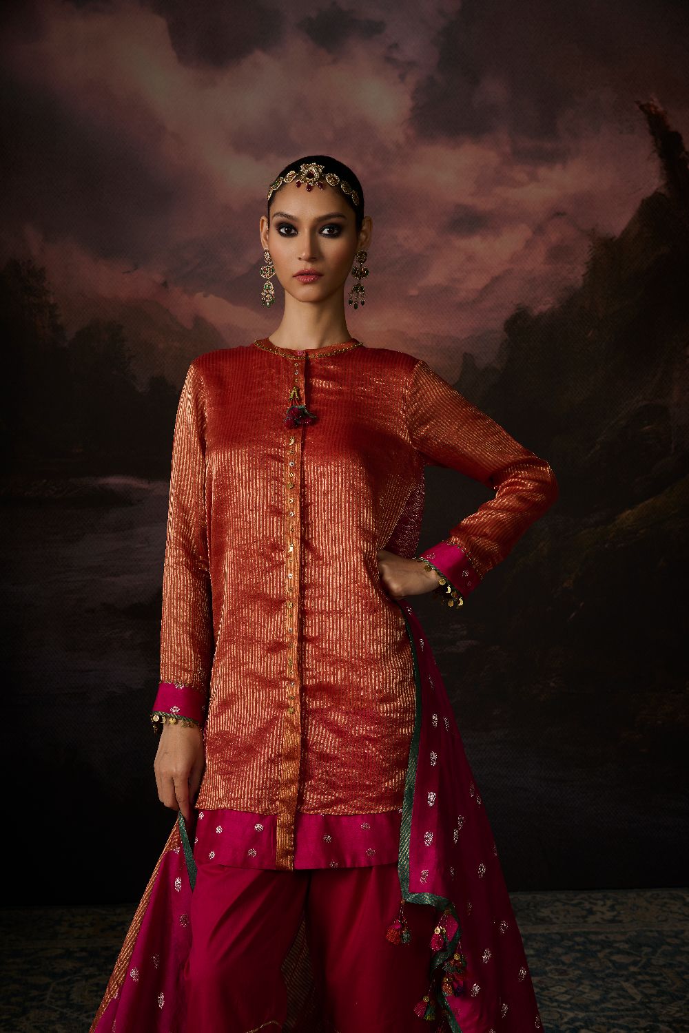 Banarasi Chanderi Brocade & Handwoven Chanderi Zari Stripe Layered Front-Open Tunic With a Banarasi Chanderi Brocade Inner Layer, Embellished With Hand-Done Beadwork and Tassel Detailing.