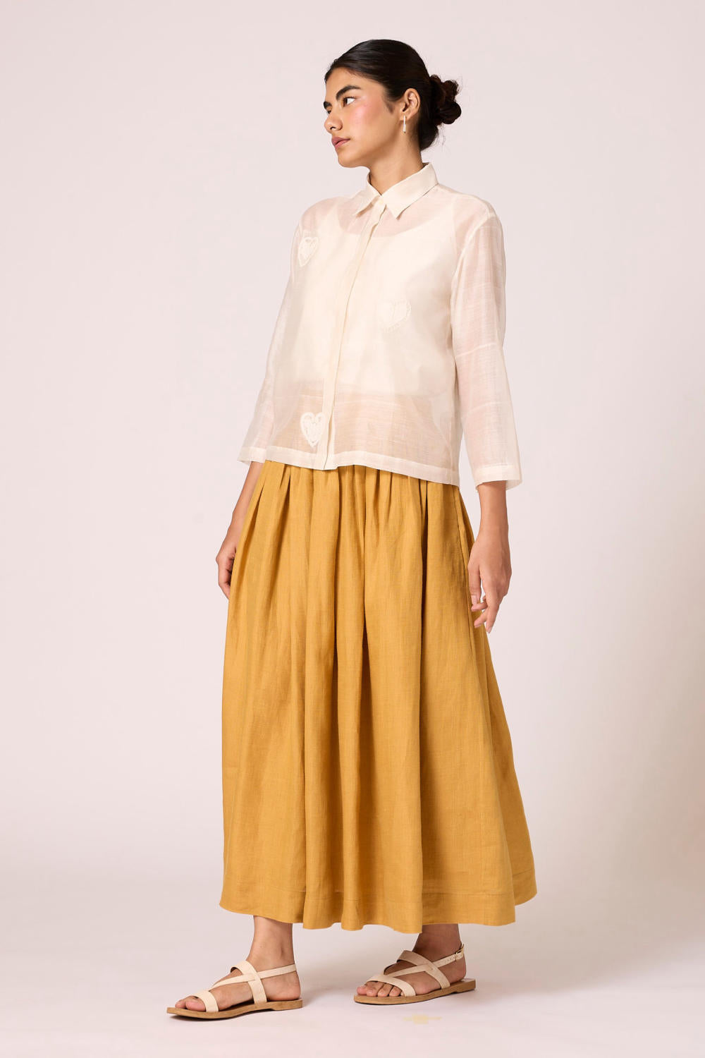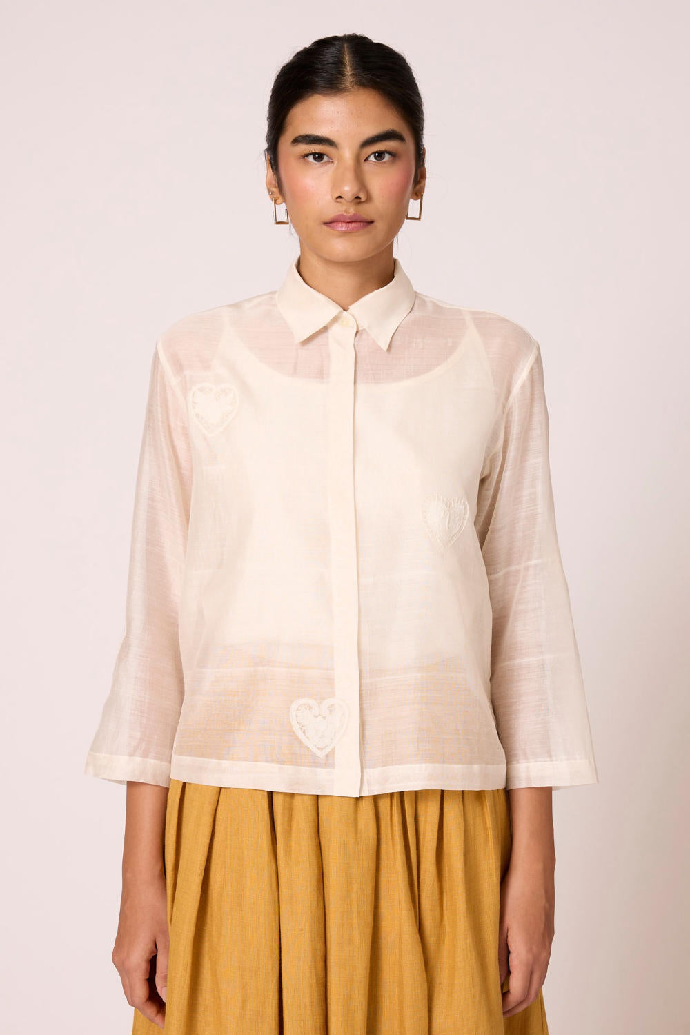 Hand embroidered with a delicate motif in our studio. A short shirt-jacket with front open button-down placket and drop-shoulder sleeves. Crafted from exquisite chanderi fabric. Can be worn as a shirt or a slip-over layer.