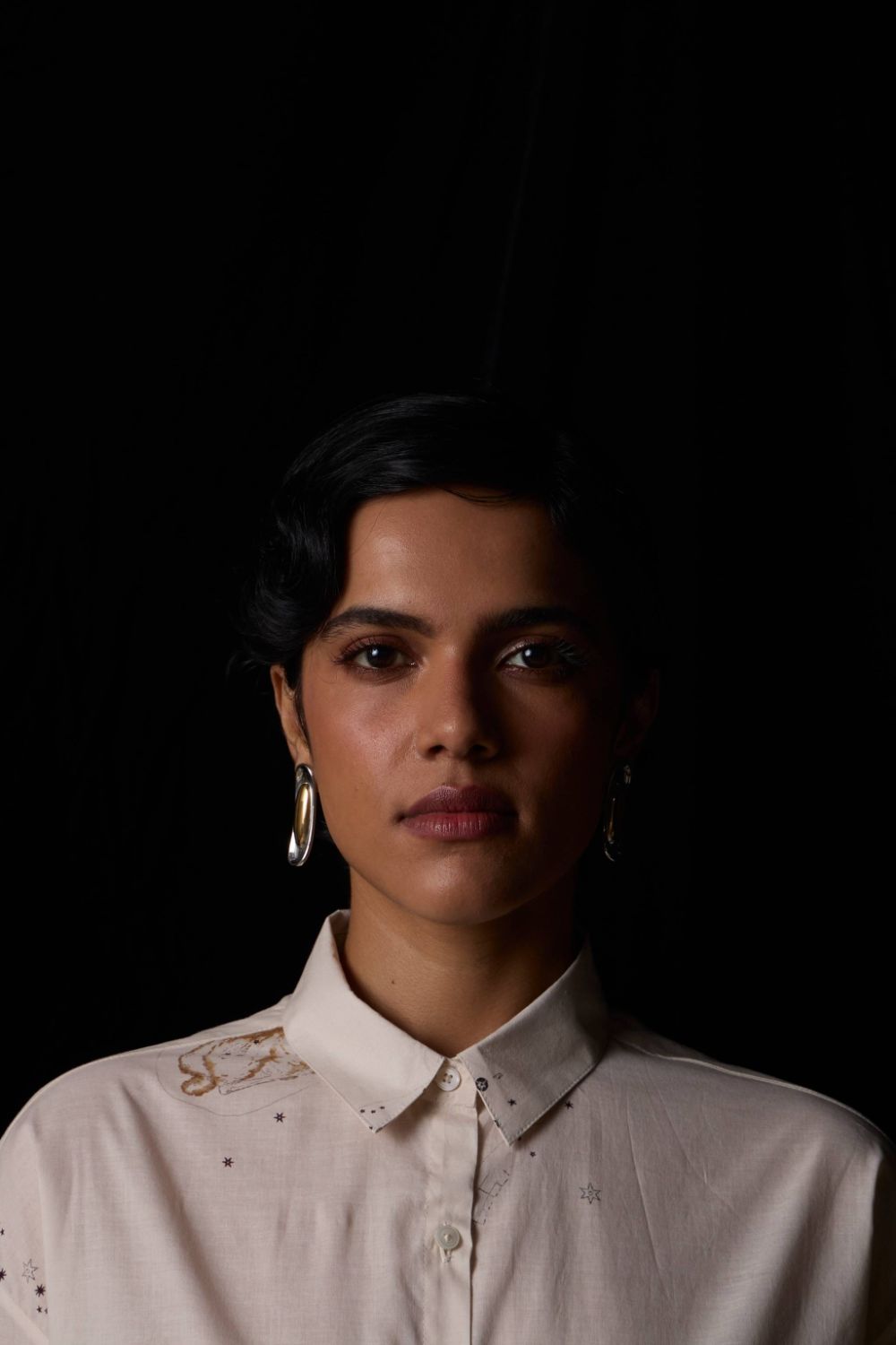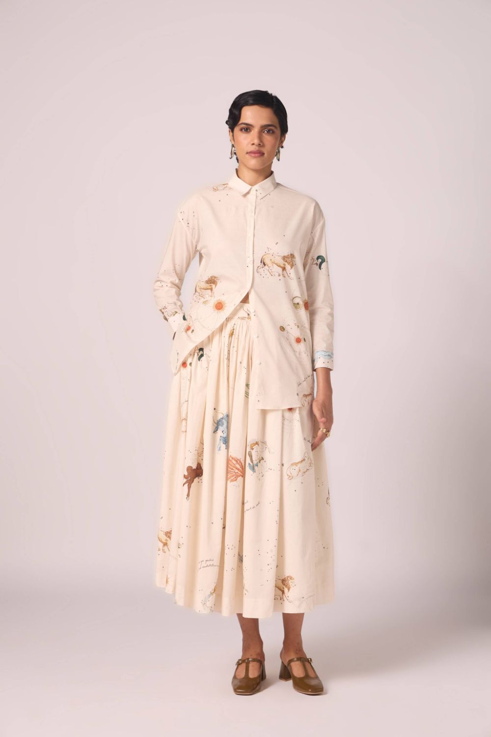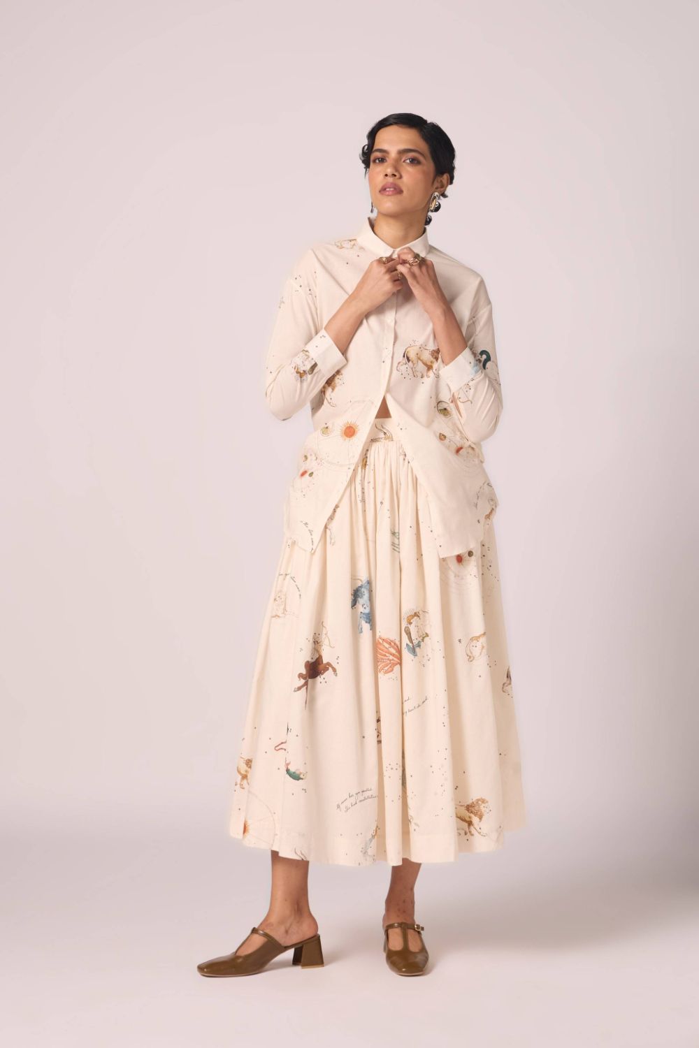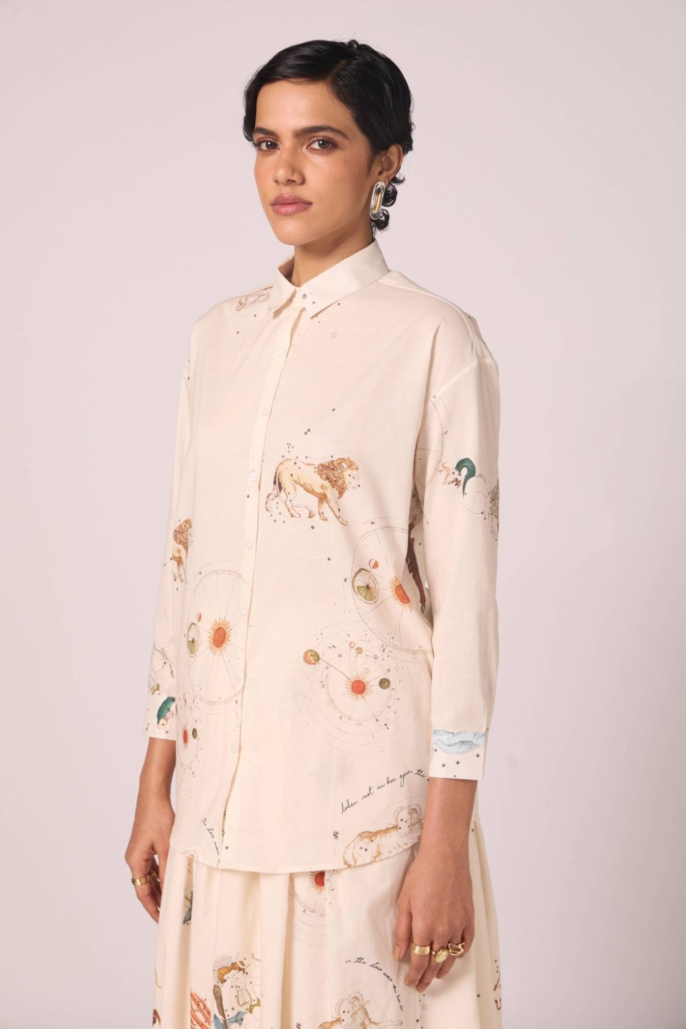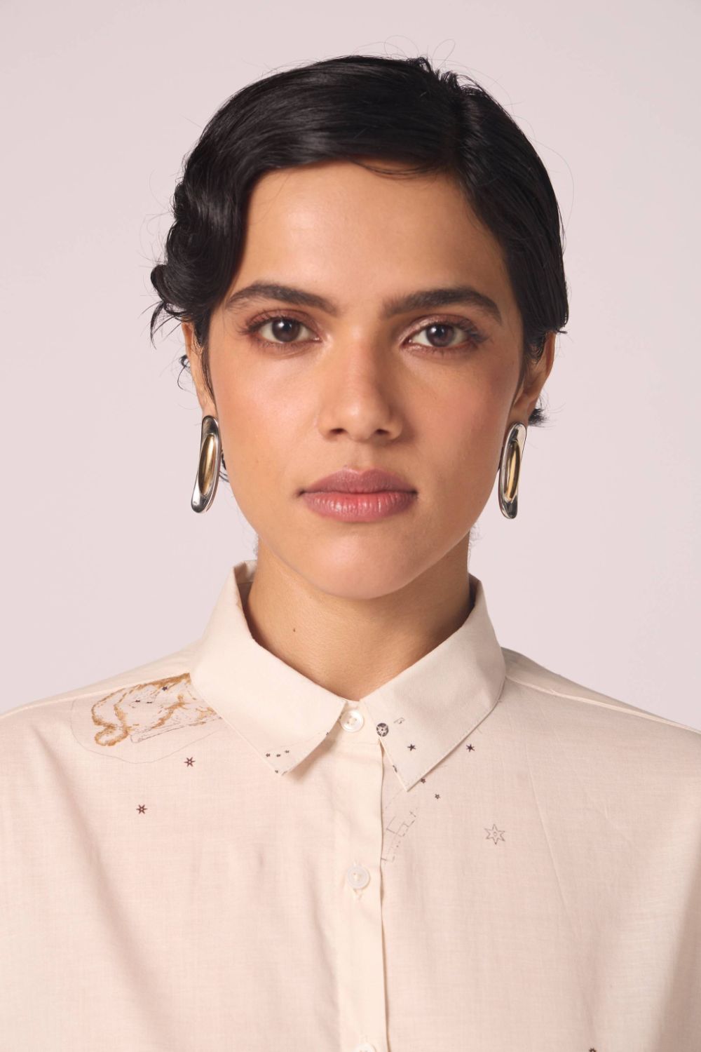 A timeless favorite, the Joyce Shirt returns in a signature studio print. Designed with a slightly oversized silhouette, it balances ease with polish. The slim collar and full-length sleeves with cuffs add a touch of tailored refinement, making it an effortless piece for everyday wear.