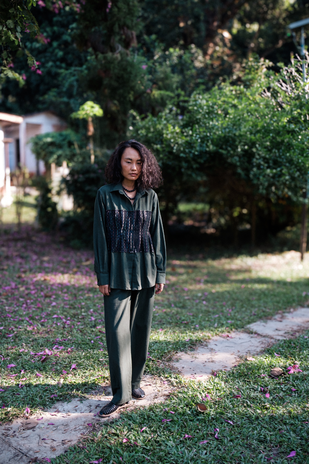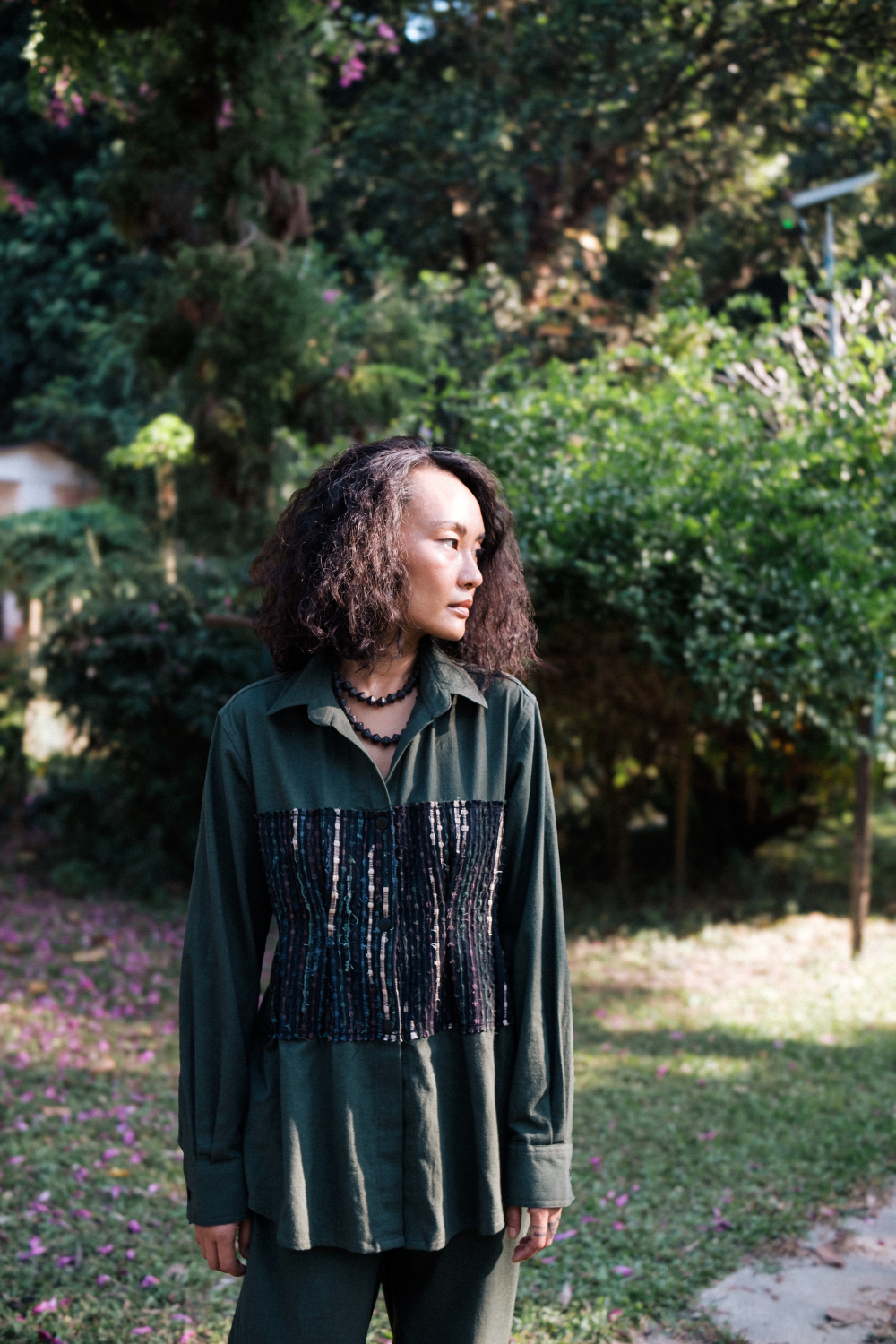 This shirt features a patch detail designed from upcycled fabric, made using post production waste, creating the most perfect cinch on the waist. An elevated classic shirt that pairs perfectly with our barrel pants. Our garments are dyed using pigments that do not cause any major harm to the environment in any manner. The garment is made from hand woven upcycled fabric and so the color might vary slightly for each batch. Peta approved vegan/Plant based clothing. For customization, please reach out to us.