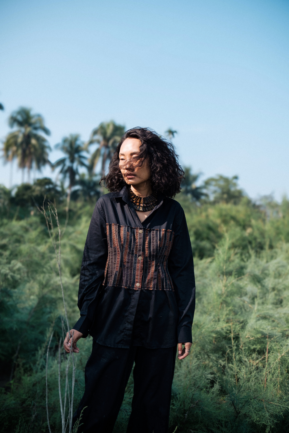 This shirt features a patch detail designed from upcycled fabric, made using post production waste, creating the most perfect cinch on the waist. An elevated classic shirt that pairs perfectly with our barrel pants. Our garments are dyed using pigments that do not cause any major harm to the environment in any manner. The garment is made from hand woven upcycled fabric and so the color might vary slightly for each batch. Peta approved vegan/Plant based clothing. For customization, please reach out to us.