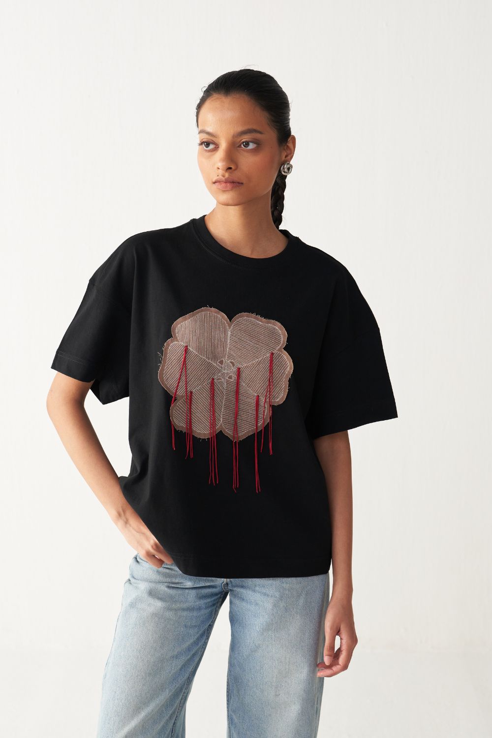 FLORAL FRINGE T-SHIRT+DENIM-BLACK