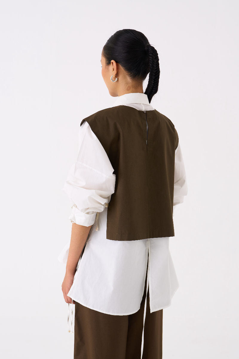 PANELLED SHIRT-OVERLAY: DARK OLIVE SHIRT : WHITE