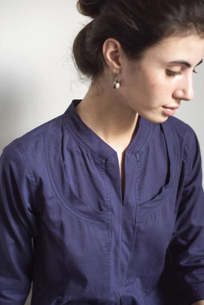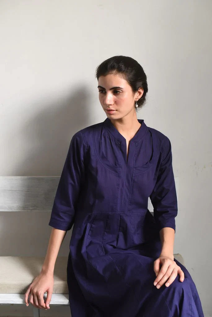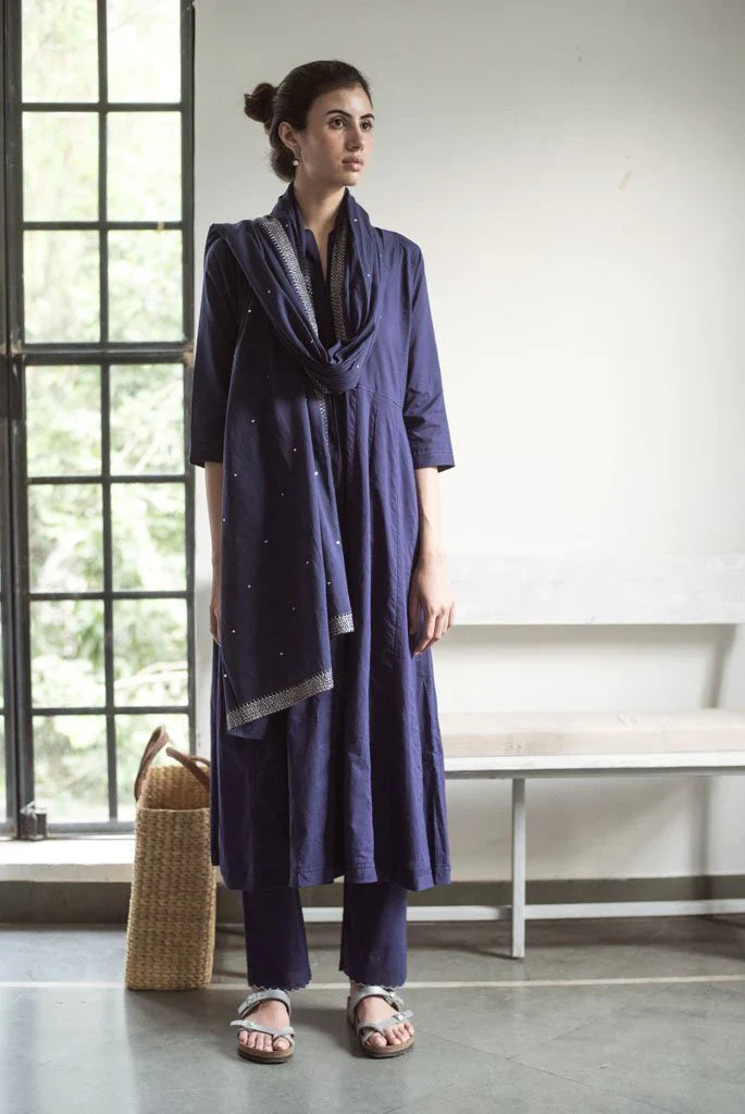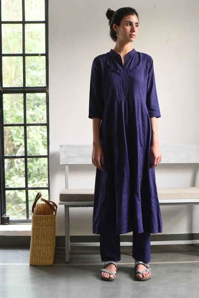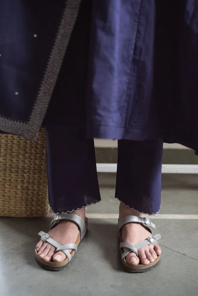 Kalidaar kurta in our signature Rajasthani neckline, inspired by the "Kurti Kaanchli" of Rajasthani women.It is seen here paired with straight cotton scalloped edge pants.