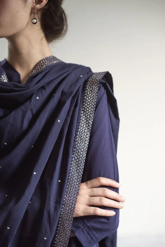 Indigo colored cotton mul Dupatta with hand embroidered silver sari thread jaali border &silver sequins hand sewn .