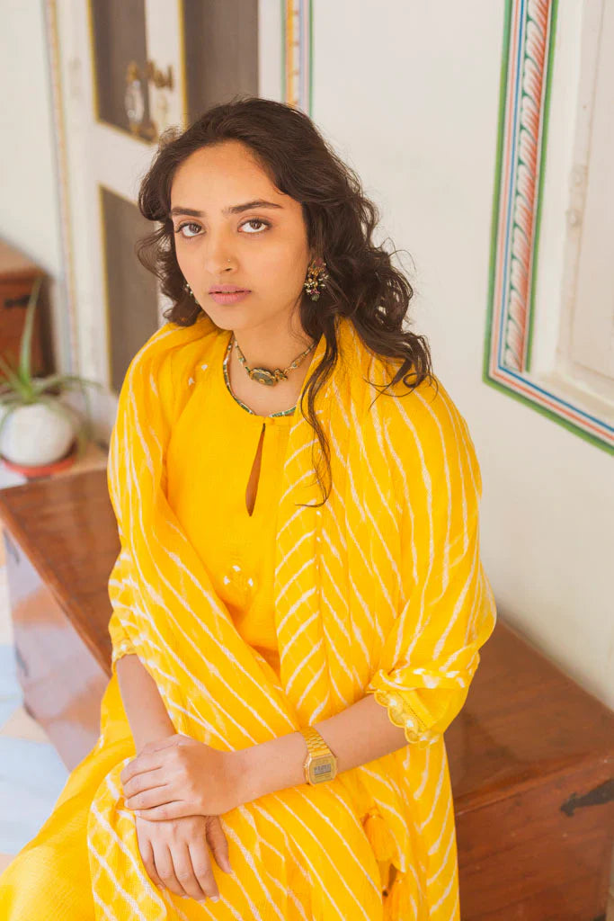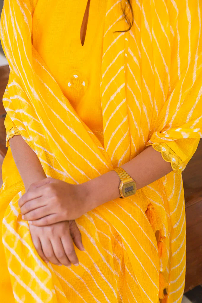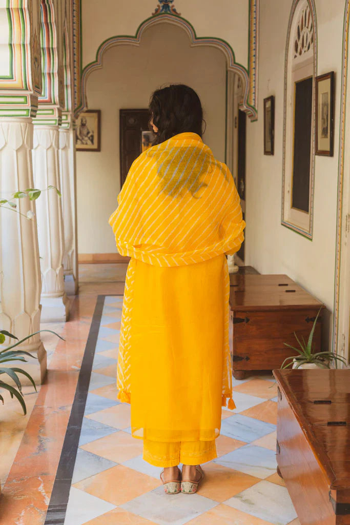 This set of 3 includes a Kota Doria dupatta in mango leheriya tied by our partner craftsmen in Shekhawati. The kurta is embroidered with a floral motif inspired by the gulmohar flower petal. This floral motif is embroidered in Resham threads & offset with little pearls .The kurta comes with an attached mulmul lining.The sleeves have a beautiful monotone scallop thread lace made by our in house atisans..This outfit is offset with kesariya coloured pants with a floral motif with zari thread stuck detailing.