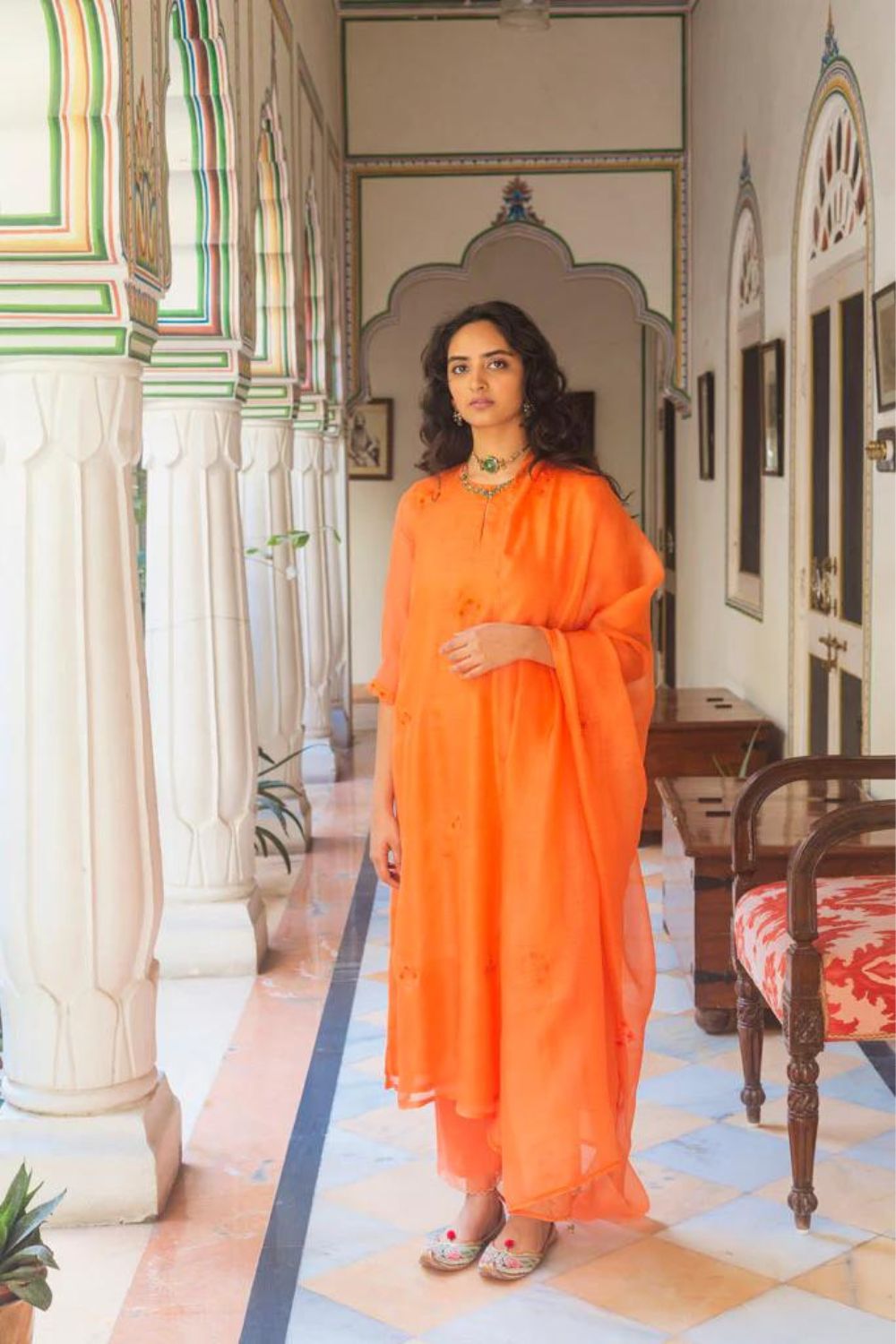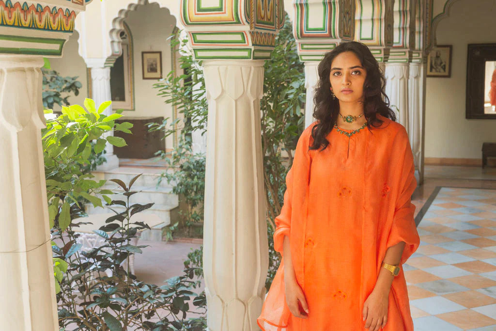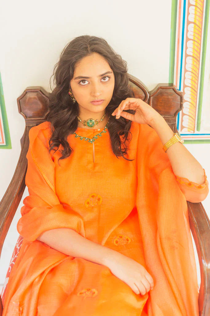 This set of 3 includes a hand-spun Kota silk dupatta in kesariya colour, embroidered with gulmohar petal inspired motifs in pain gold zari thread.It is embroidered by our in-house embroiders, the edges of which are offset with little ghungroos.