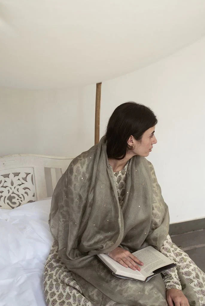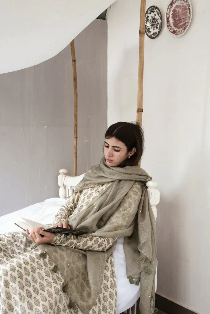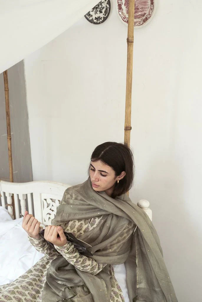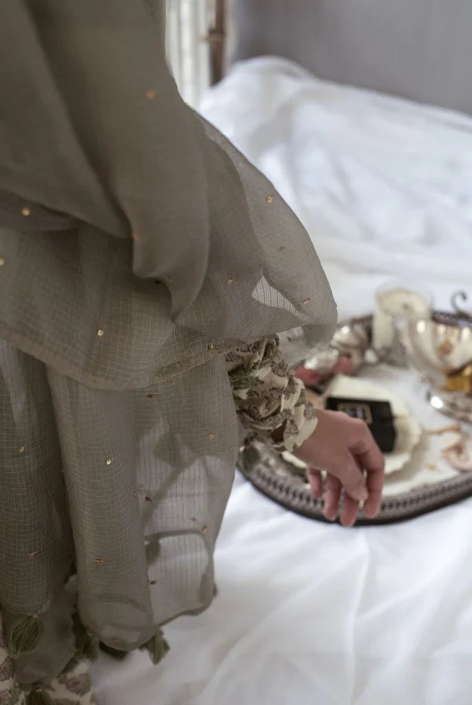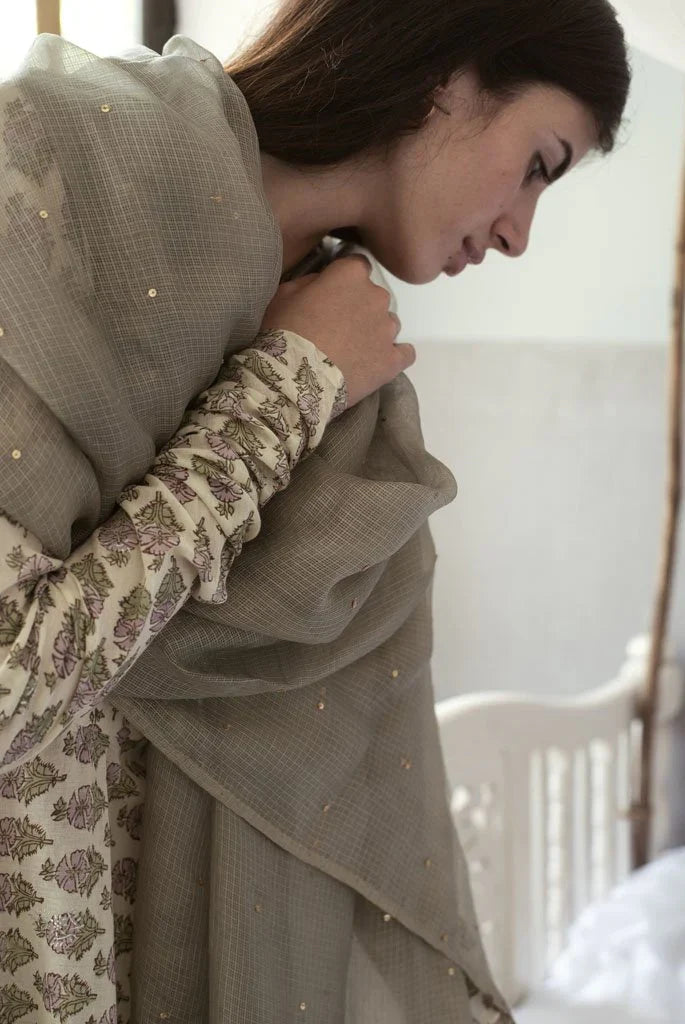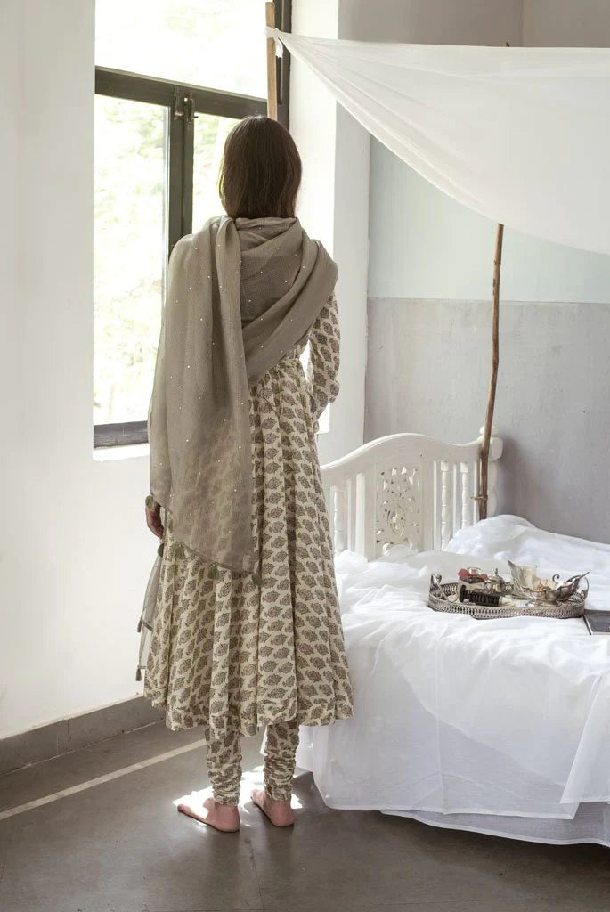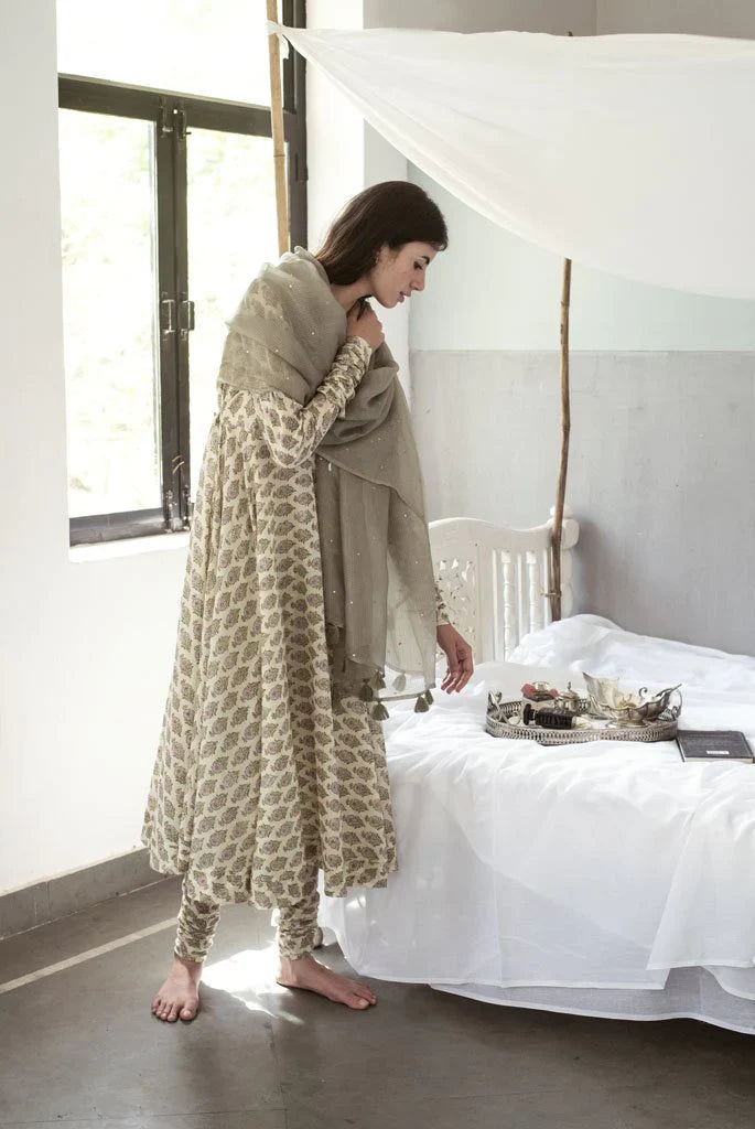 It has a back button closure and churidaar sleeves.It is paired with a churidaar and handspun Kota silk dupatta in mehendi green which has been embroidered with golden sequins "sitara" by our in house artisans .It is offset with monotone handmade thread tassels.