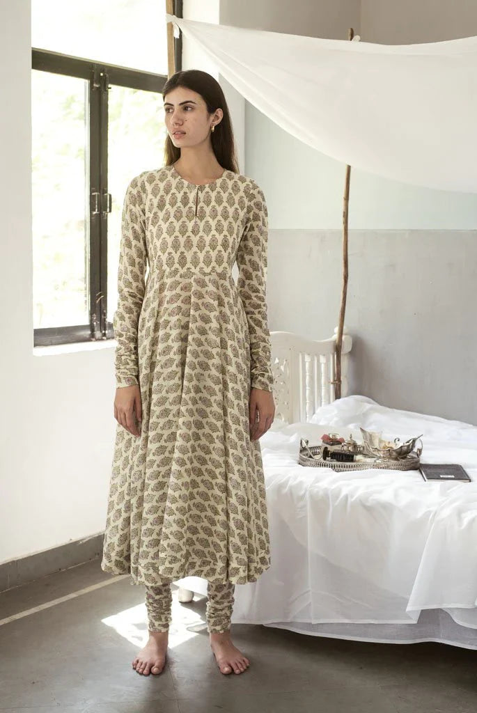 This hand block printed kalidaar has been block printed in a repeat pattern of lavender coloured Mughal style flowers in Sanganeri style of hand block printing.Our printing is done by artisans in the nearby village of Sanganer near Jaipur.