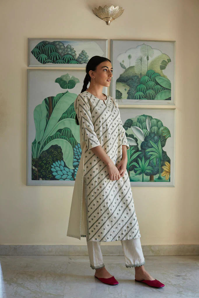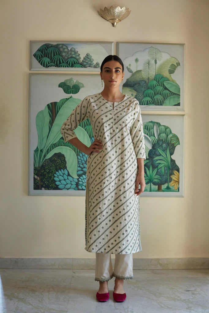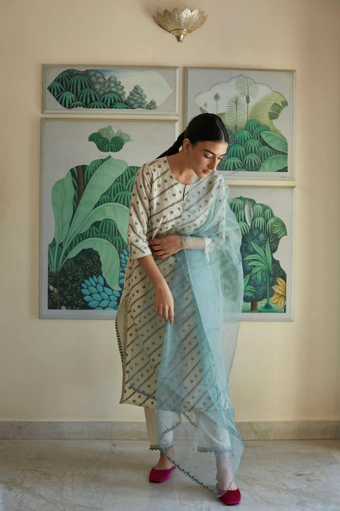 Cotton mul-mul, round edged long kurta, with hand hemmed silver ghungroos on the placcate and delicate silver "chaand" motif shadows emboirdered all over the front. Sleeve has mukaish work and monotone thread detailing. Dupatta is cotton mulmul with handmade silver chatai gota hand hemmed on it. Outfit is paired with an old fashioned narrow high salwar with bijiya edges.