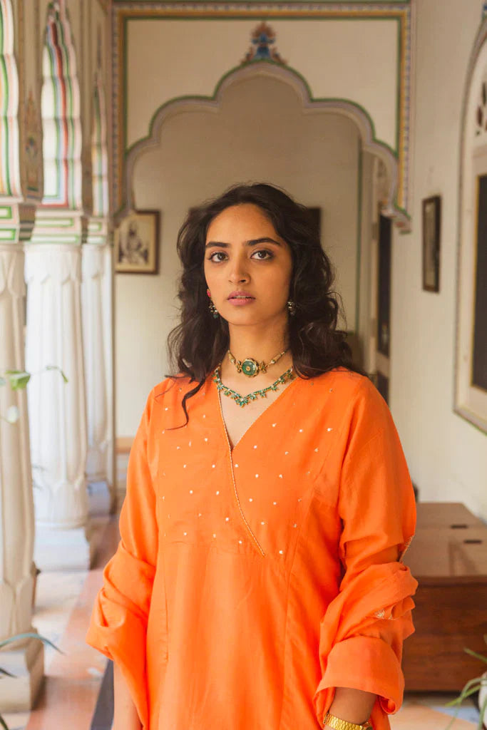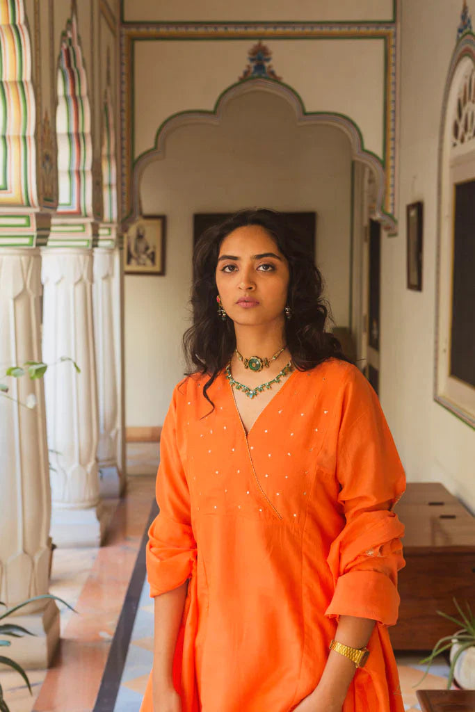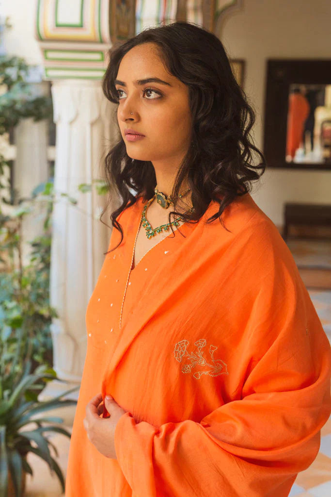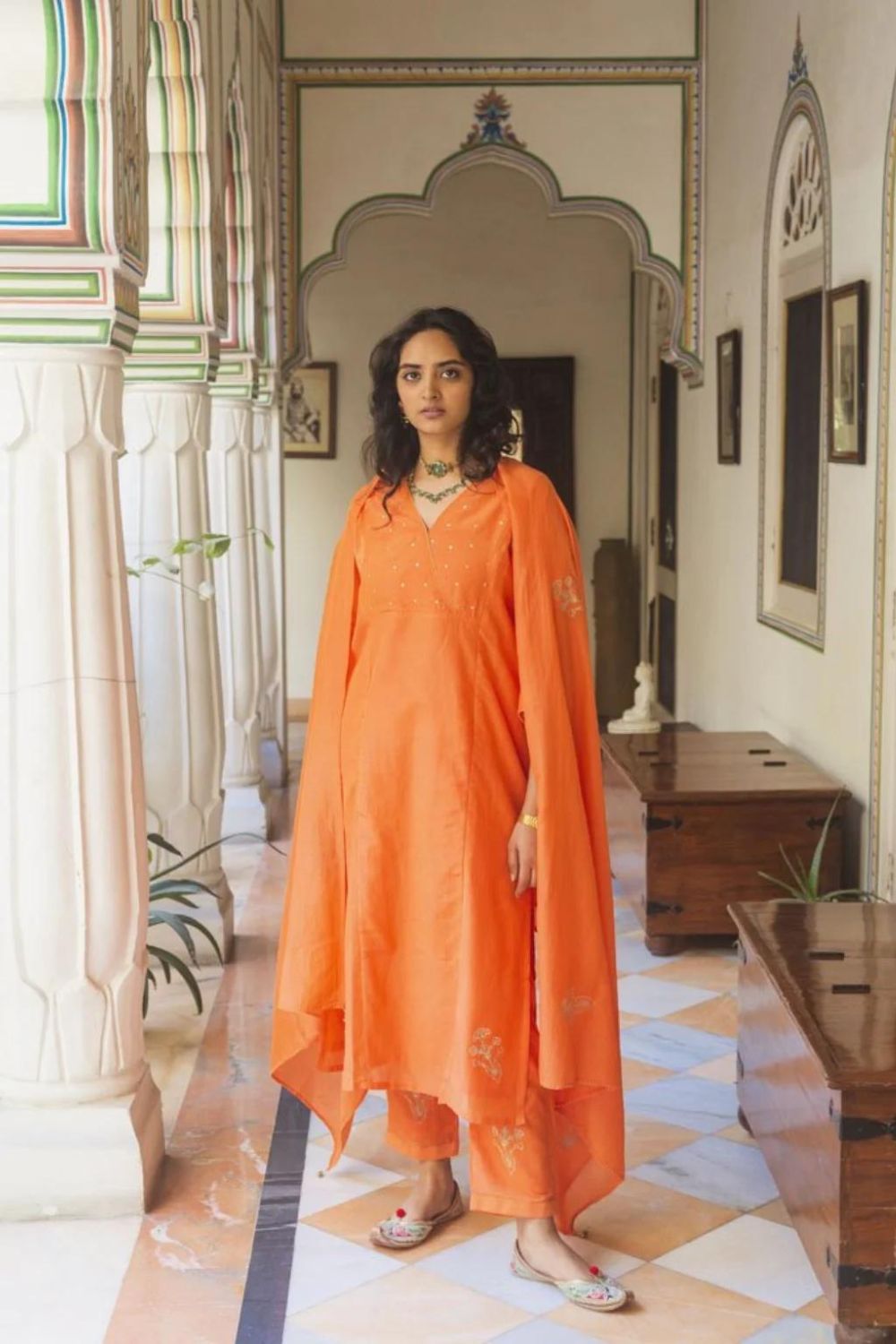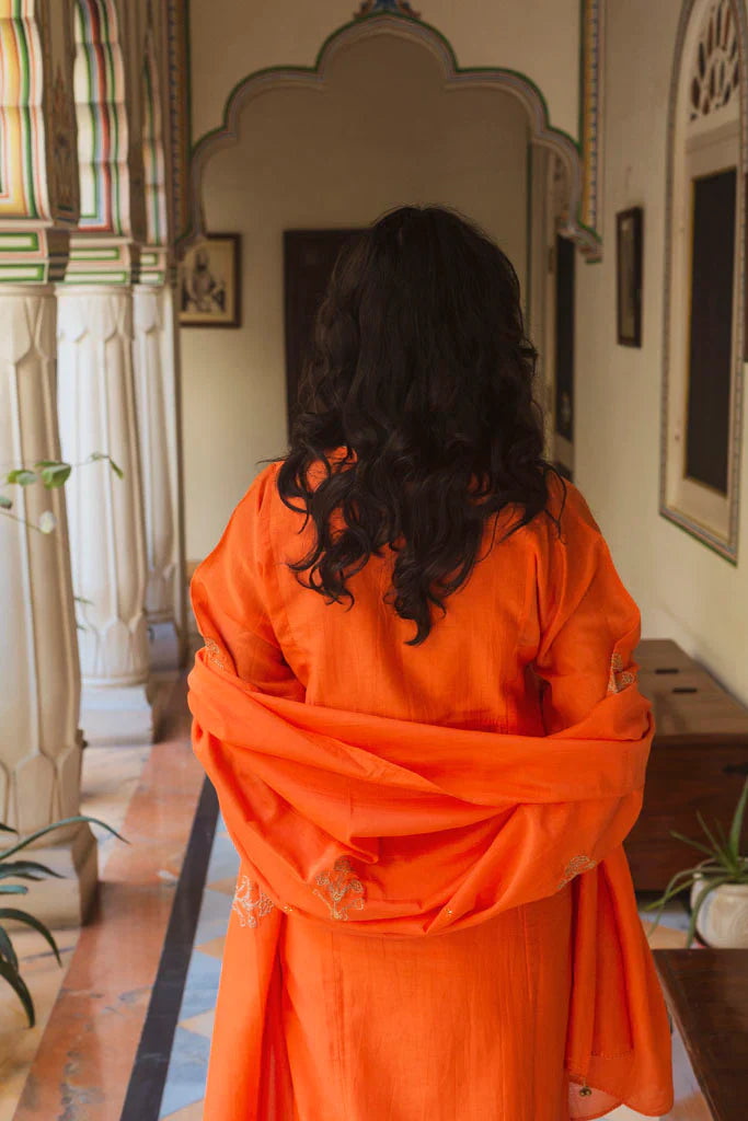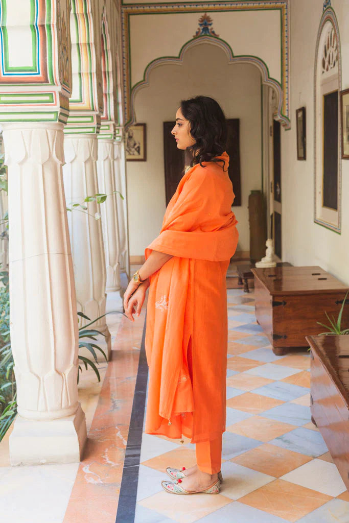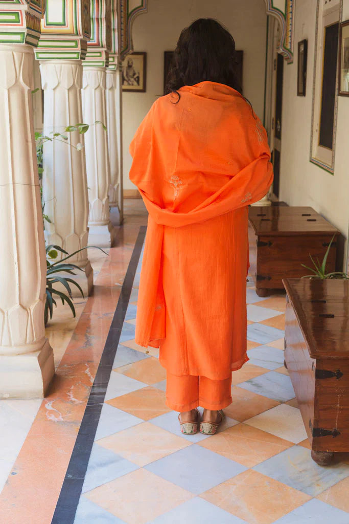 This is a kesariya coloured set of 3 cotton mul outfit, the kurta which has a crossover yolk embroidered with sequins ,and finished with a small glass beads embroidered by hand on the neckline .