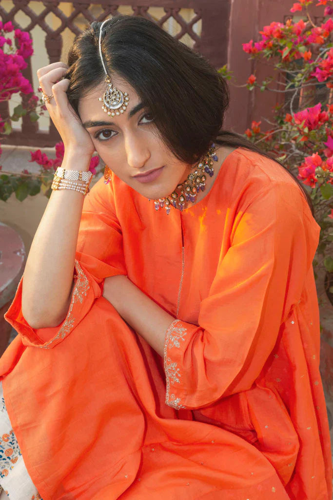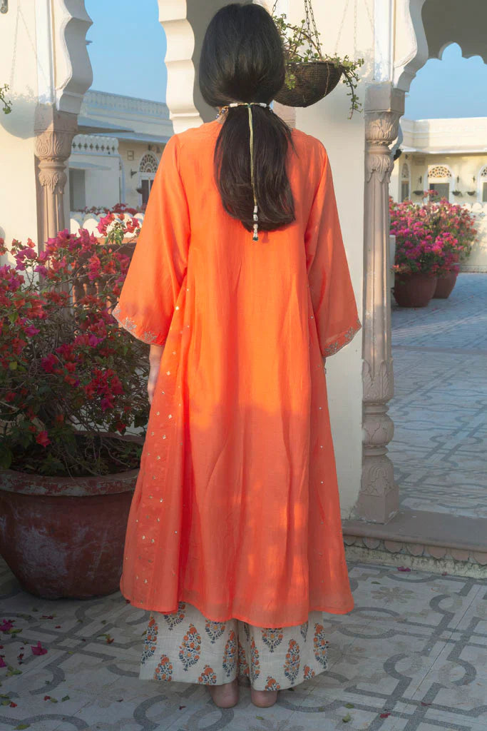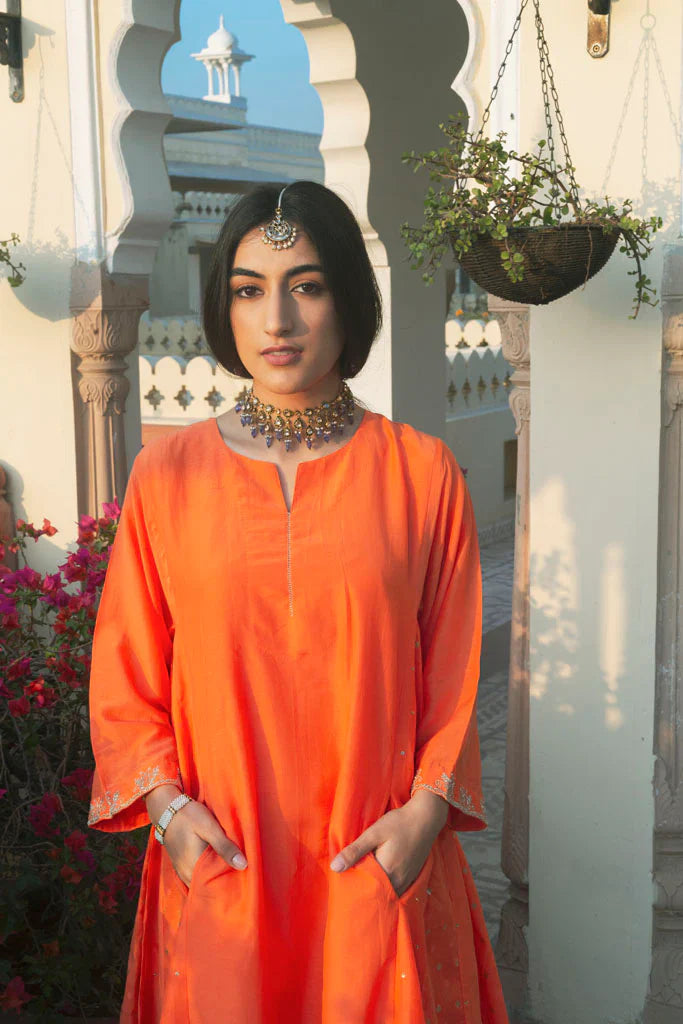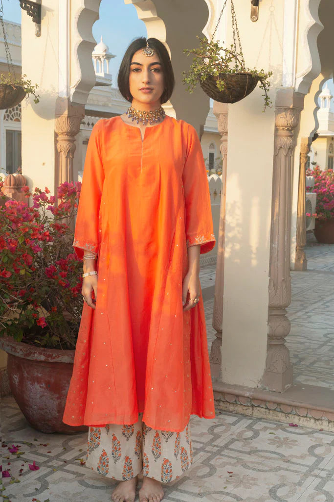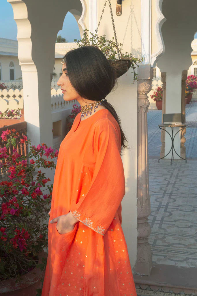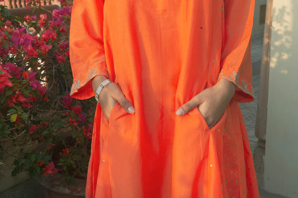 A large oversided ghabha inspired kurta in cotton silk.The kurta has concealed pockets in the front and has wide sleeves offset with a zari thread border embellished with cutdana ,the border has be en embroidered by our in-house master craftsmen. The body of the kurta is in cotton-silk in kesariya colour in a multi-panelled ghabha style.Panels are alternately embellished with hand embroidered tiny little sequins and chanderi jacquard fabric with woven zari bootis.
