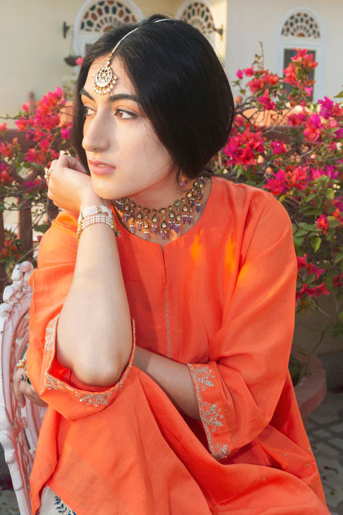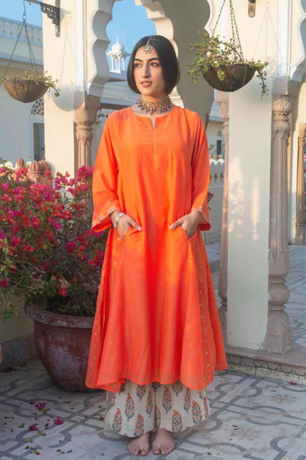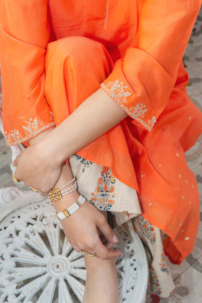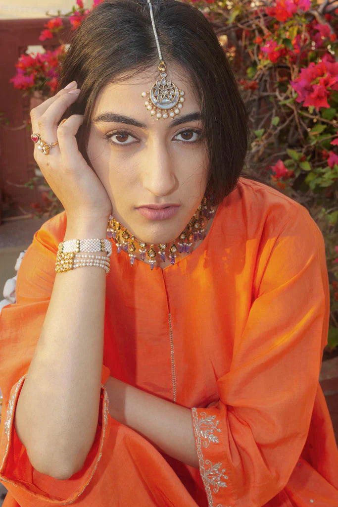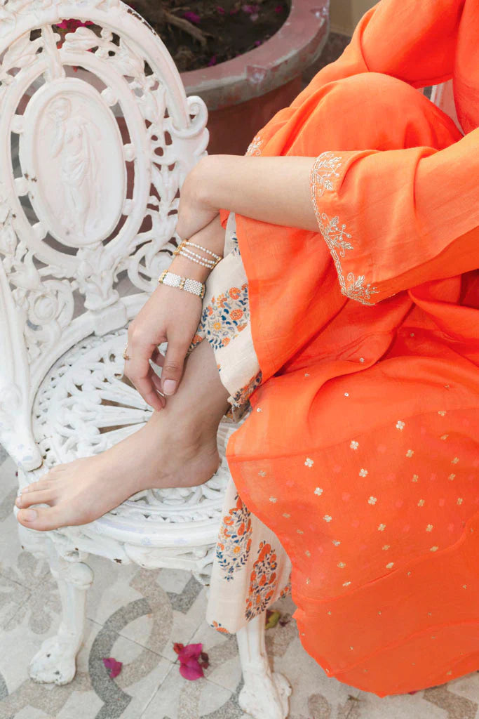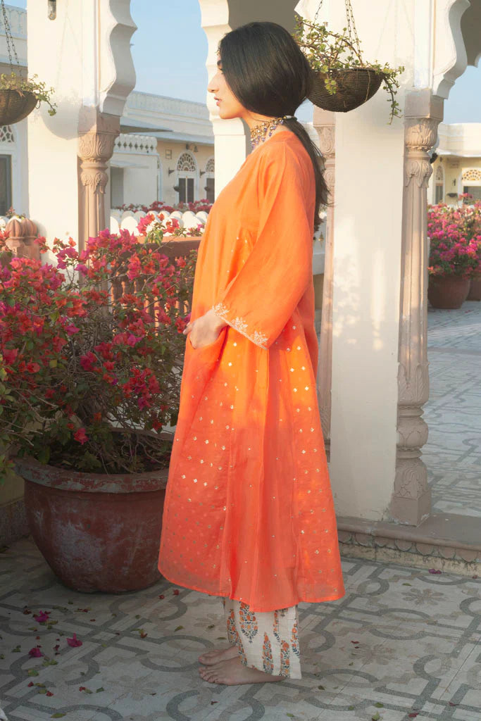 A large oversided ghabha inspired kurta in cotton silk.The kurta has concealed pockets in the front and has wide sleeves offset with a zari thread border embellished with cutdana ,the border has be en embroidered by our in-house master craftsmen. The body of the kurta is in cotton-silk in kesariya colour in a multi-panelled ghabha style.Panels are alternately embellished with hand embroidered tiny little sequins and chanderi jacquard fabric with woven zari bootis.