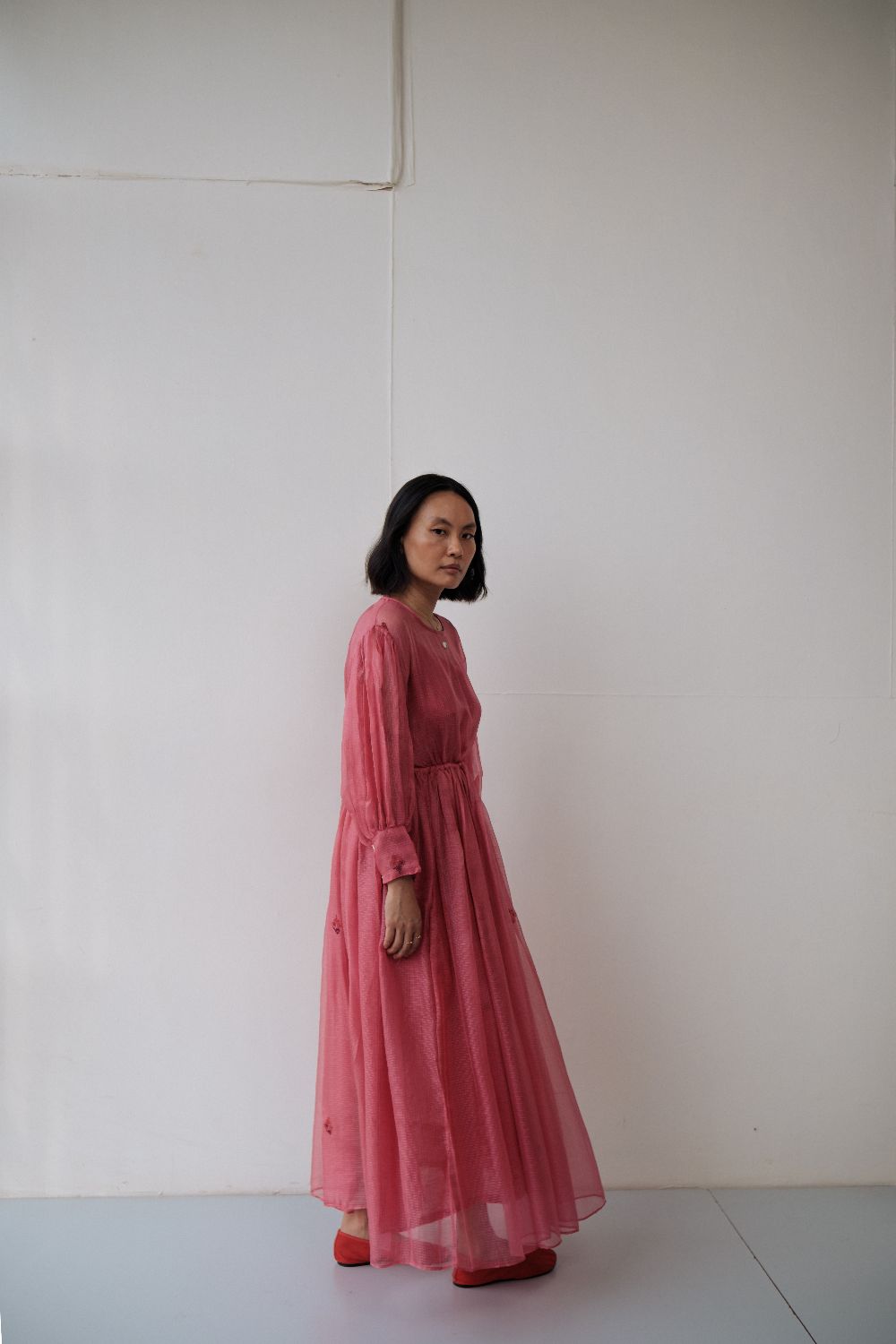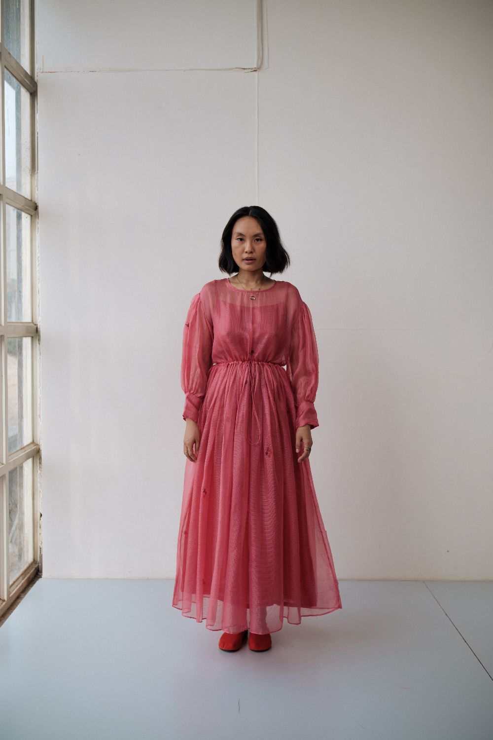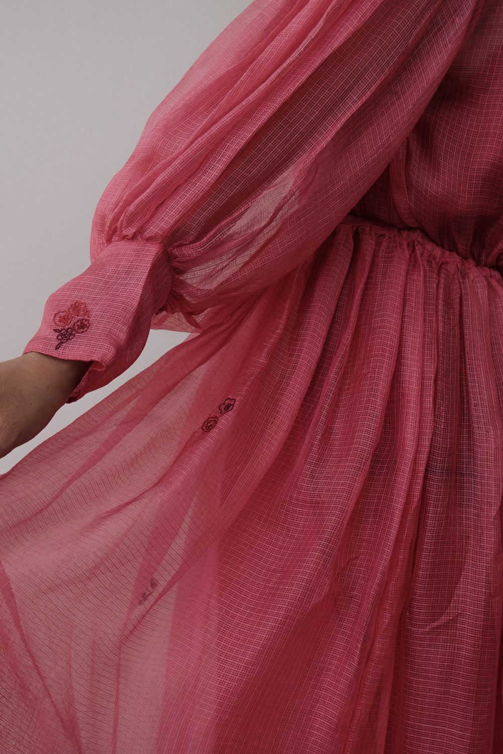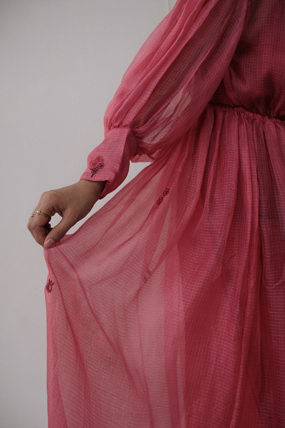 Kota Silk fabric dress embroidered by hand in monotonal flowers . This gathered dress is paired here with cotton slip dress .