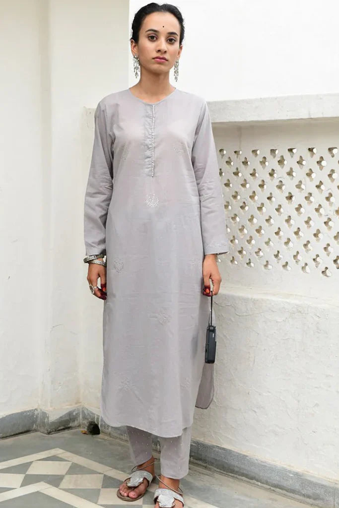 Set of 3 includes: Grey ghunghru mukesh kurta Grey tara salwar Grey sitara dupatta