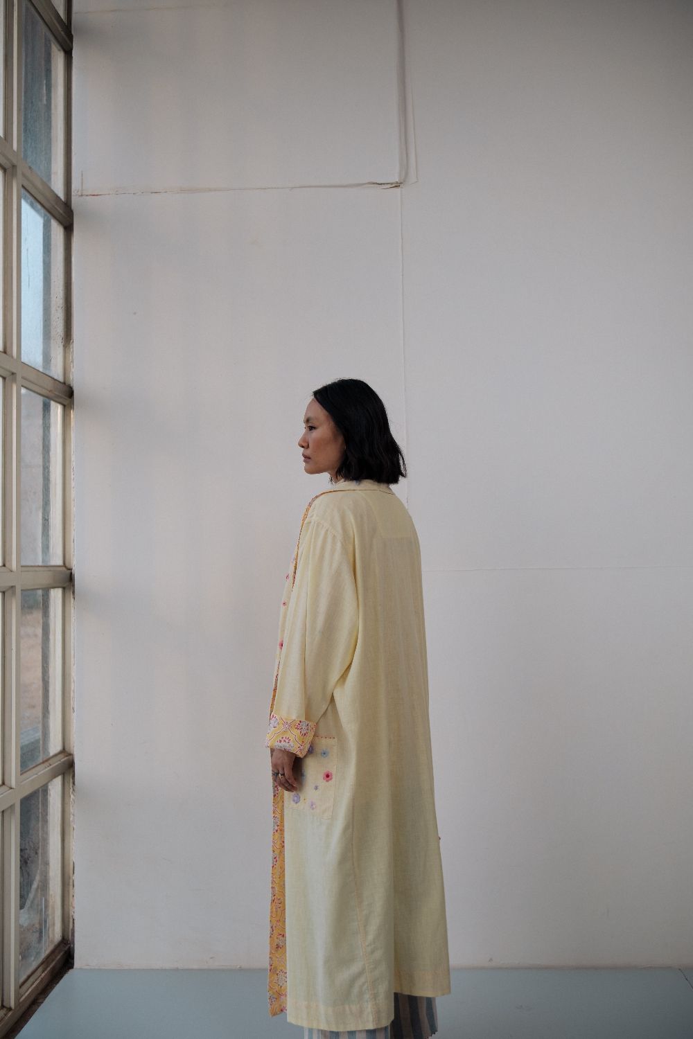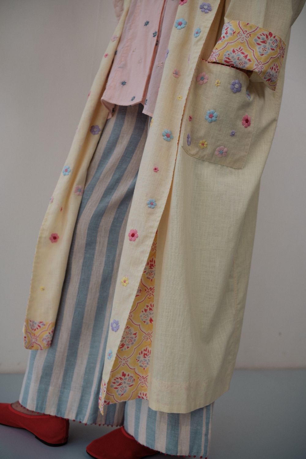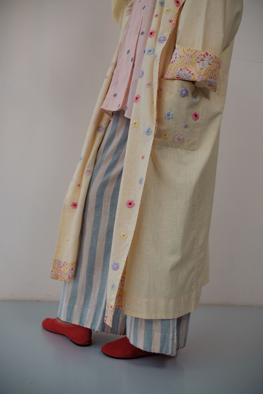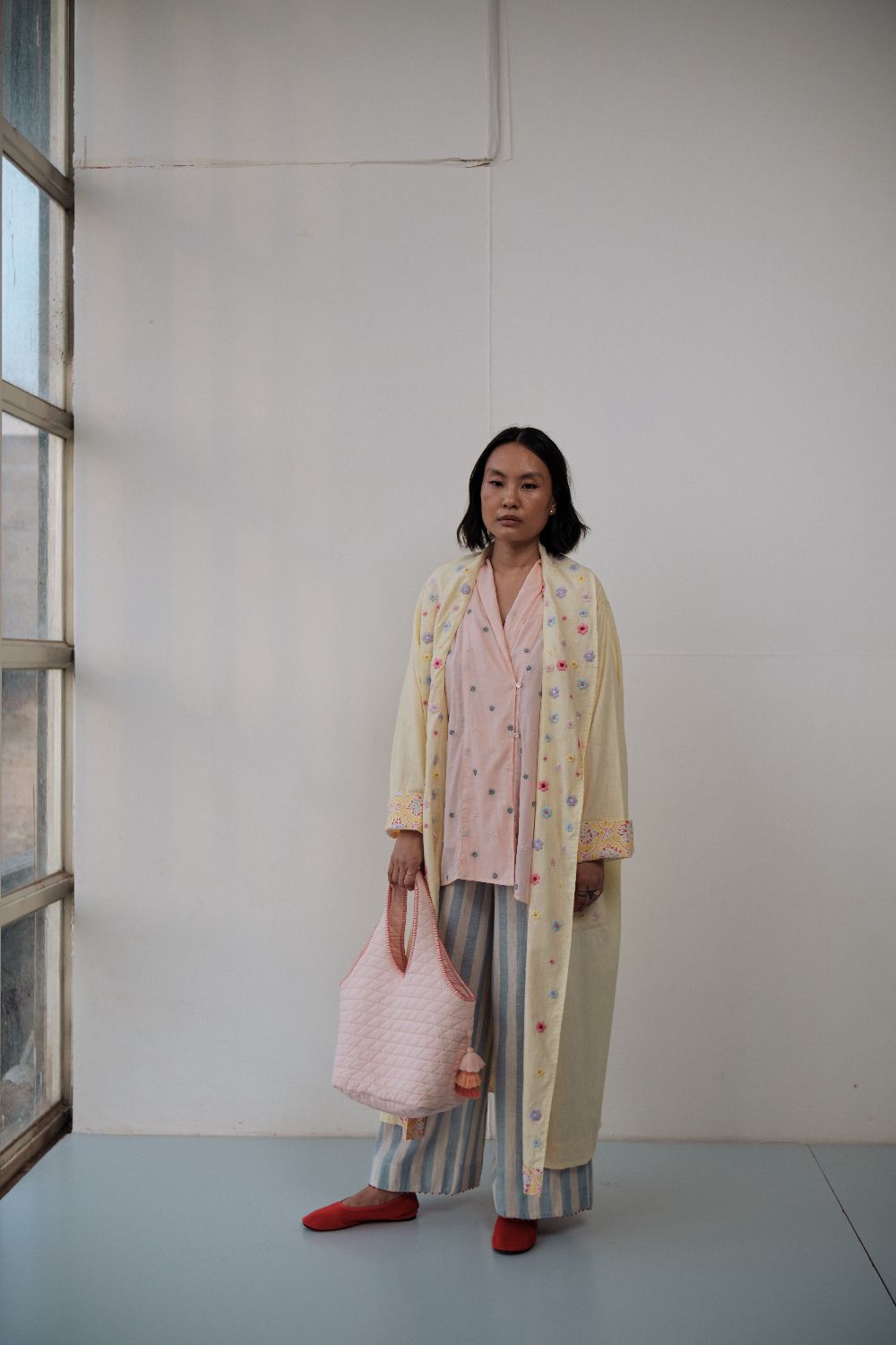 The silhouettes are simple but considered: relaxed cuts, thoughtful details, and fabrics that breathe — from handwoven cottons to delicately finished textiles rooted in Rajasthan’s craft culture. Colours stay close to the earth: muted florals, soft neutrals, and tones that age gracefully rather than fall out of season.