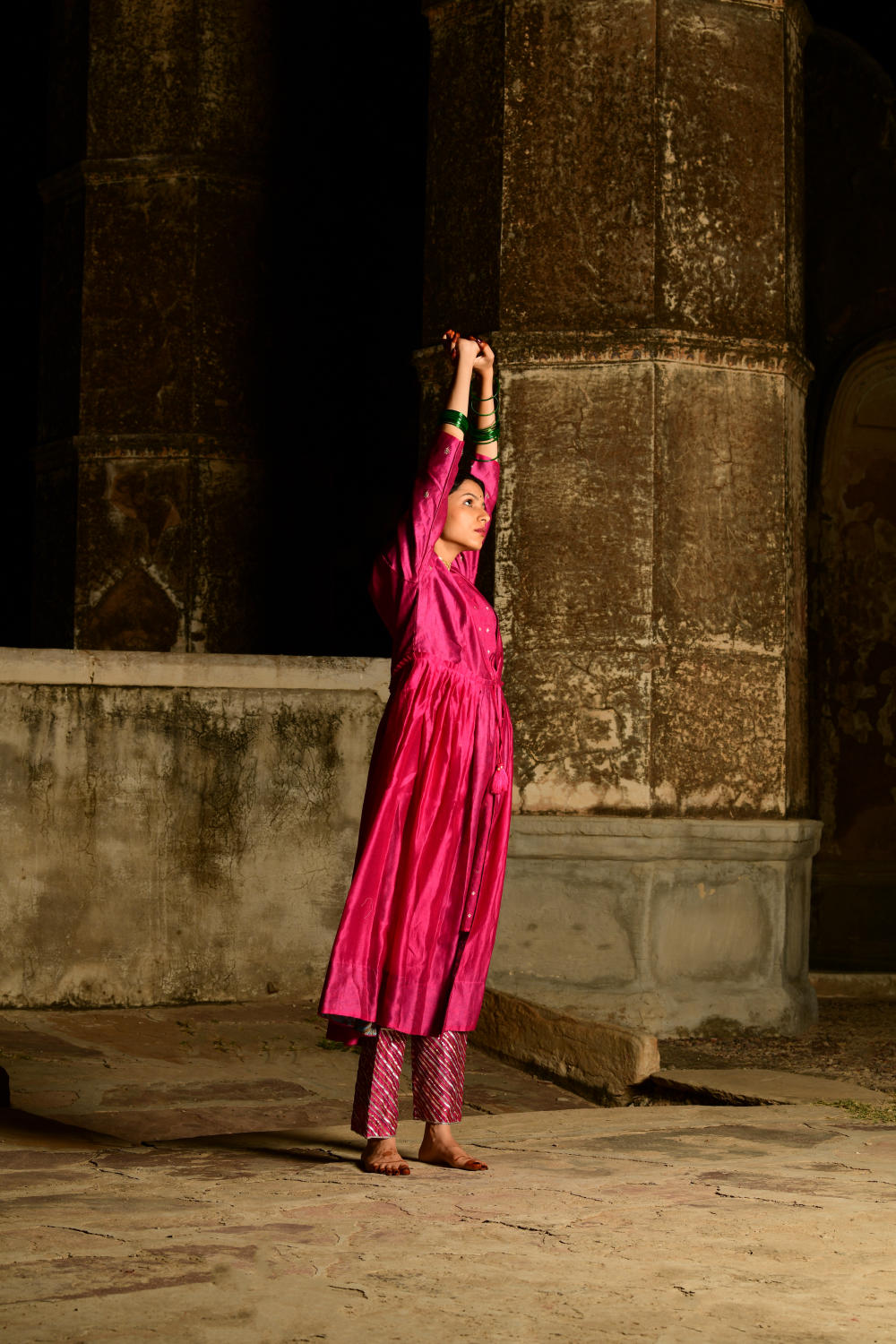 Handspun Rani pink chanderi kurta with knife pleats on the waist. Outfit is a 2 piece set at comes with a front tie with handmade resham tassels.Inner slip is a chanderi jaquard fabric woven with small silver mughal booties. Sleeves are embroidered with mukaish silver-gold flowers on them.Pants are also in chanderi embroidered with gota and sequins lines in a horizonatal fashion.Pants come with an elastic back and front tie for comfortable wear.Lining used is of cotton mumul handblock printed in a mughal buta inspired from Amer in Jaipur.