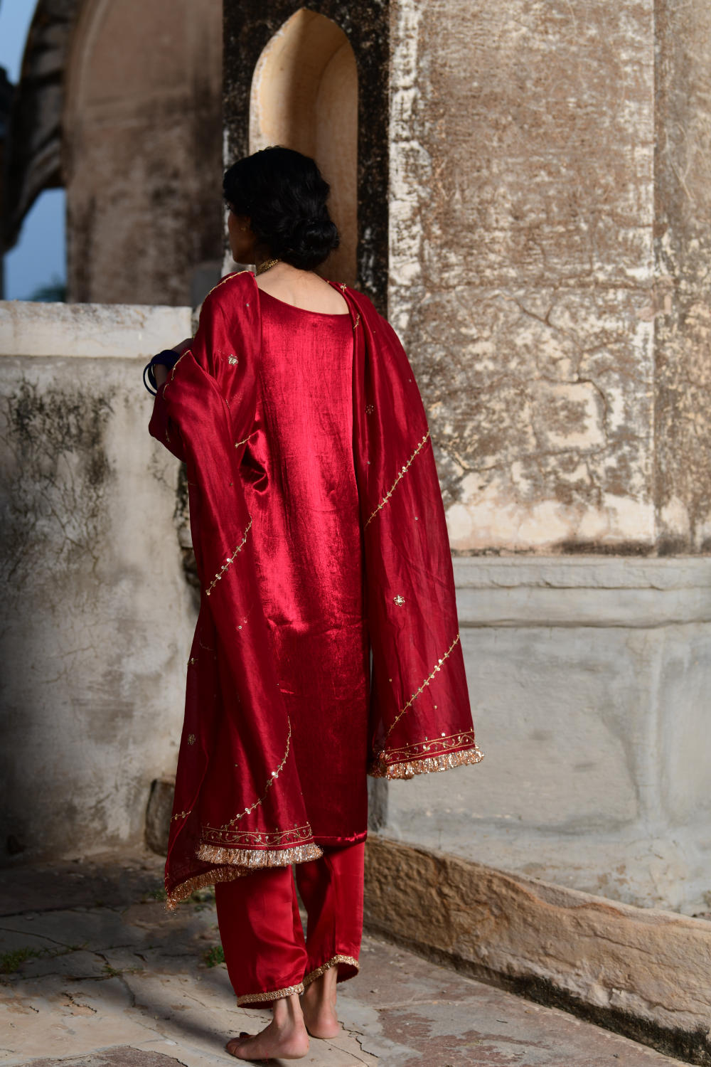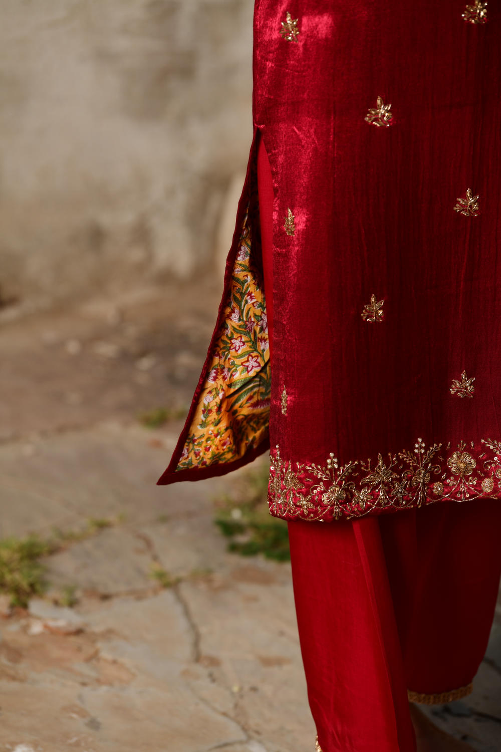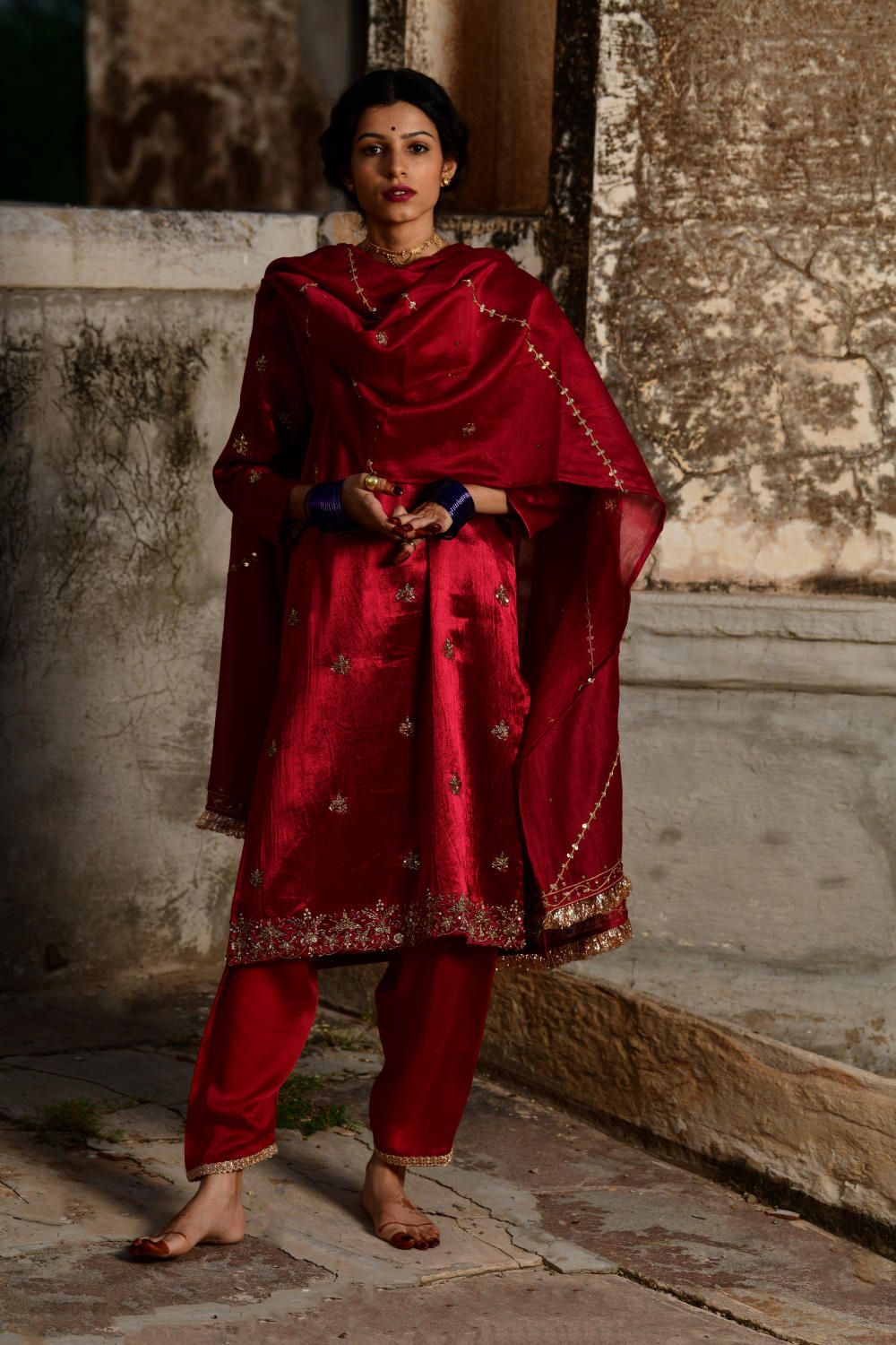 Ruby red mashru kurta and satin salwar with GOLD zardozi hand embroidery, and a cotton chanderi dupatta with dabka with hand scalloped edges. Ruby red with gold embellishments. Lining used is in the kurta is of cotton mumul handblock printed in a yellow mughal buta inspired from Amer in Jaipur.