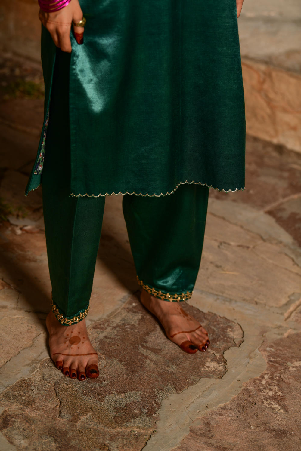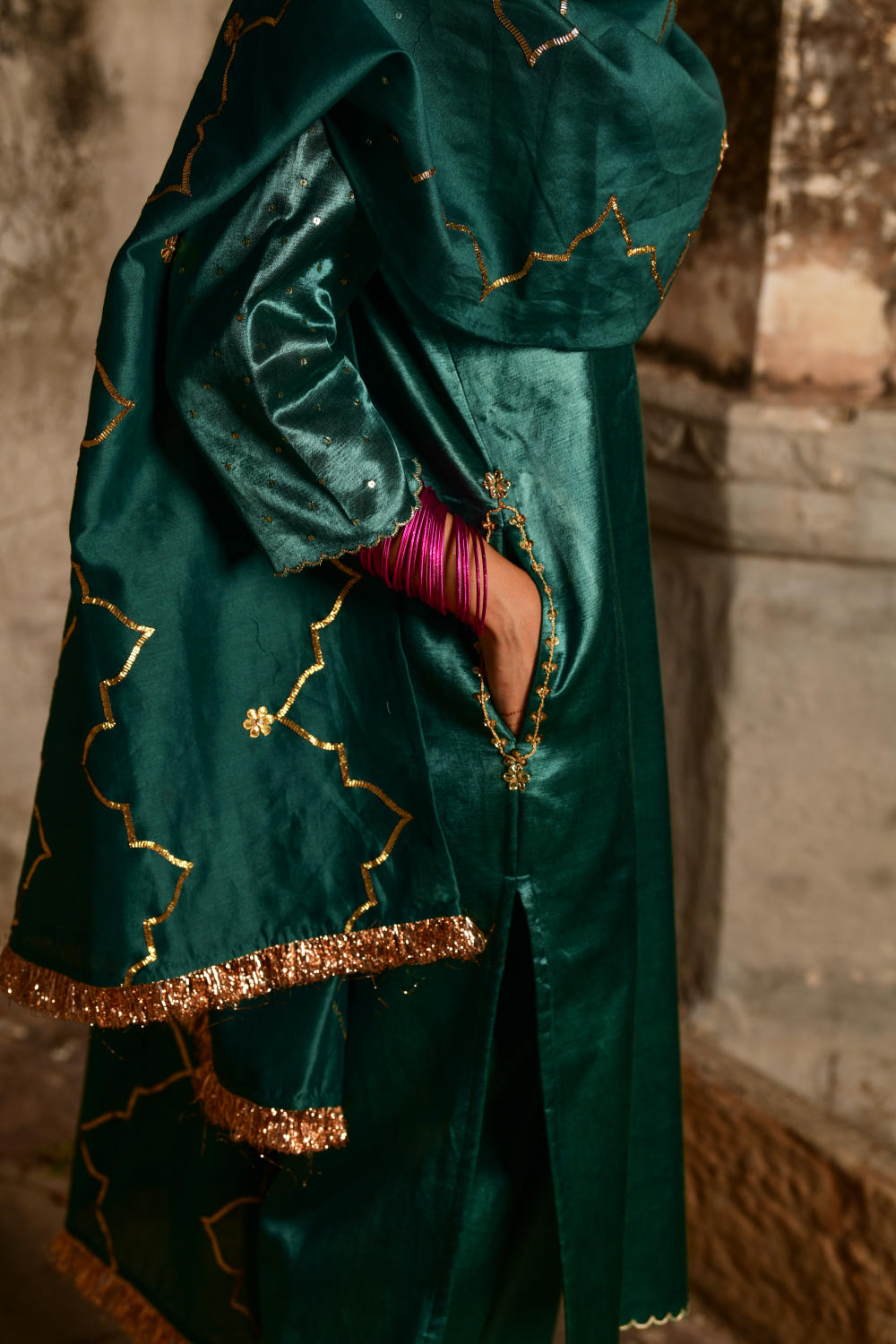 Emerald green Mashru fabric kurta & salwar with hand spun chanderi dupatta embroidered with gota emboidery and old fashioned metallic kiran. Kurta side pockets are accentated with a zardozi as are the hems of the narrow salwar. Lining is cotton hand block printed mughal boota jaali pattern in a contrasting colour. Emerald green and gold zardozi.