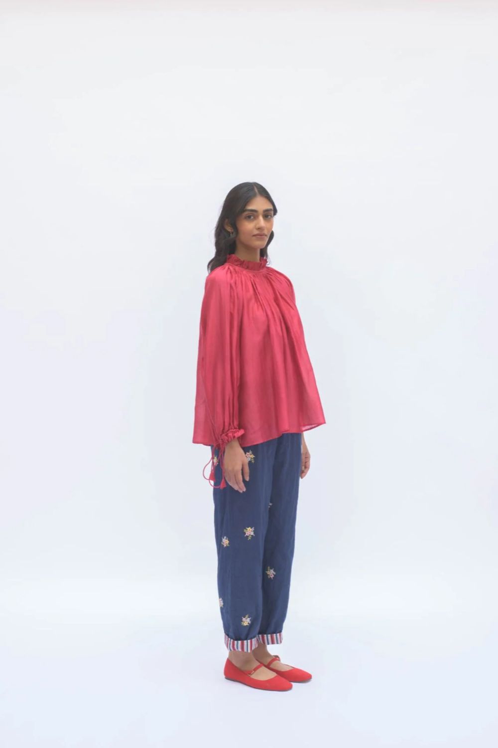 Cotton pants are layered and stitched with bunches of flowers hand-embroidered on them, and hand-block printed cotton turn up detailing. These pants are paired with handloom chanderi with handmade fabric buttons detailing, and neck gathers.It comes paired with a cotton slip top.