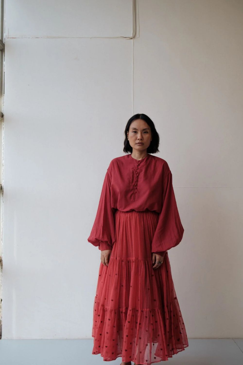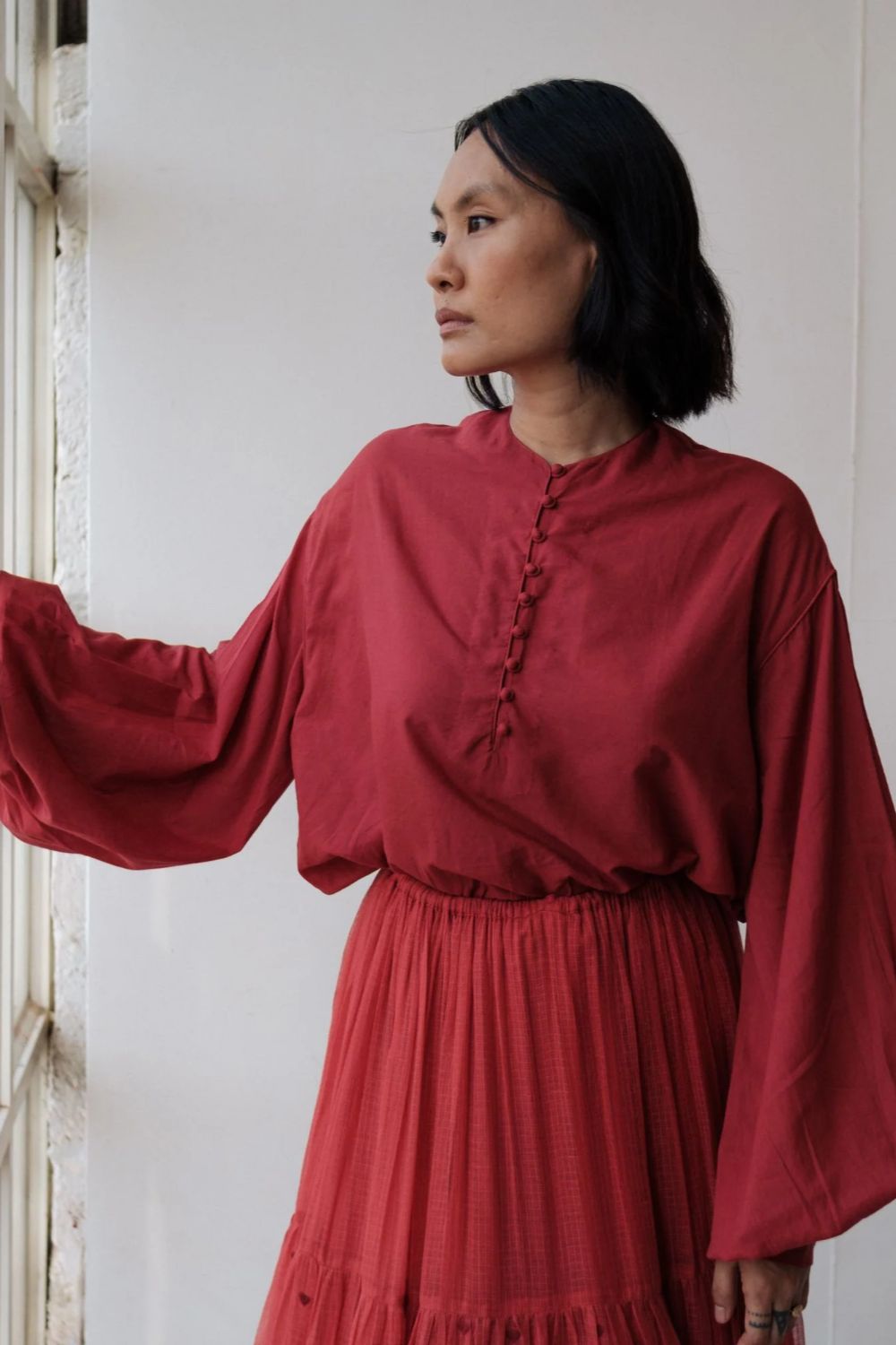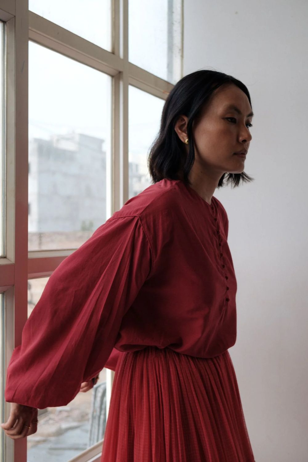 Hand spun cotton shirt in madder red with handmade fabric buttons.It is seen here paired with a skirt in handwoven Kota Doria