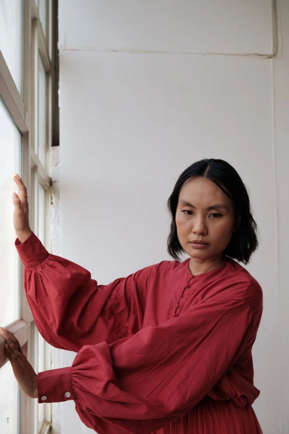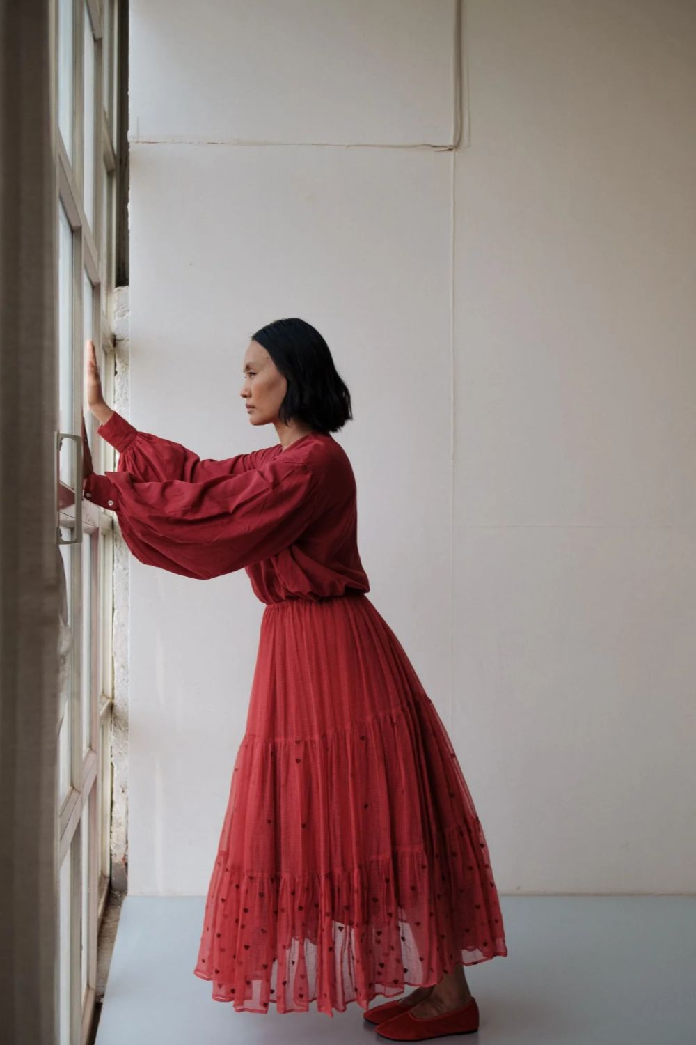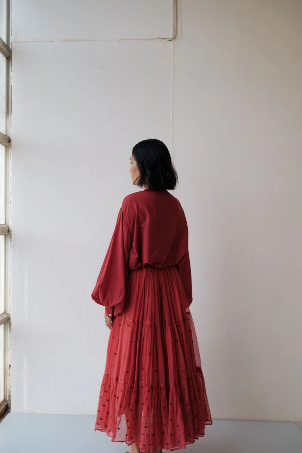 Hand spun cotton shirt in madder red with handmade fabric buttons.It is seen here paired with a skirt in handwoven Kota Doria