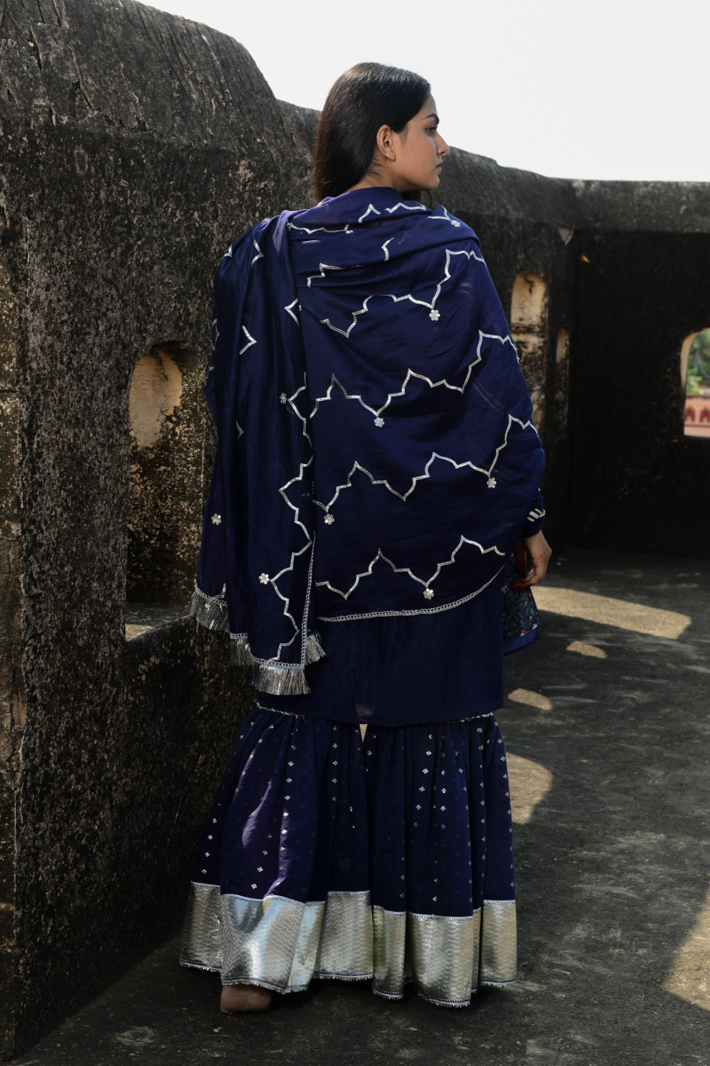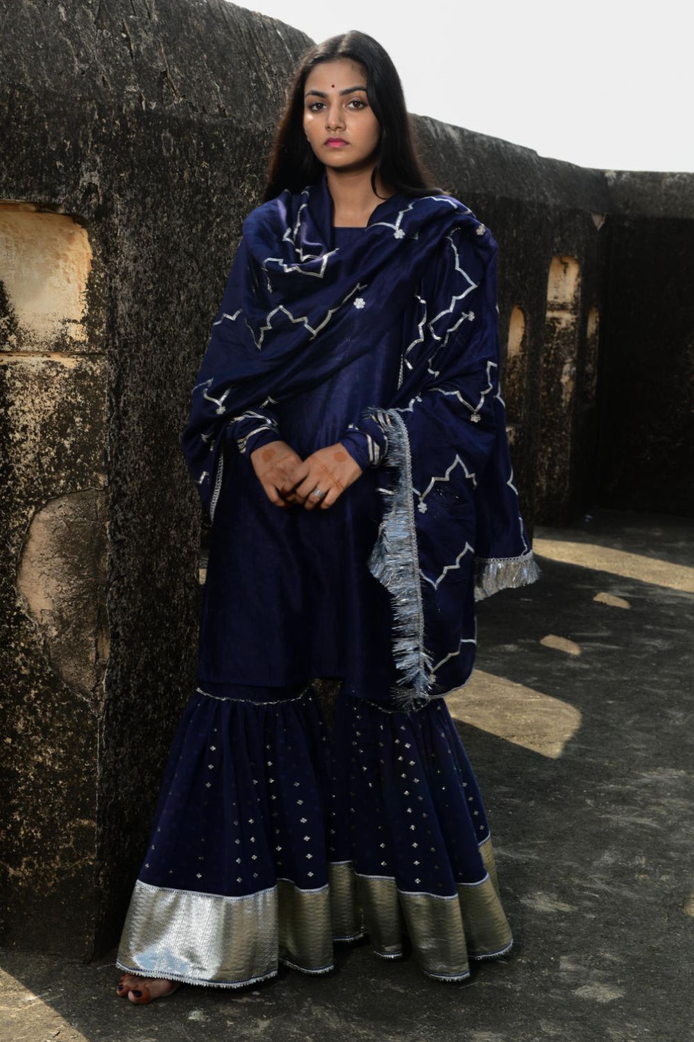 Sharara and kurti set in Chanderi with self woven metallic butis in a haldi colour with silver gotta lappha on the sharara. Kurti is a straight short kurti with churi sleeves accented with multiple gota lines. Outfit is paired with a chanderi dupatta with gota embroidery and border. Royal blue colour and silver embellishments. Lining is in hand block printed cotton mulmul in a contrasting mughal jaali print, inspired by Amber, Jaipur.