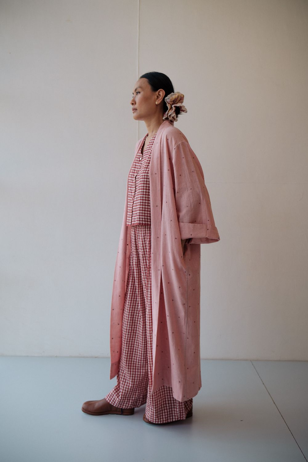 The silhouettes are simple but considered: relaxed cuts, thoughtful details, and fabrics that breathe — from handwoven cottons to delicately finished textiles rooted in Rajasthan’s craft culture. Colours stay close to the earth: muted florals, soft neutrals, and tones that age gracefully rather than fall out of season.
