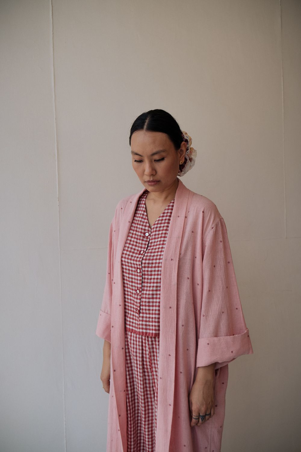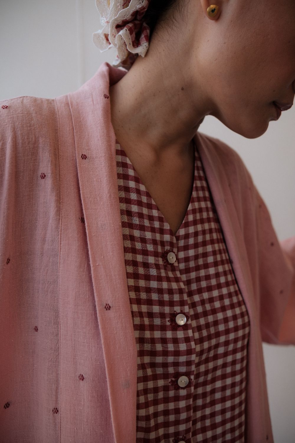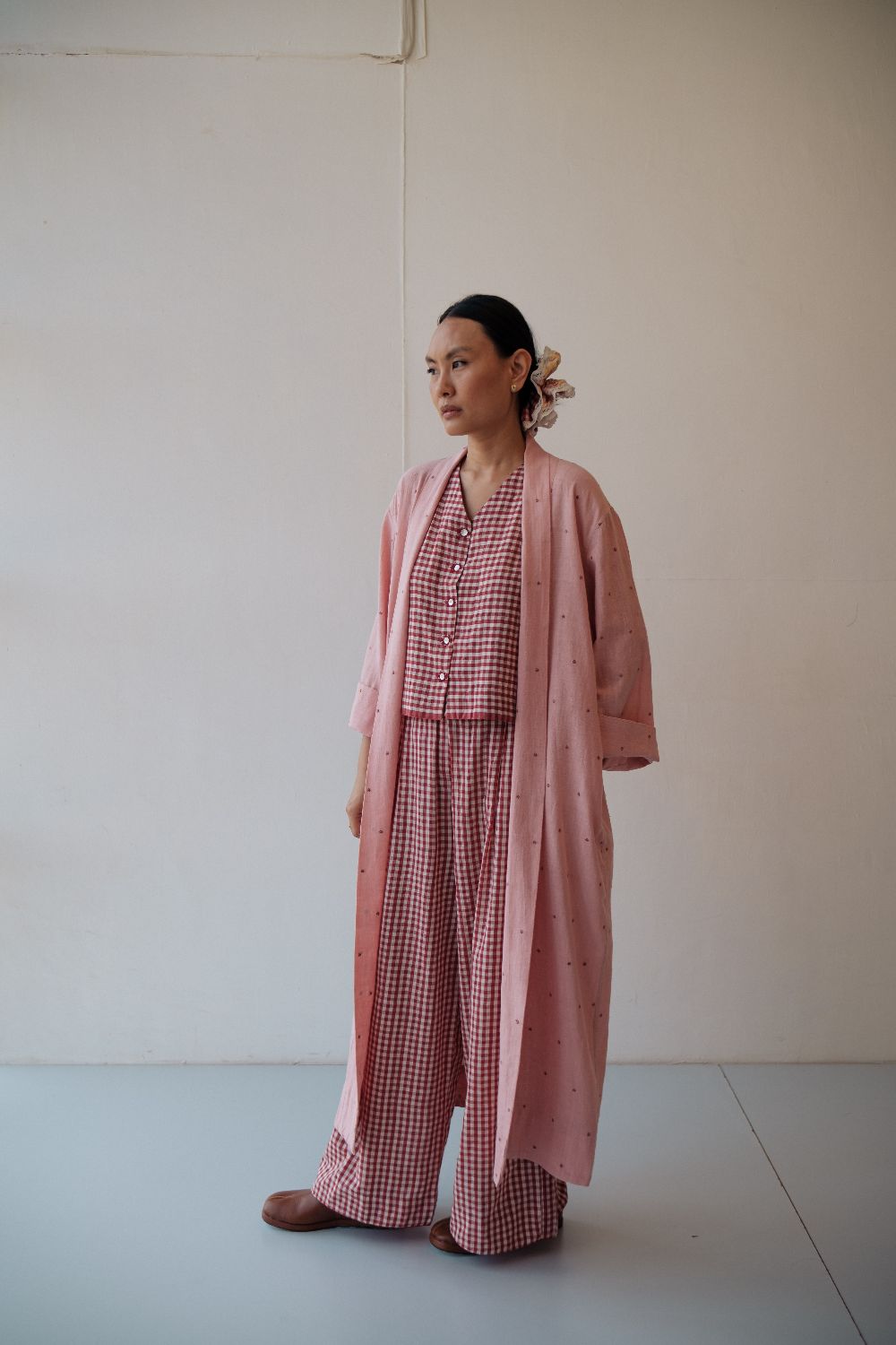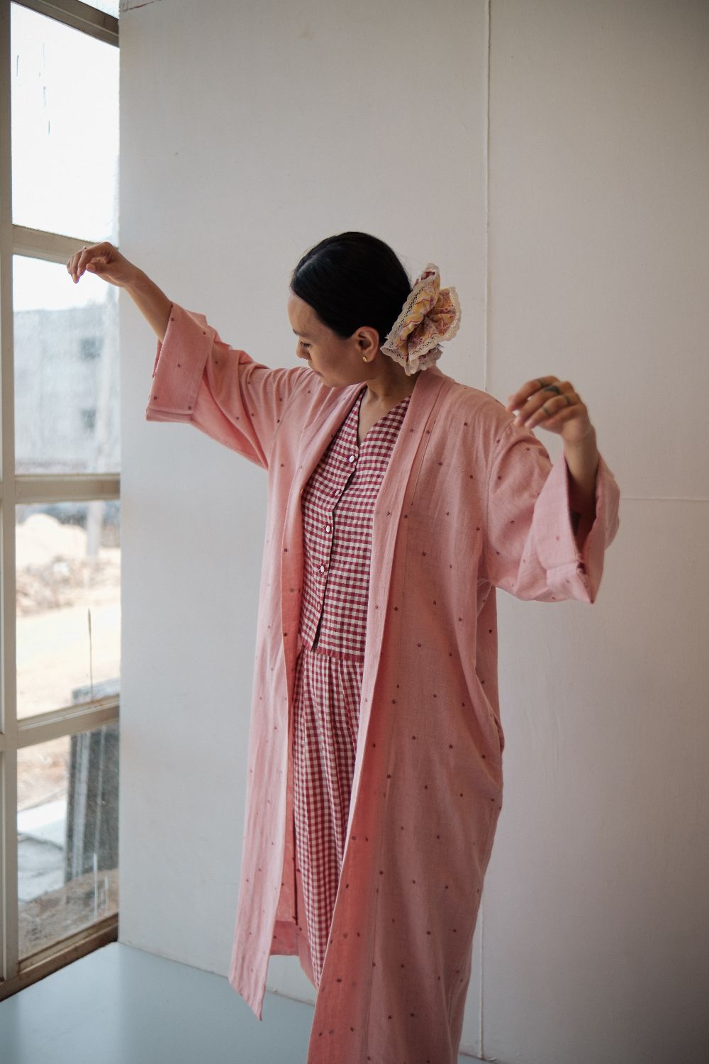The silhouettes are simple but considered: relaxed cuts, thoughtful details, and fabrics that breathe — from handwoven cottons to delicately finished textiles rooted in Rajasthan’s craft culture. Colours stay close to the earth: muted florals, soft neutrals, and tones that age gracefully rather than fall out of season.