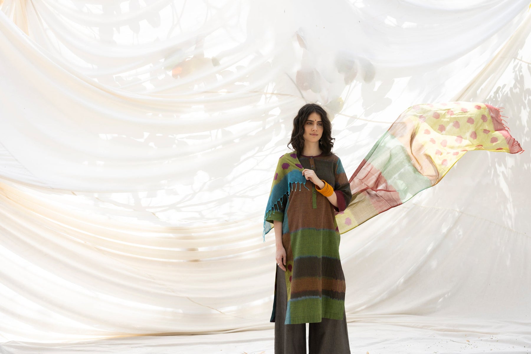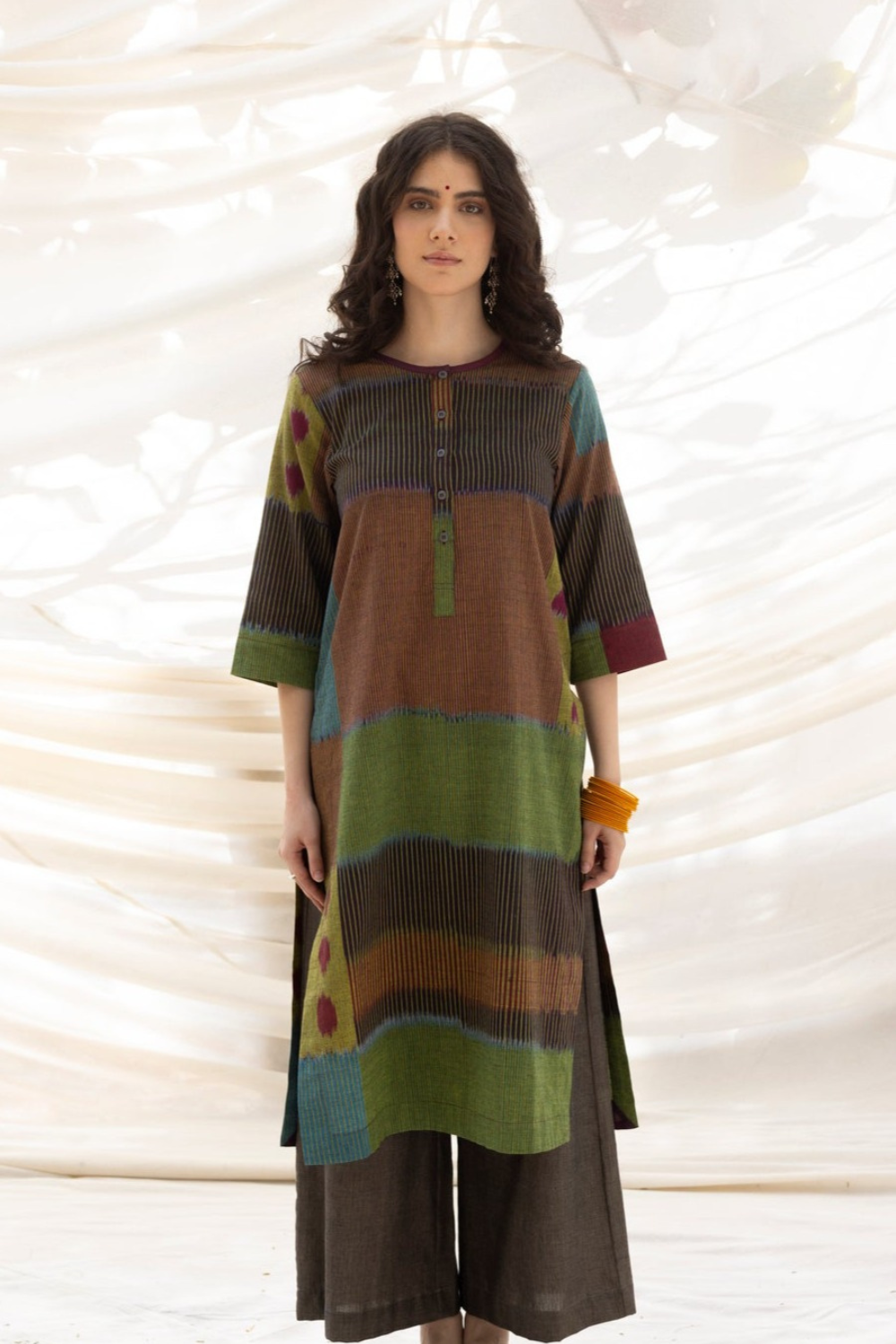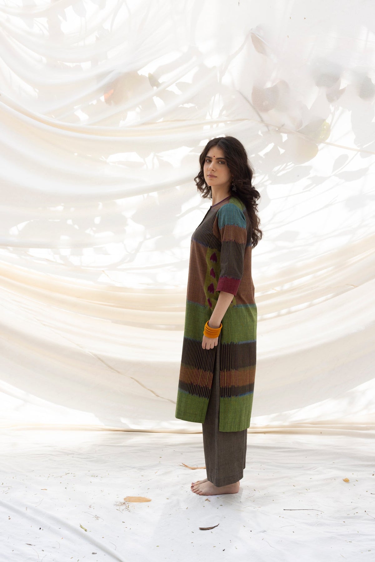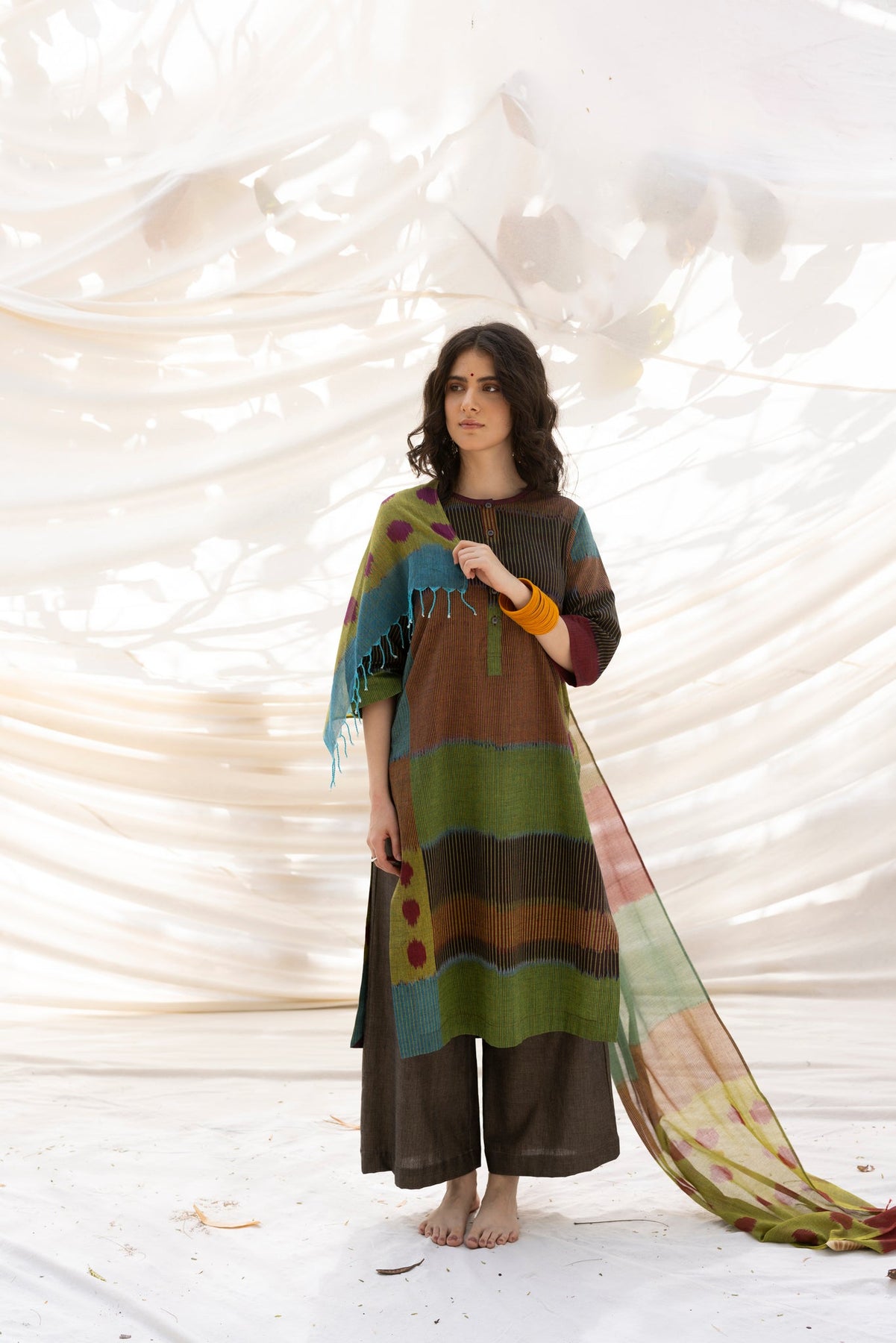 The 'TAAL' Ikat pattern captures the rhythmic essence of spring. The kurta features: