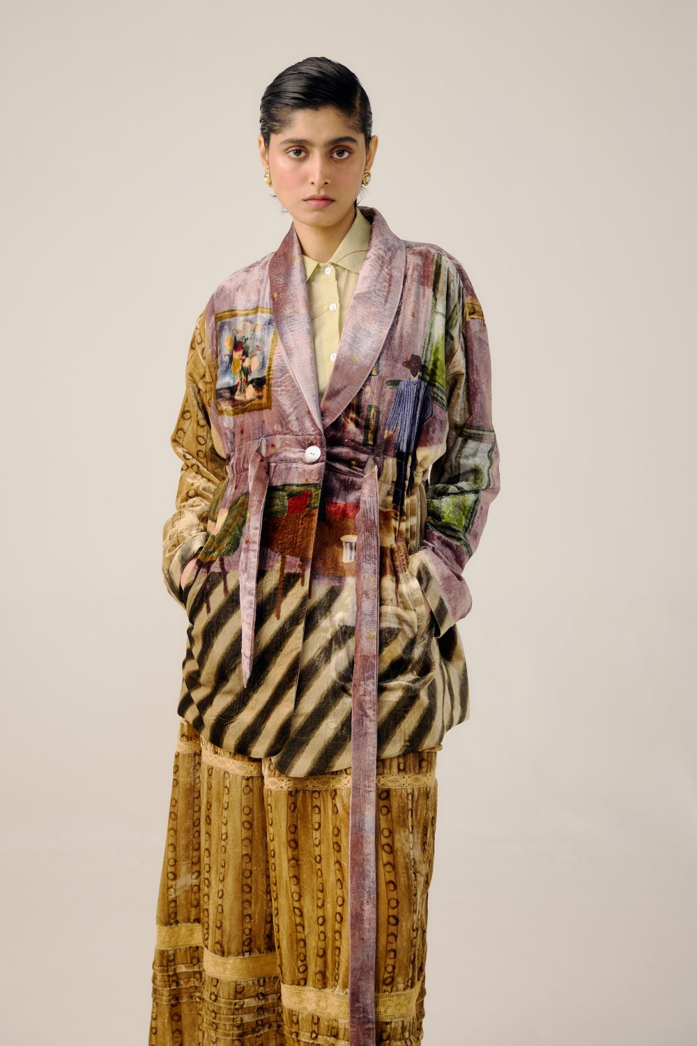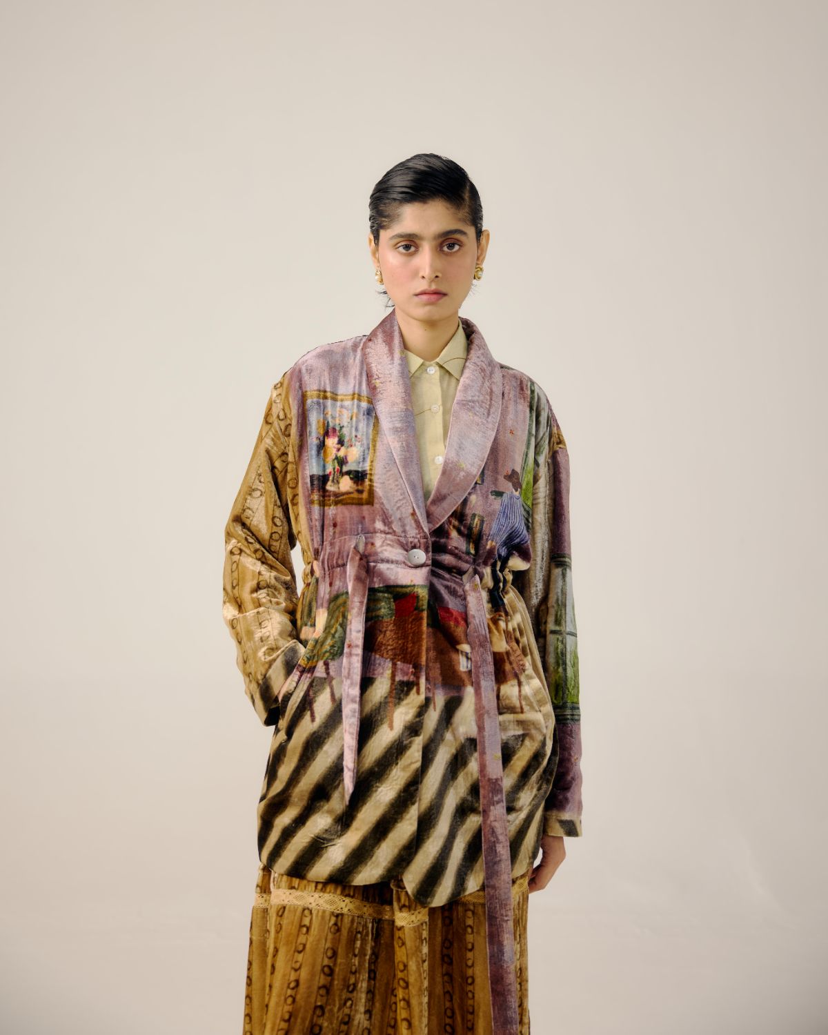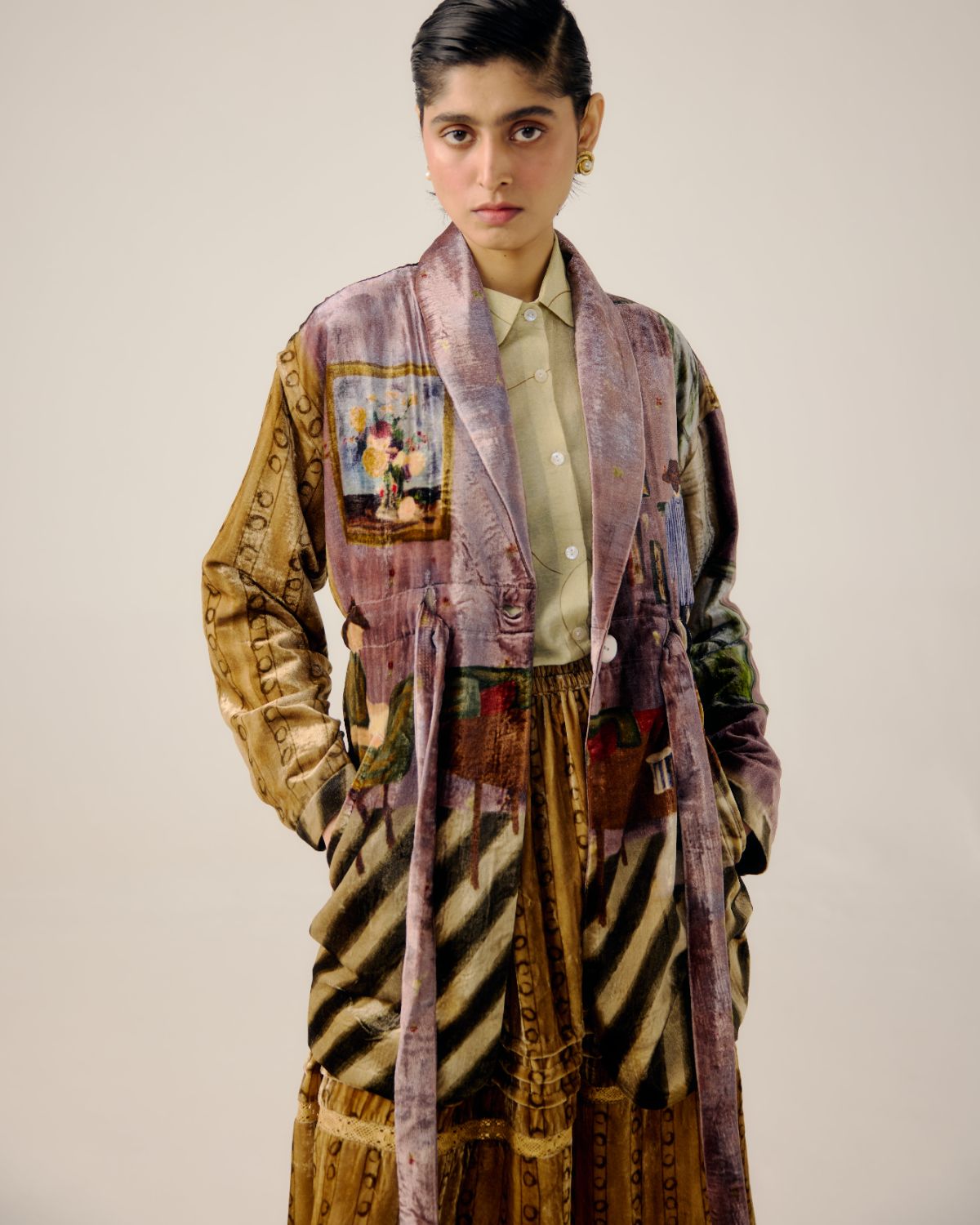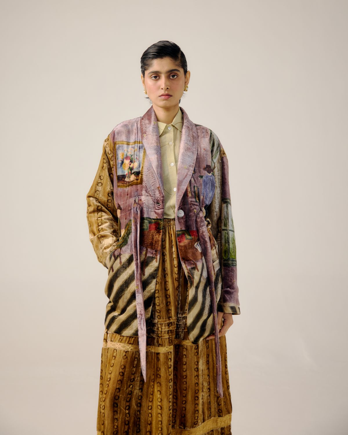 CORD blurs the line between art and attire in a way few labels dare to. Here, fabrics become canvases; illustrations—drawn by hand, steeped in imagination—flow across silhouettes that feel sculptural yet deeply wearable. Each piece has a texture of memory to it, as if it carries echoes of a past life, now reframed for a contemporary world.