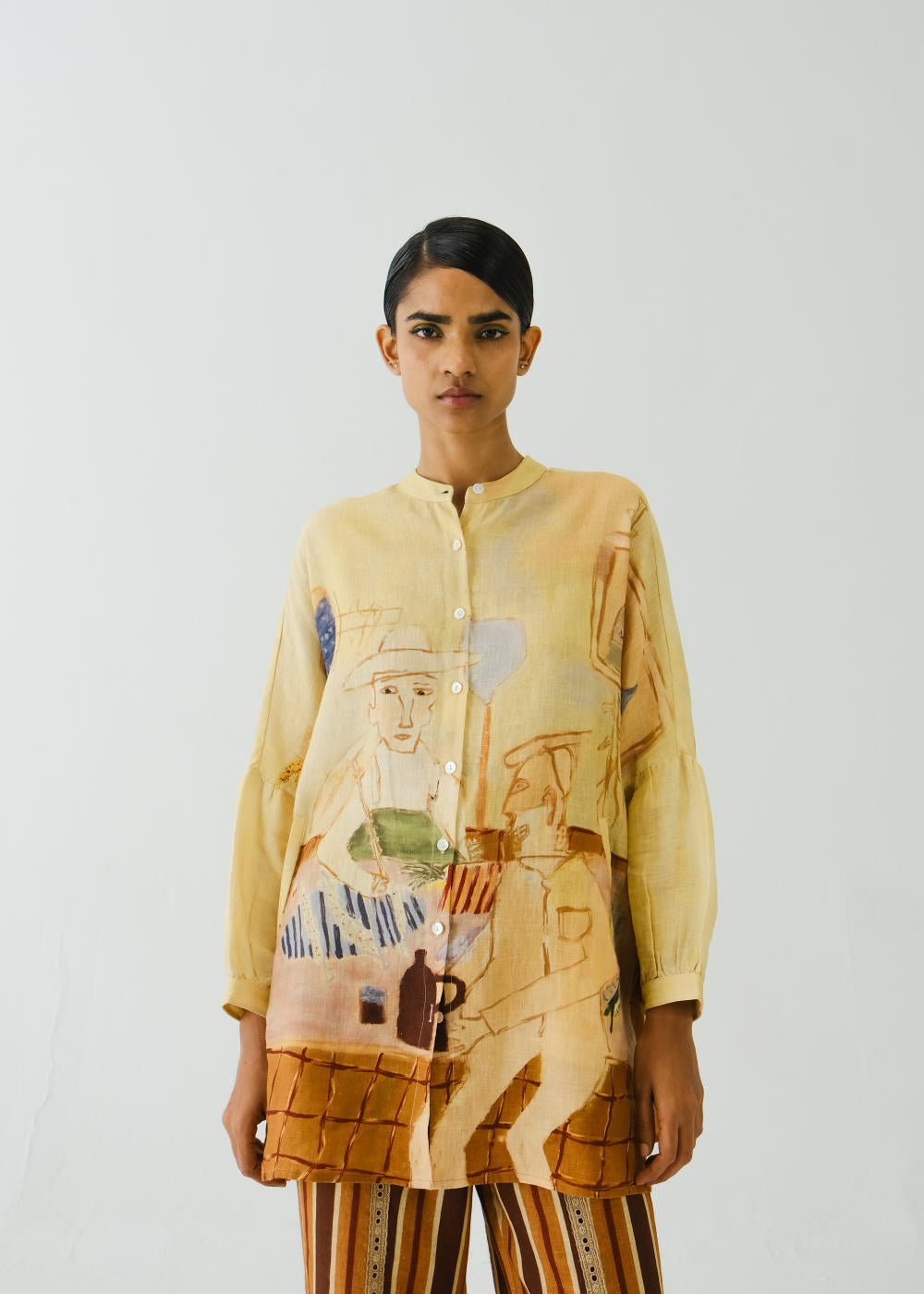 We are talking comfort with a hint of eternal style in Linen when it comes to the Mia Shirt. With full sleeves, the shirt features round-flat shirt collars and a front opening. The organic nature of the fabric promises breathability and falls light on the body naturally