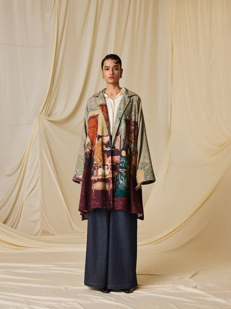 The easy fit of this overcoat, adorned in our exquisite high tea print, ensures both style and comfort. With a front button-up concealed placket, flat collar, and side slits, it combines classic elements with a contemporary flair. Embrace the fusion of style and art as you drape yourself in this statement piece, a harmonious blend of functionality and aesthetic appeal.
