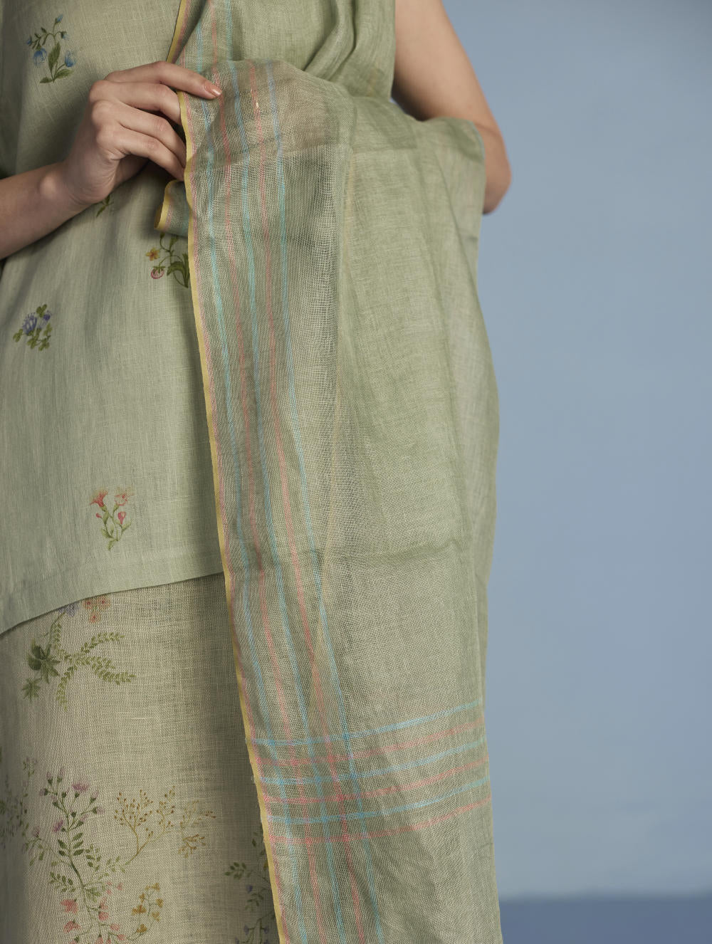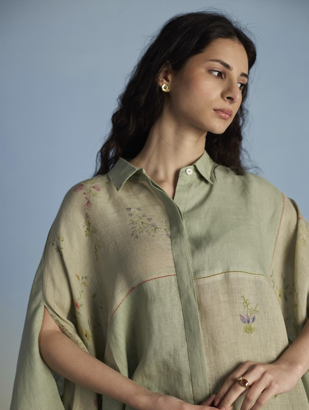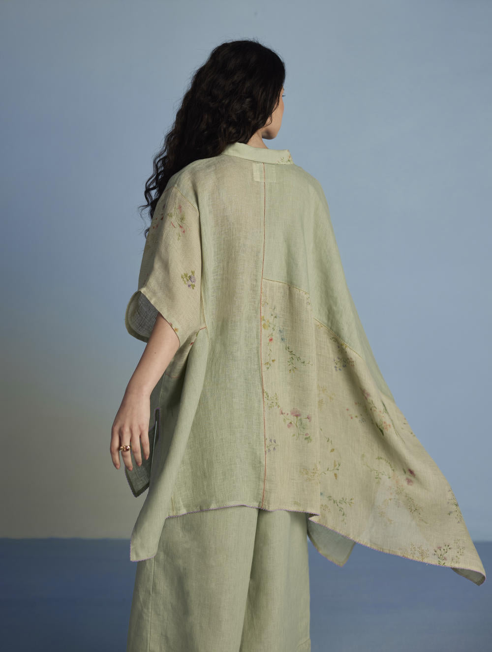 A contemporary take on a kaftan shirt crafted by patching soft yarn-dyed linen and printed sheer linen; featuring hand-illustrated delicate floral prints on the sheer panels and joined with vibrant, multi-colored intricate fagotting thread details. The statement oversized shirt pairs beautifully and easily with our linen pants. It is finished with pop-coloured intricate picoting detail at the hem.